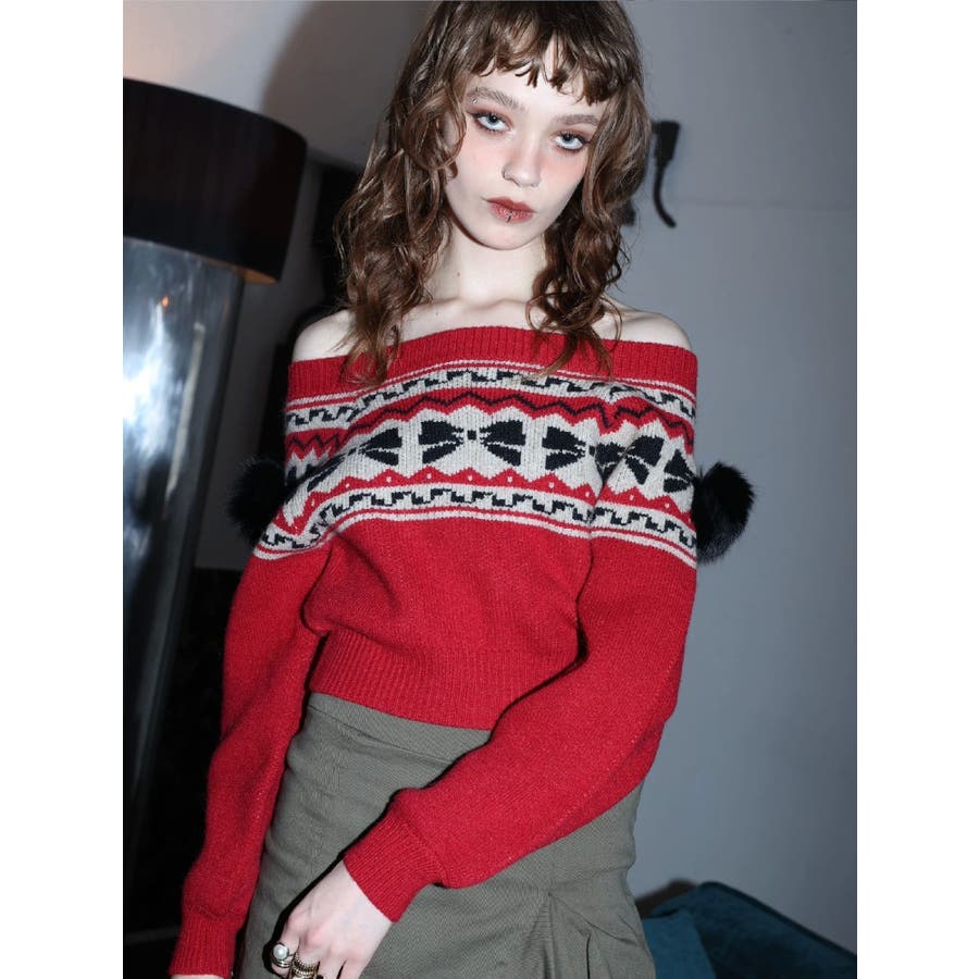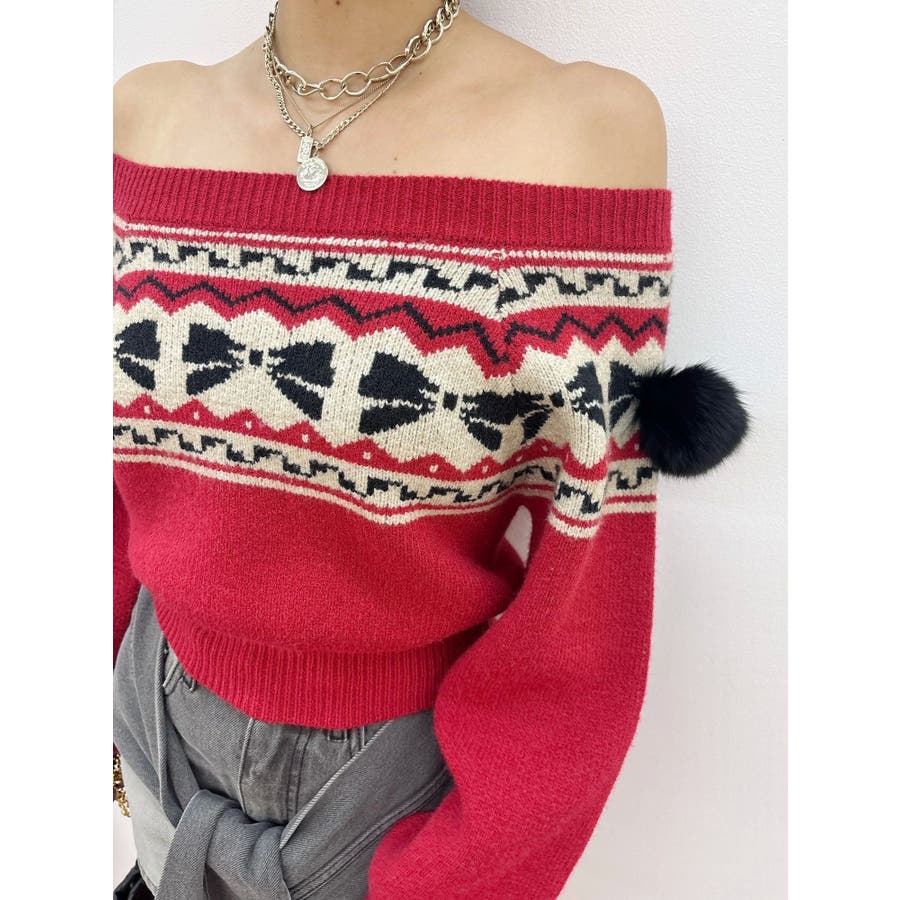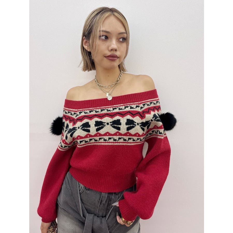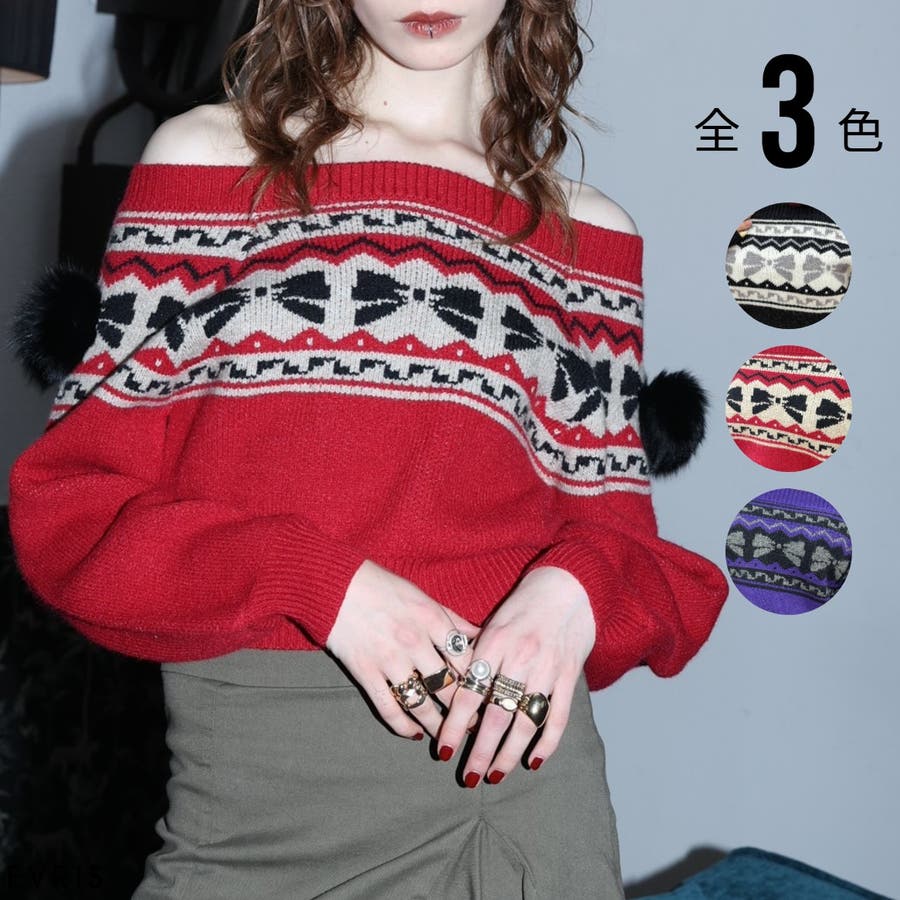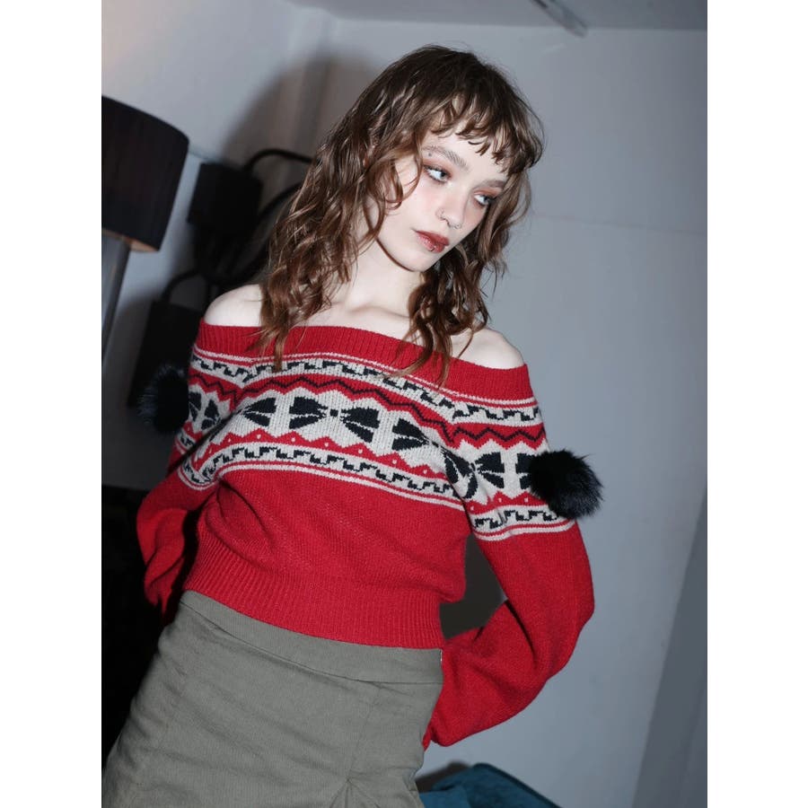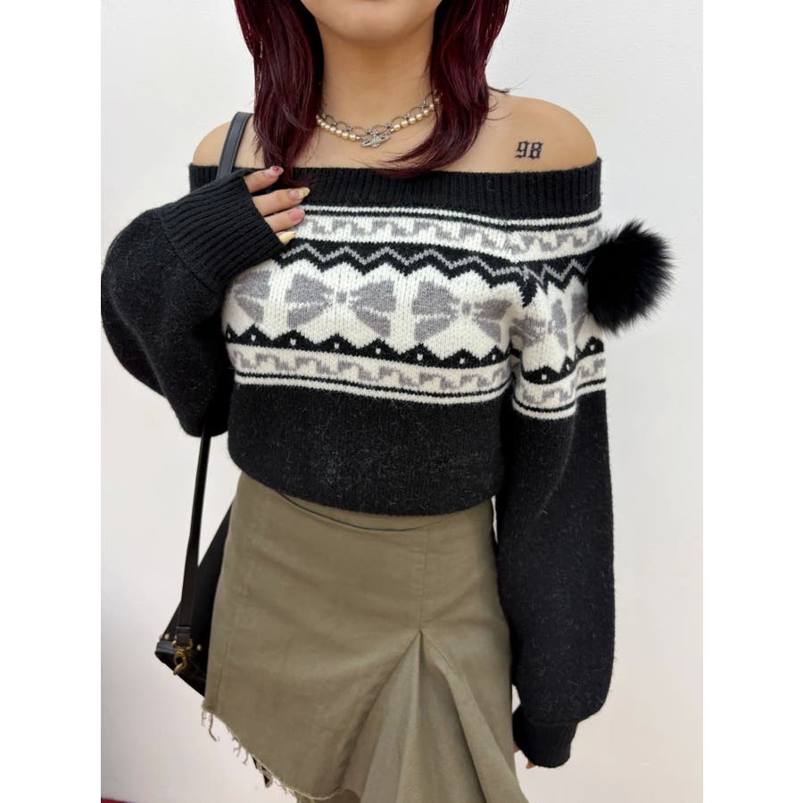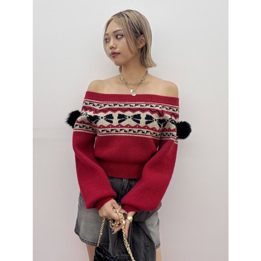 ジャガード柄と肩部分のポンポンがポイントのオフショルニットです。ニット全面のジャガード柄はオリジナルで作成したグラフィックになっており、トレンドモチーフのリボン柄がポイントです。配色を他にはないEVRIS(エヴリス)らしい組み合わせにしており1枚でスタイリングの主役になるようなニットです。