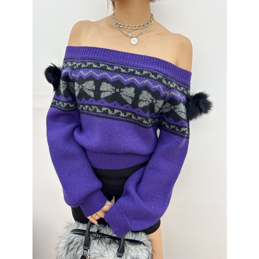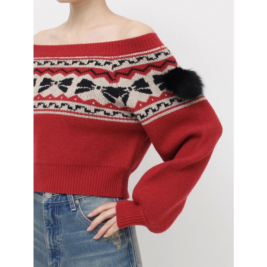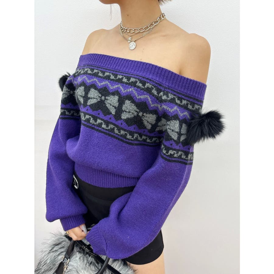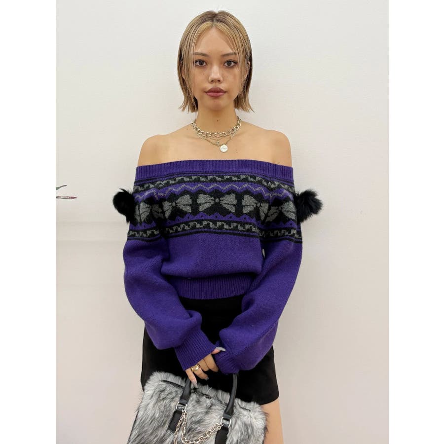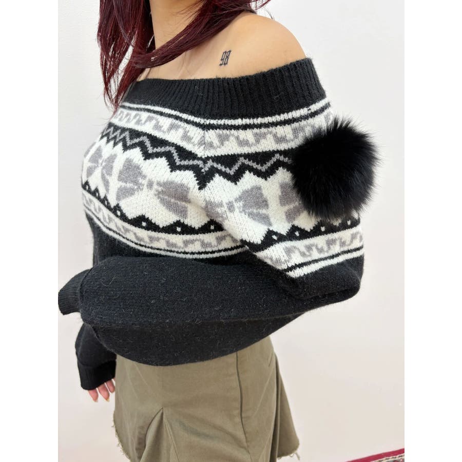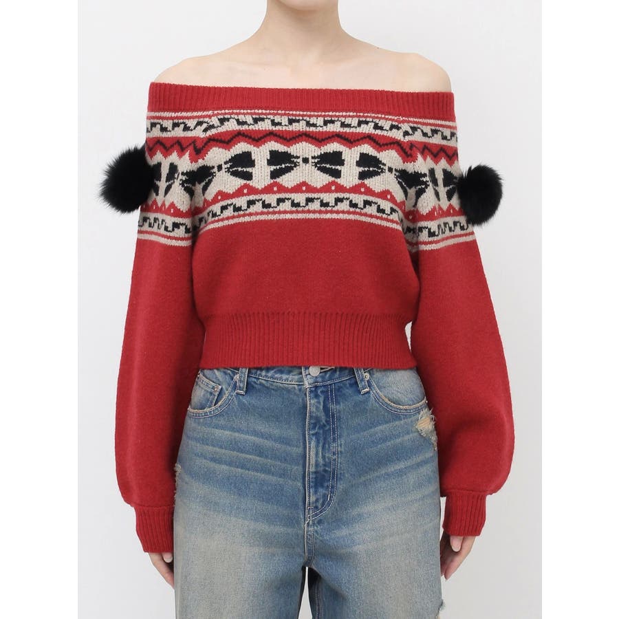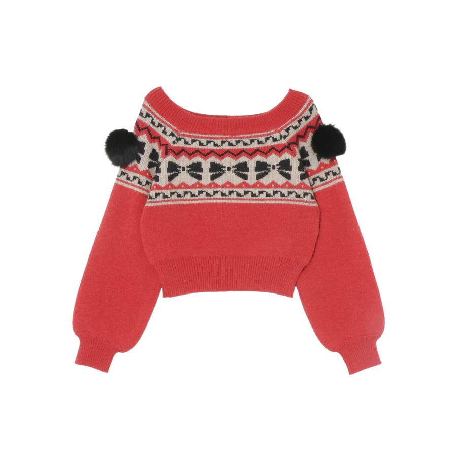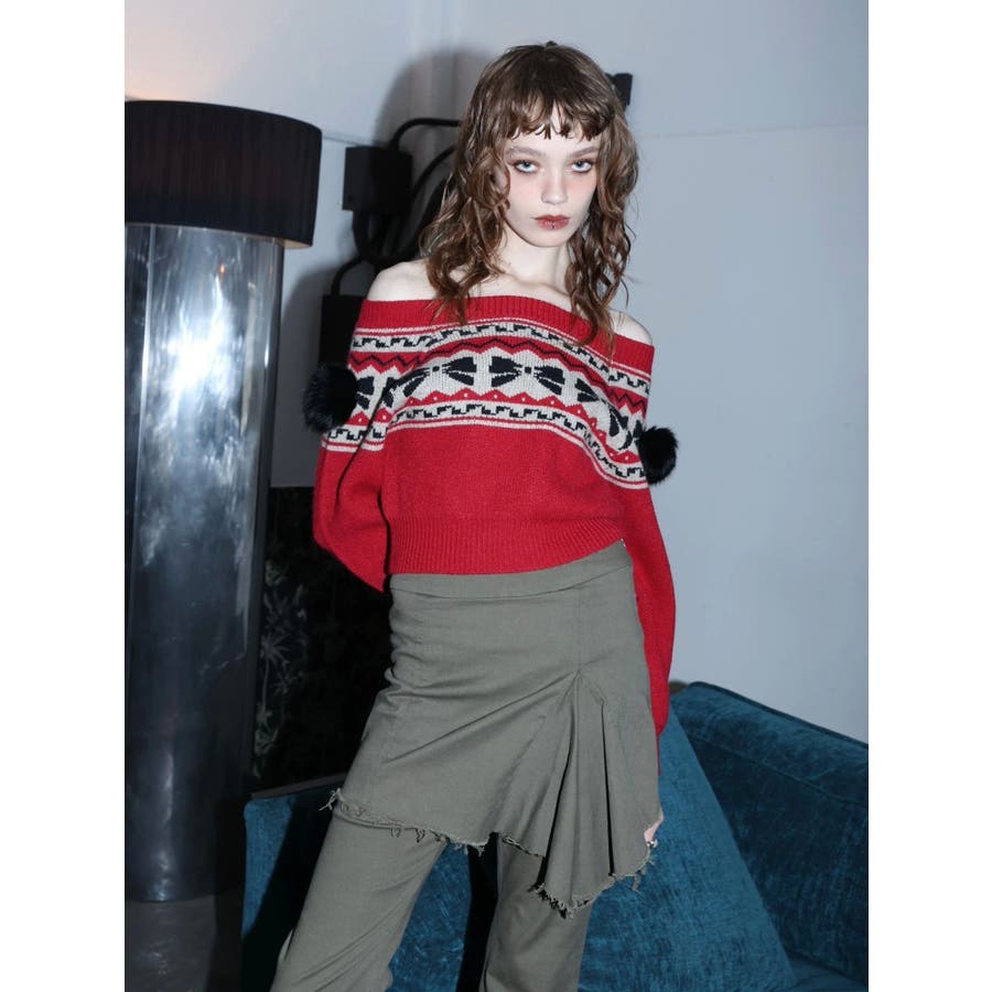 ジャガード柄と肩部分のポンポンがポイントのオフショルニットです。ニット全面のジャガード柄はオリジナルで作成したグラフィックになっており、トレンドモチーフのリボン柄がポイントです。配色を他にはないEVRIS(エヴリス)らしい組み合わせにしており1枚でスタイリングの主役になるようなニットです。