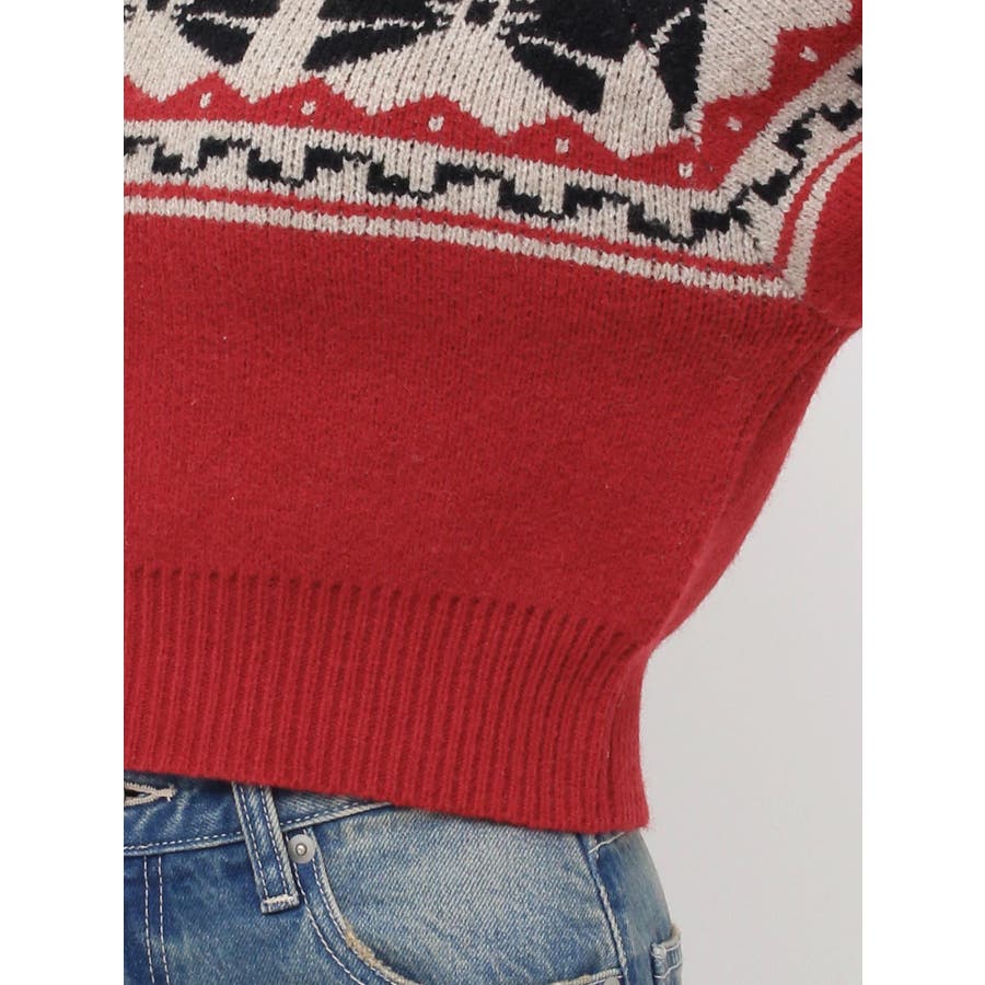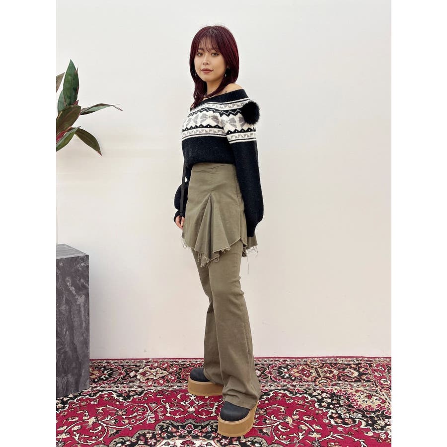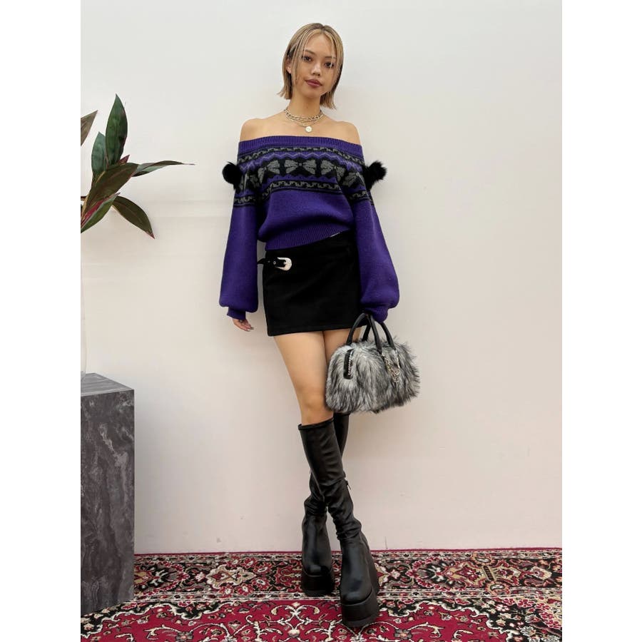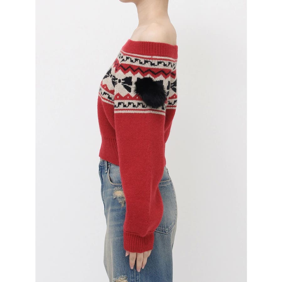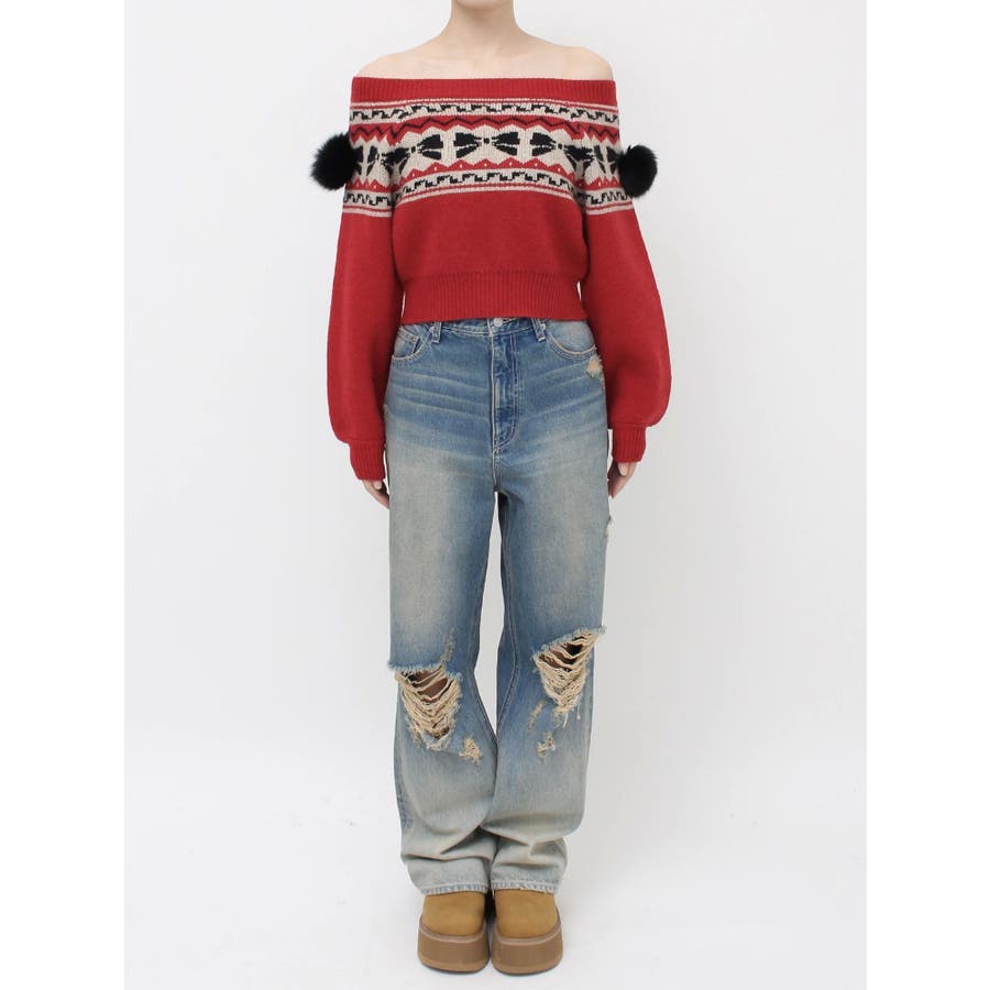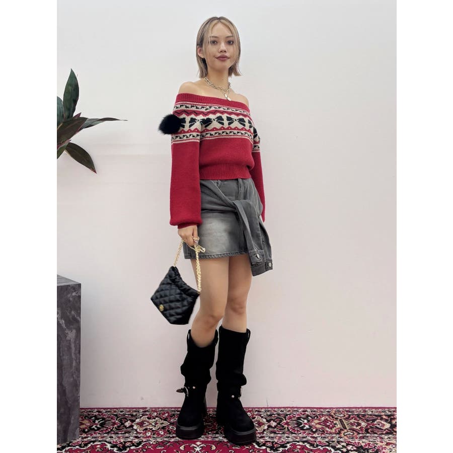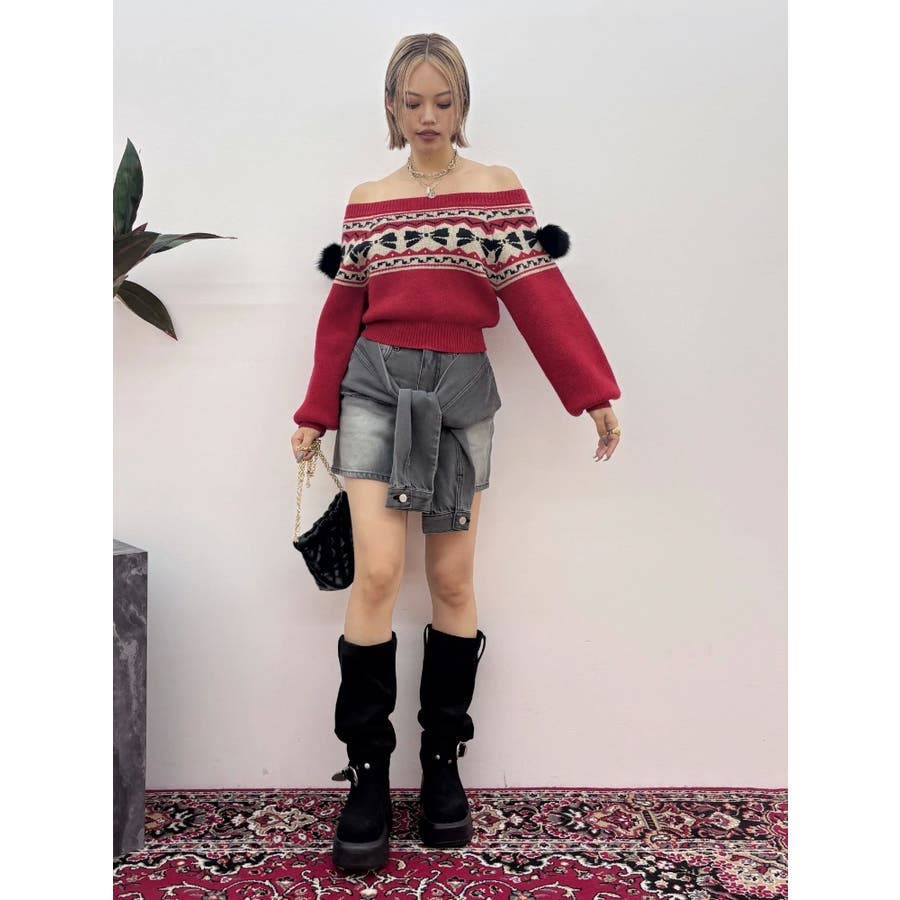 ジャガード柄と肩部分のポンポンがポイントのオフショルニットです。ニット全面のジャガード柄はオリジナルで作成したグラフィックになっており、トレンドモチーフのリボン柄がポイントです。配色を他にはないEVRIS(エヴリス)らしい組み合わせにしており1枚でスタイリングの主役になるようなニットです。