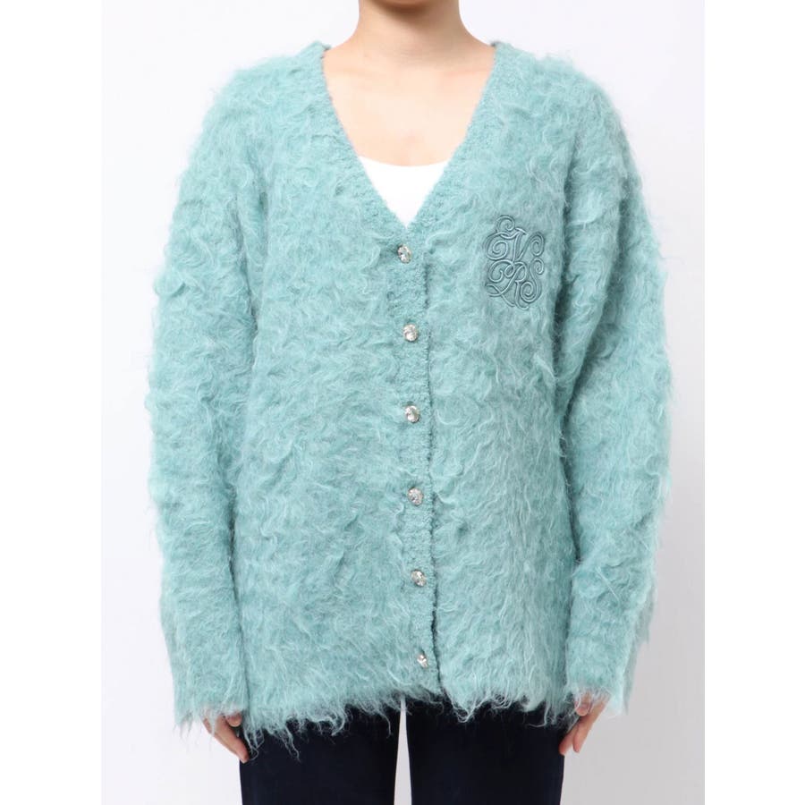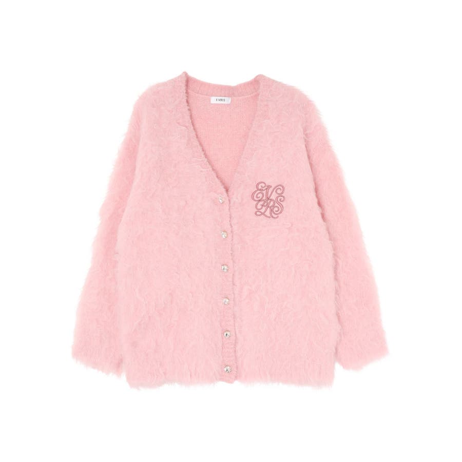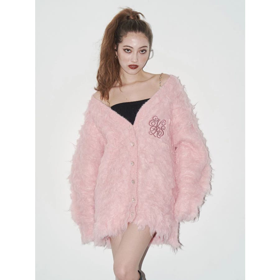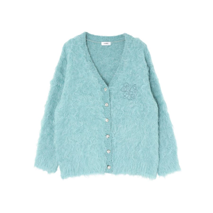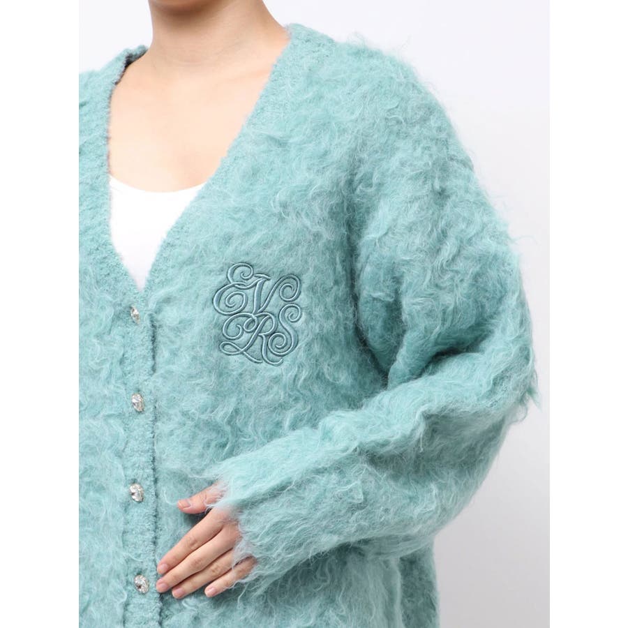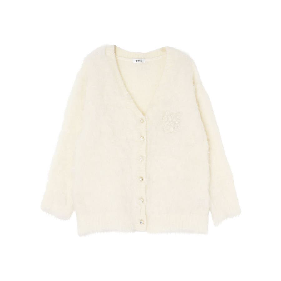 ■デザインソフトタッチな毛足の長いシャギーニットのカーディガン。ふわっとした柔らかな素材で着心地の良い1枚です。キラキラ光るビジューボタンに胸元のEVRIS(エヴリス)ロゴの刺繍が目を引くアイテム。■スタイリング デニムやミニボトムなどボトムを選ばず着れる優秀アイテム。 ヒップまで隠れる丈感で、ワンピース風に1枚での着用も◎ -------------- 透け感:なし 裏地:なし 生地の厚み:厚め伸縮性:あり--------------