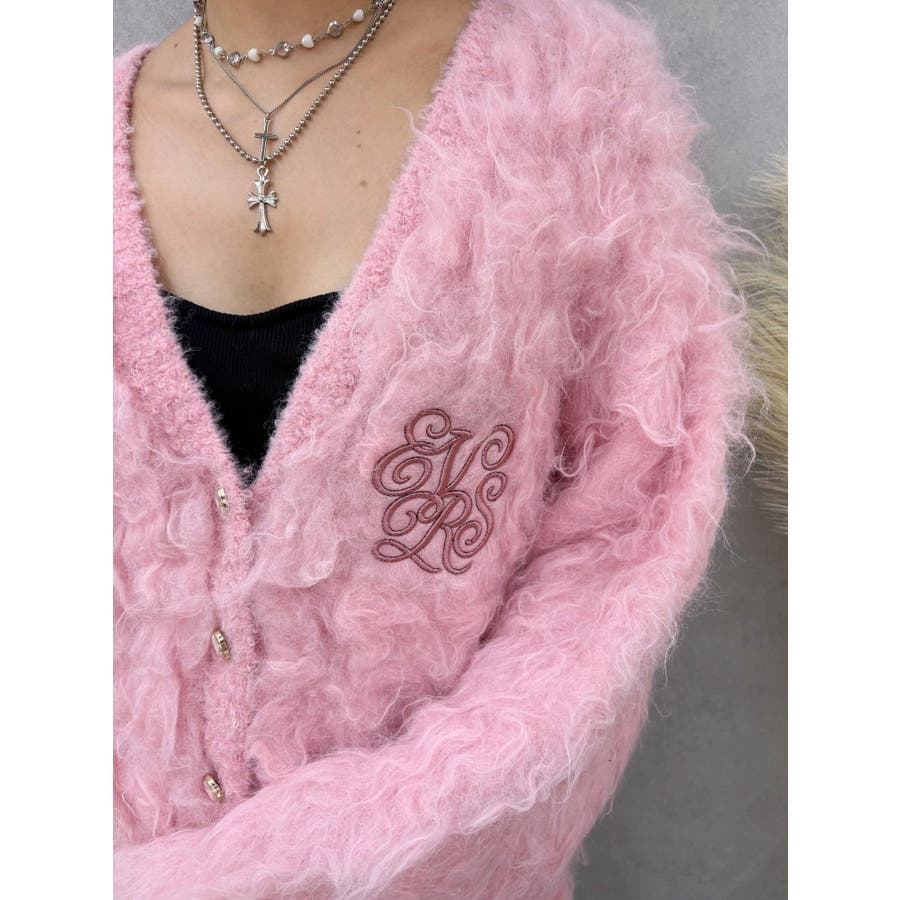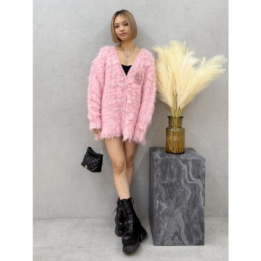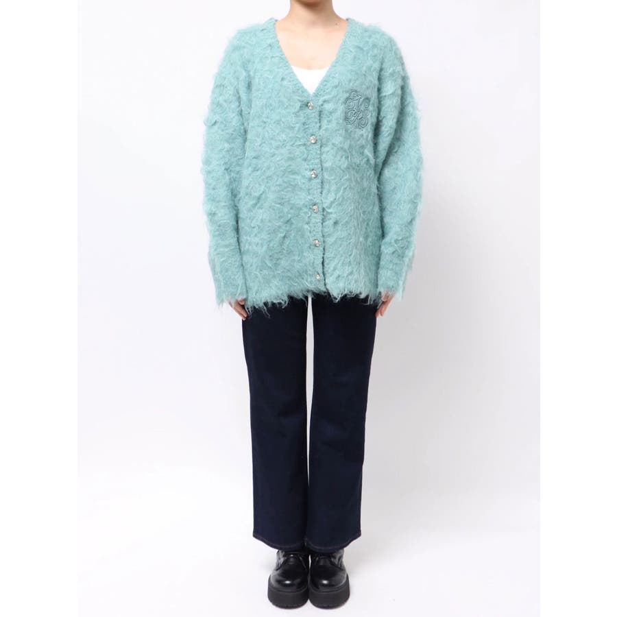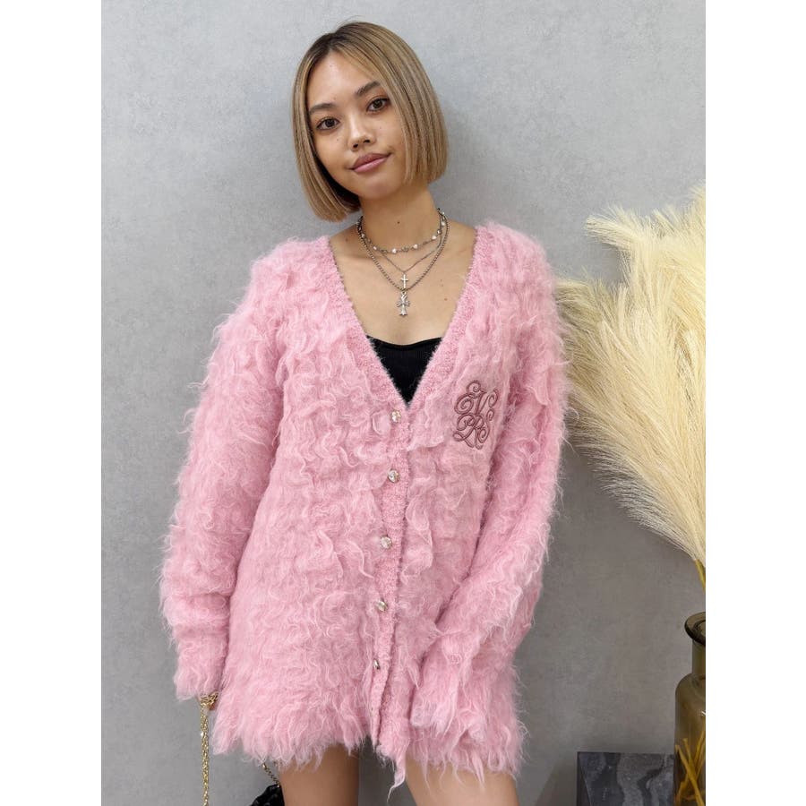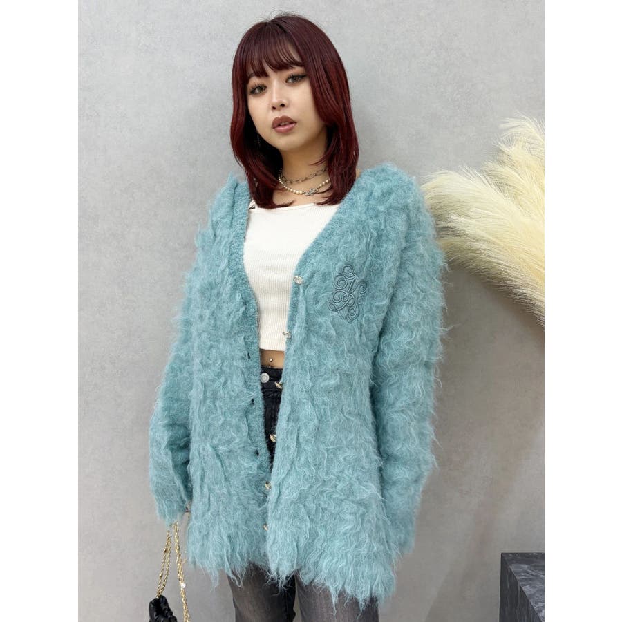 ■デザインソフトタッチな毛足の長いシャギーニットのカーディガン。ふわっとした柔らかな素材で着心地の良い1枚です。キラキラ光るビジューボタンに胸元のEVRIS(エヴリス)ロゴの刺繍が目を引くアイテム。■スタイリング デニムやミニボトムなどボトムを選ばず着れる優秀アイテム。 ヒップまで隠れる丈感で、ワンピース風に1枚での着用も◎ -------------- 透け感:なし 裏地:なし 生地の厚み:厚め伸縮性:あり--------------