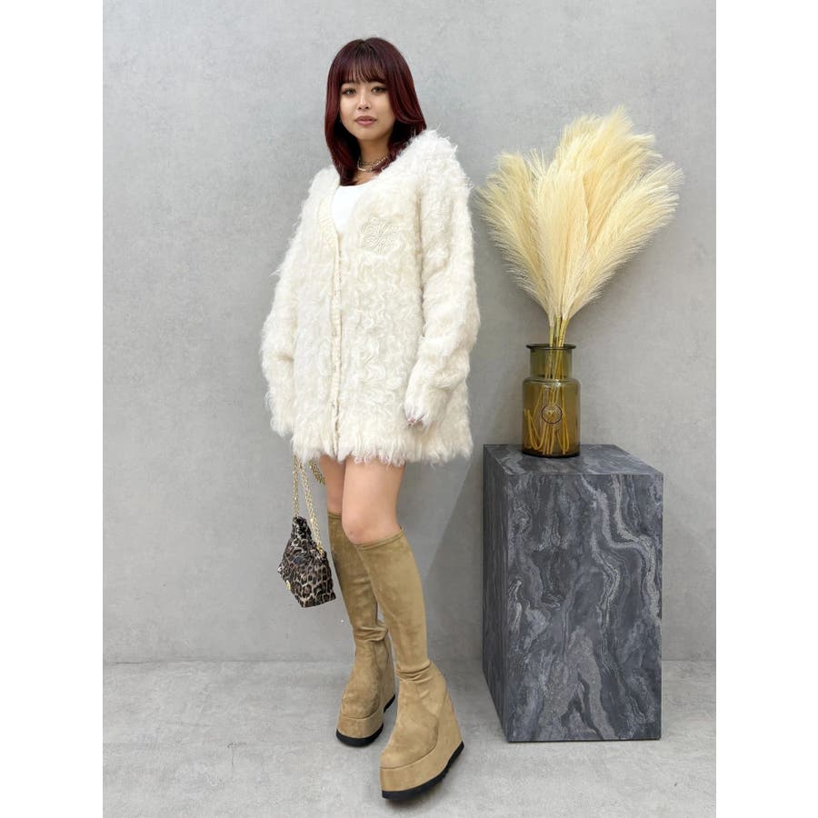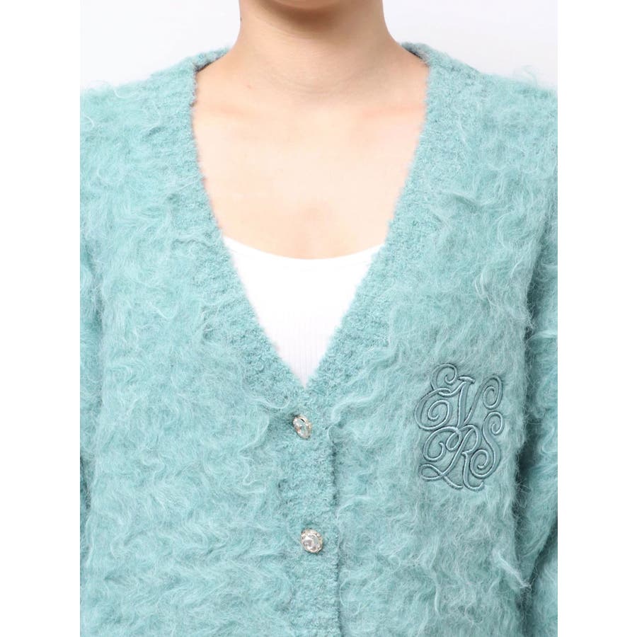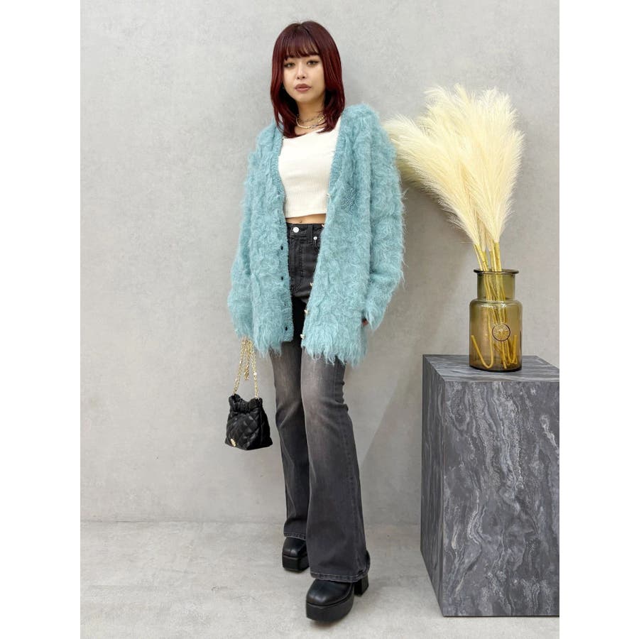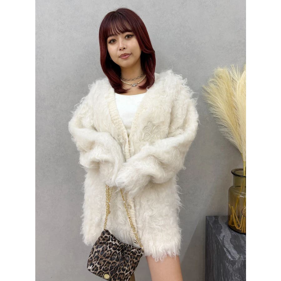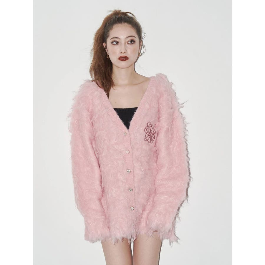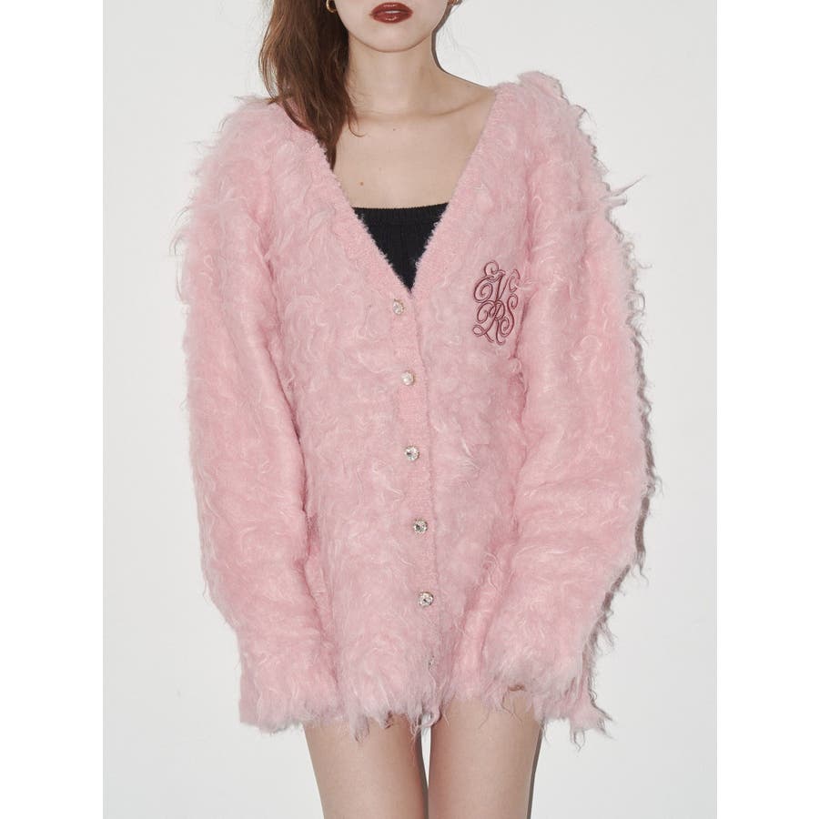 ■デザインソフトタッチな毛足の長いシャギーニットのカーディガン。ふわっとした柔らかな素材で着心地の良い1枚です。キラキラ光るビジューボタンに胸元のEVRIS(エヴリス)ロゴの刺繍が目を引くアイテム。■スタイリング デニムやミニボトムなどボトムを選ばず着れる優秀アイテム。 ヒップまで隠れる丈感で、ワンピース風に1枚での着用も◎ -------------- 透け感:なし 裏地:なし 生地の厚み:厚め伸縮性:あり--------------