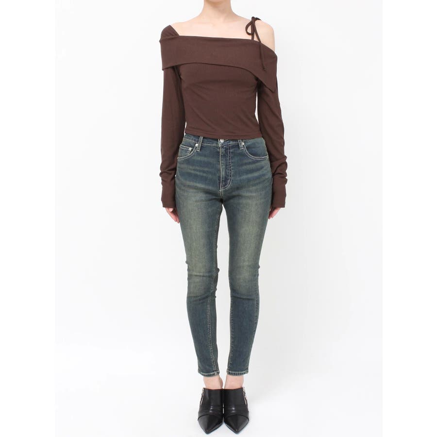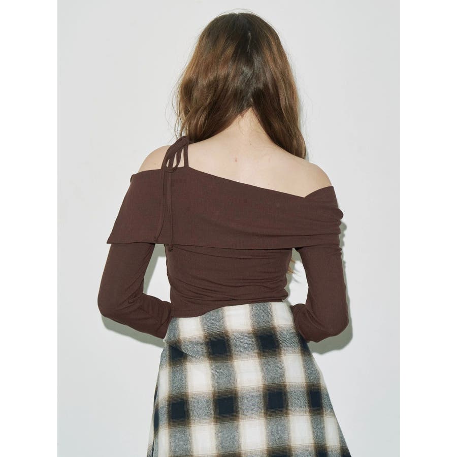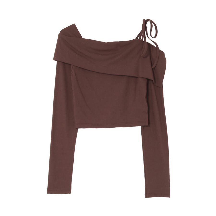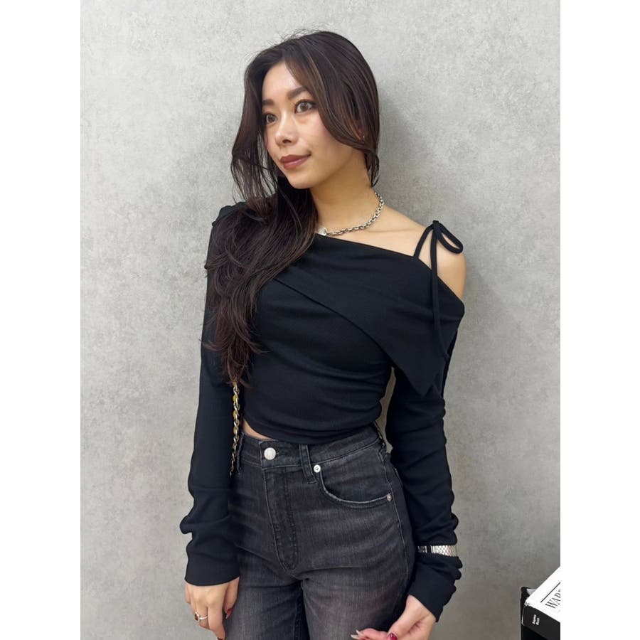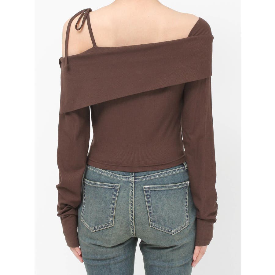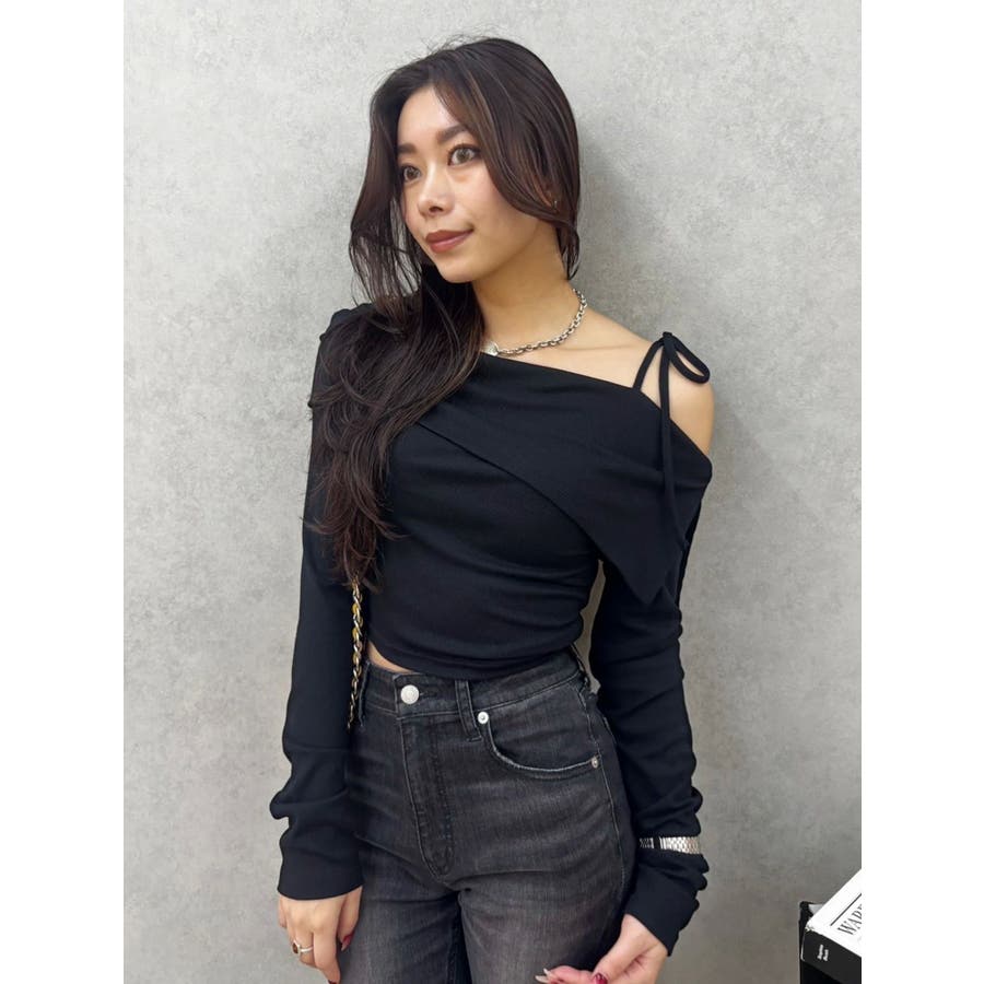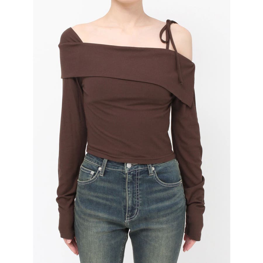 トレンドのワンショルダーデザインのリブトップスです。落ち感のある柔らかいリブを使用し着心地のいいデザイントップスとなっています。コンパクトなシルエットでワイドボトムのスタイリングがおすすめとなっています。