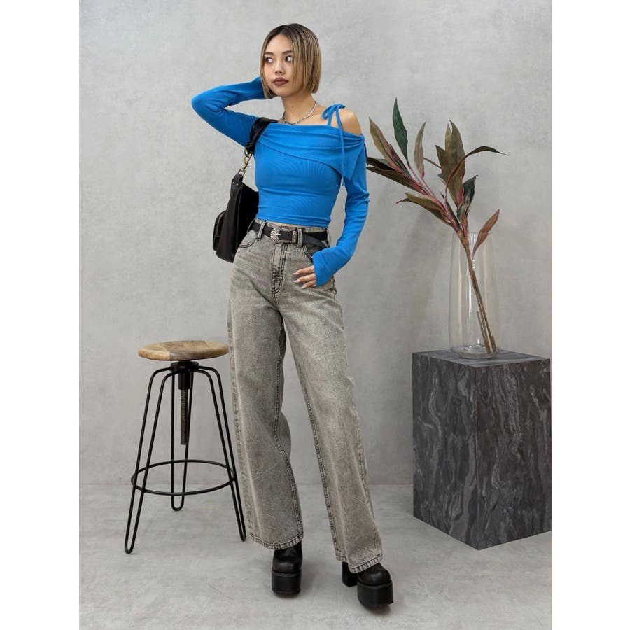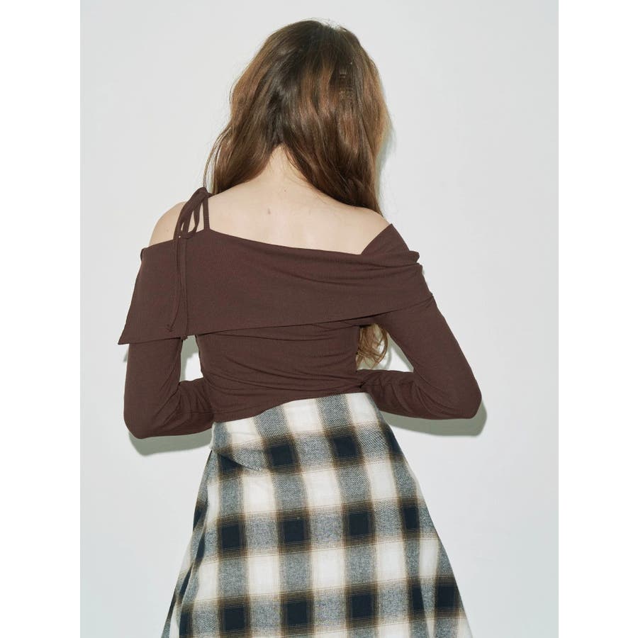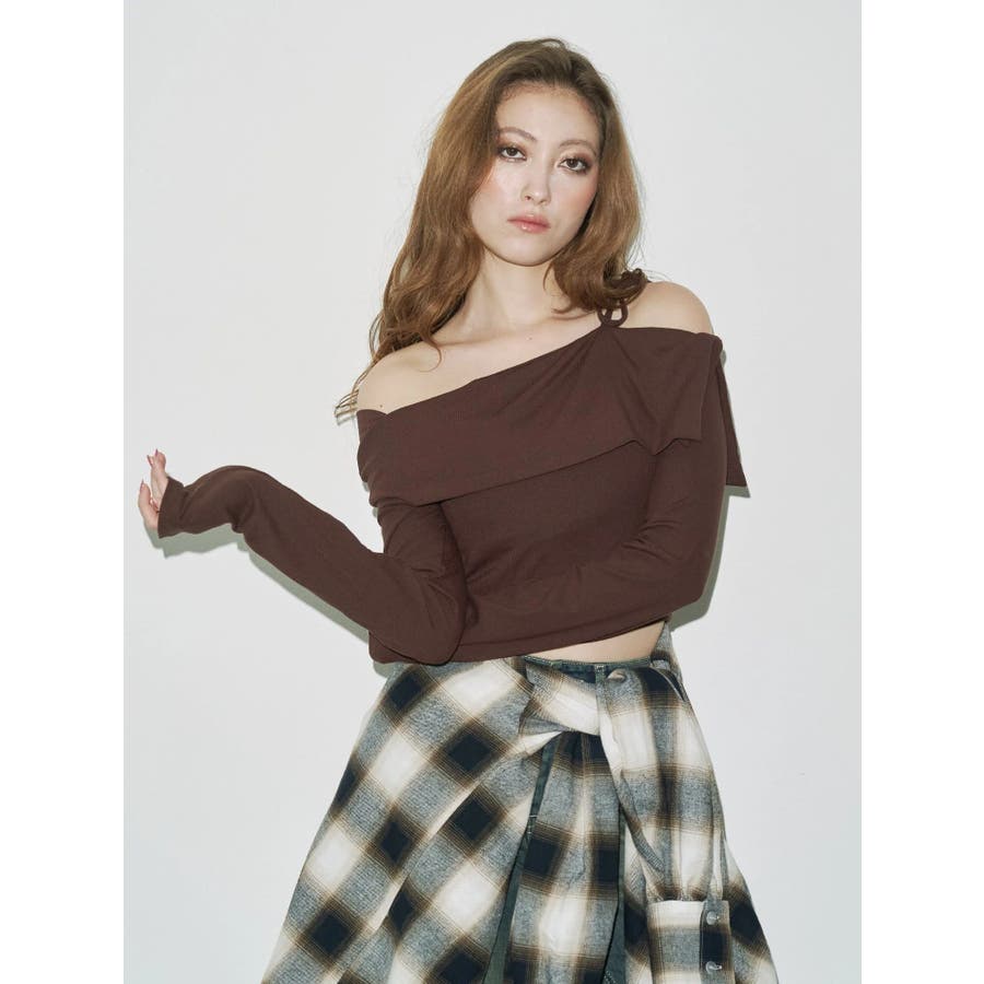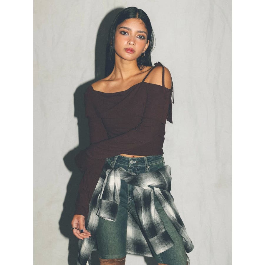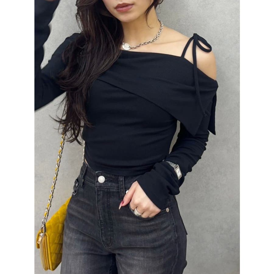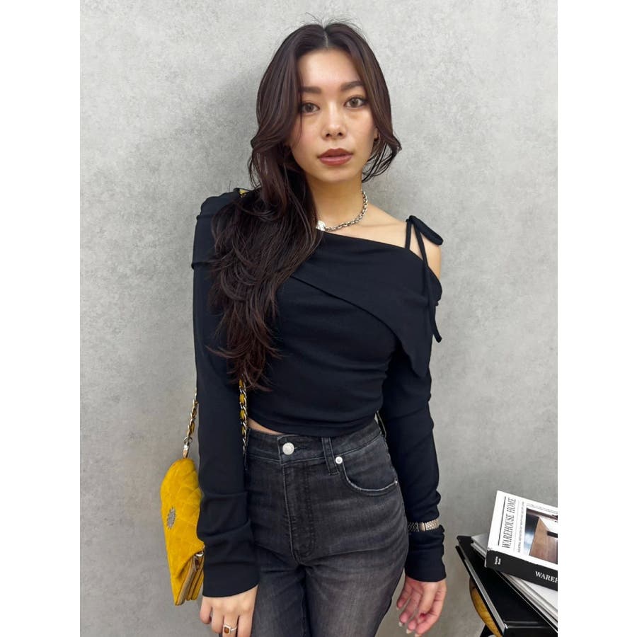トレンドのワンショルダーデザインのリブトップスです。落ち感のある柔らかいリブを使用し着心地のいいデザイントップスとなっています。コンパクトなシルエットでワイドボトムのスタイリングがおすすめとなっています。