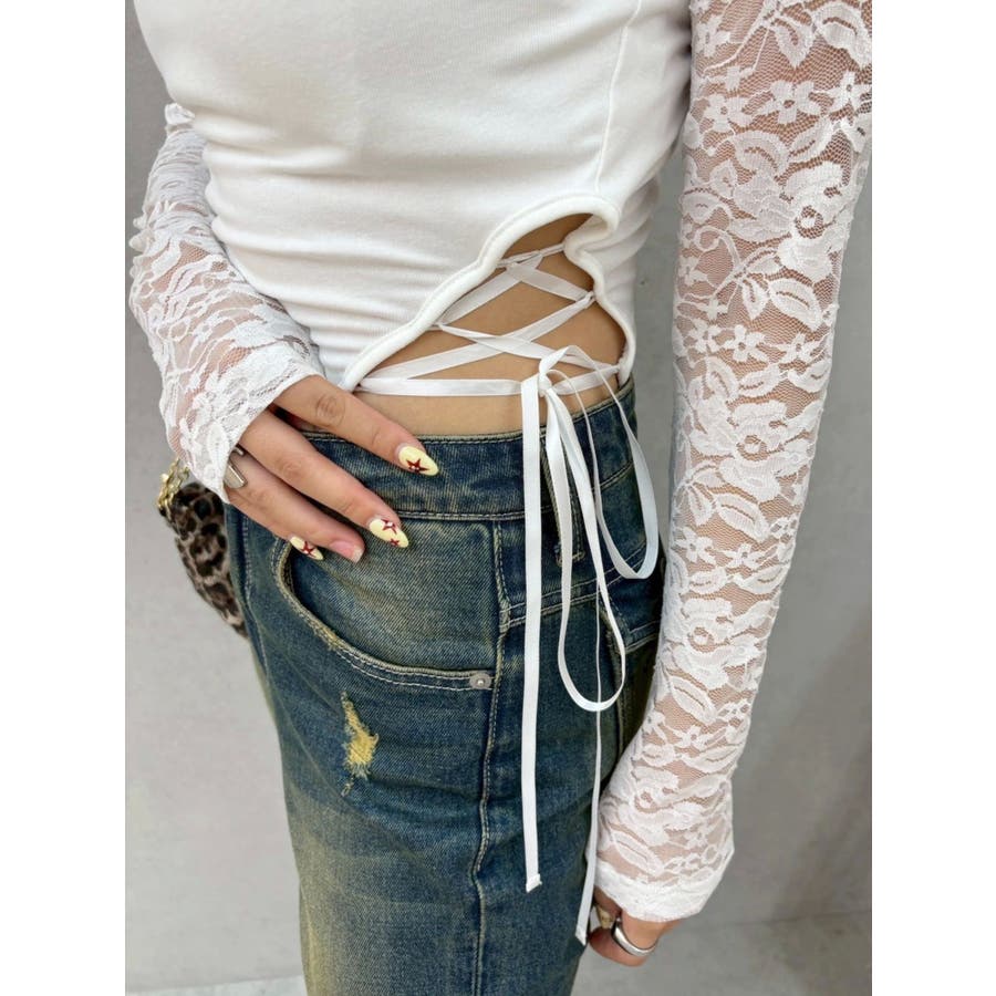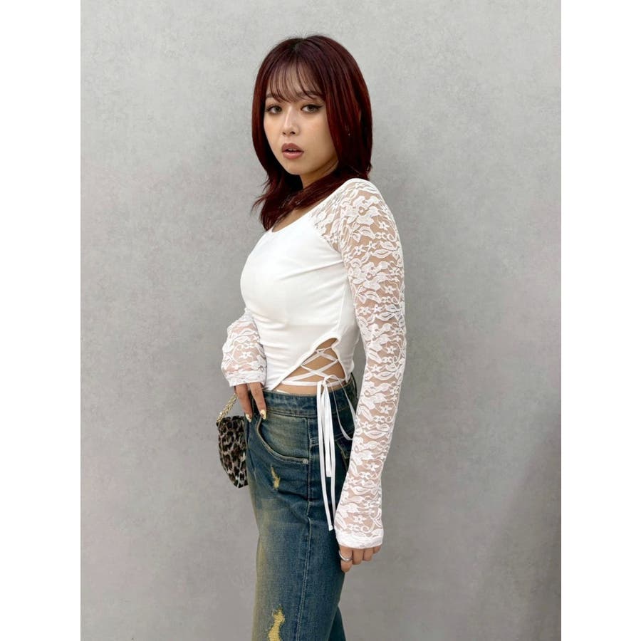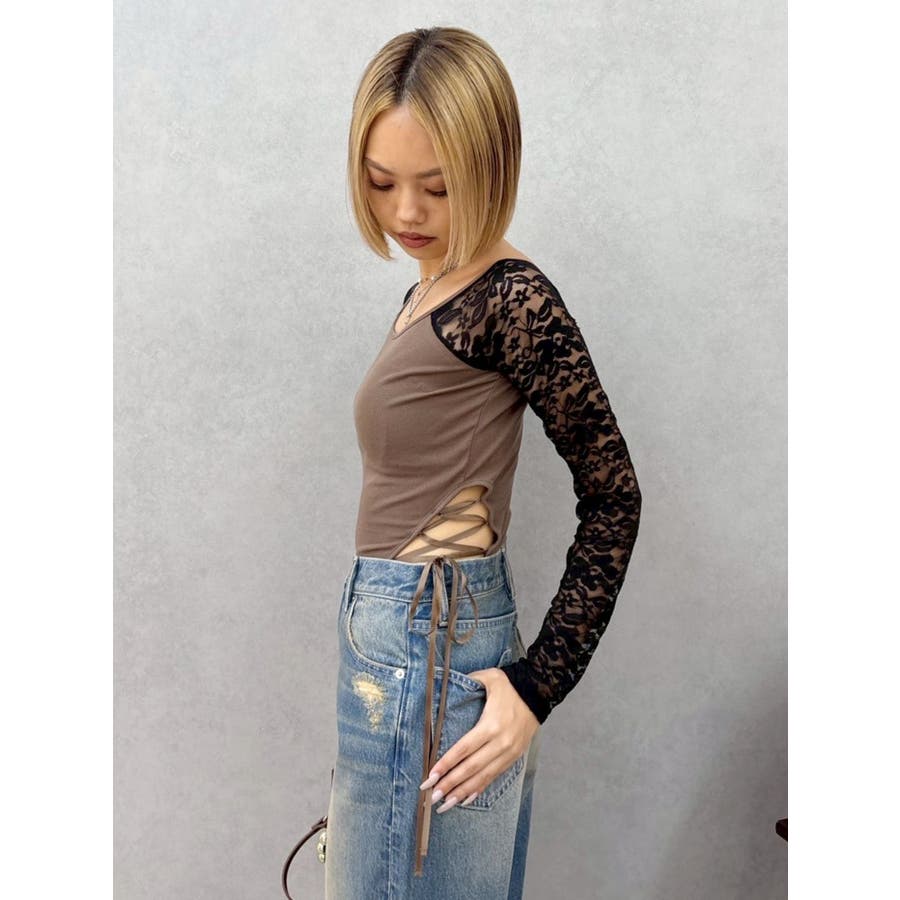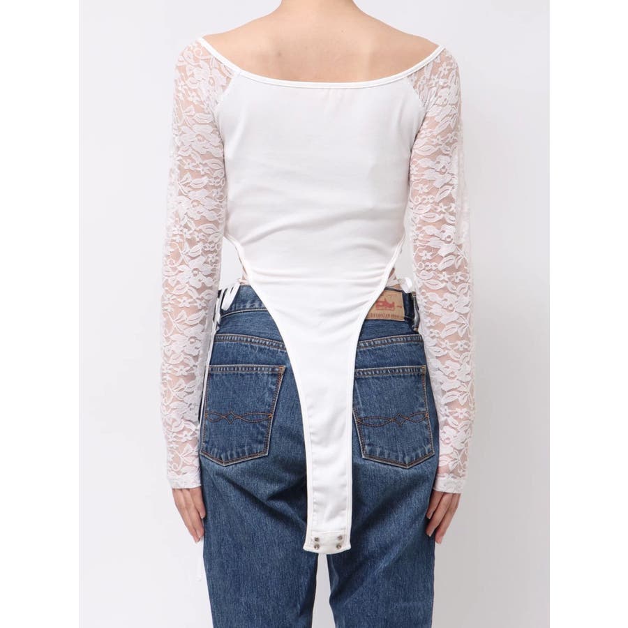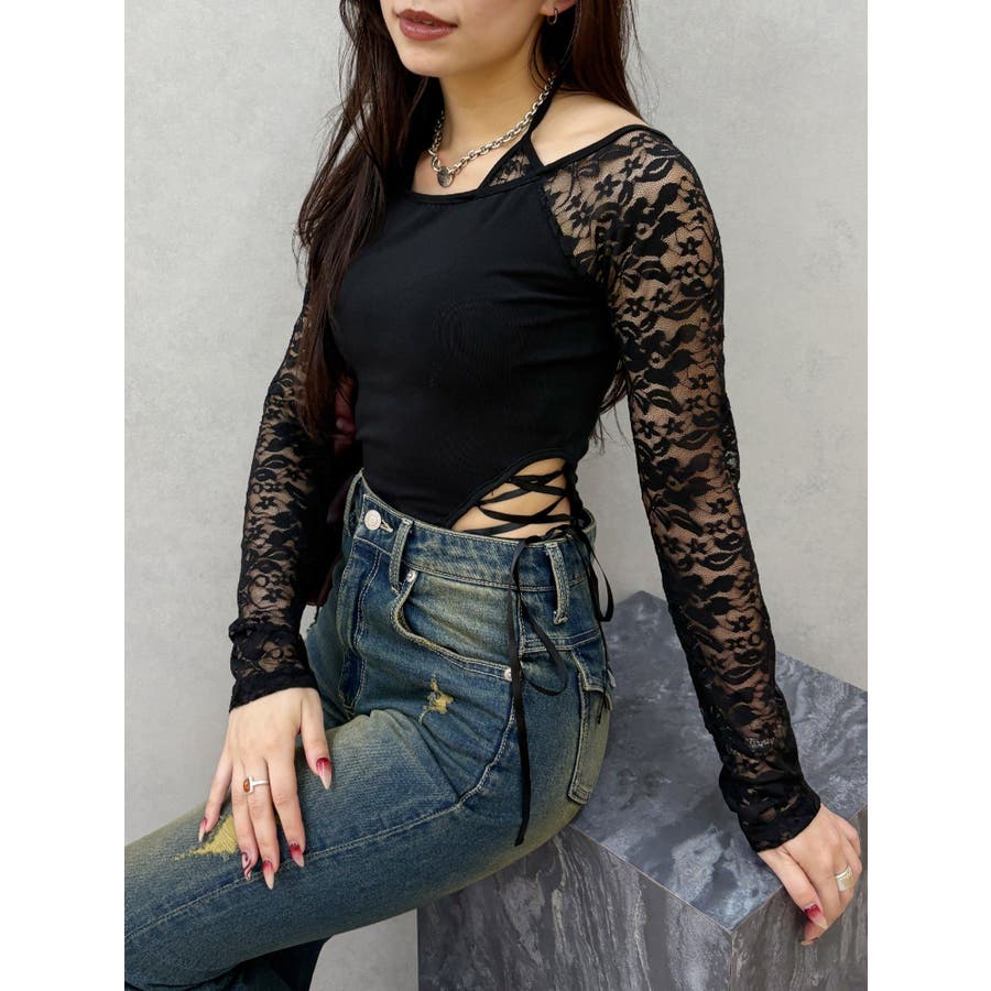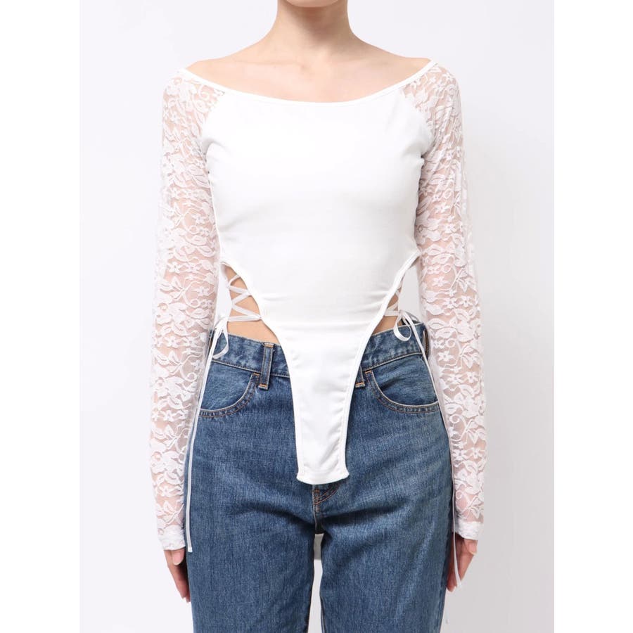 ■デザインレース素材やサイドのプレゼントリボンを使用した今季のトレンドが詰まったインパクトのあるボディースーツです。 サイドのレース部分は調節可能になっており、着脱しやすくなっております。 腕は総レースで透け感があったりと女性らしいセクシーなデザインですが見頃はカットソー素材なので抵抗なく着やすいアイテムです。■スタイリングデニムやスウェットと合わせたカジュアルなスタイリングがオススメです。