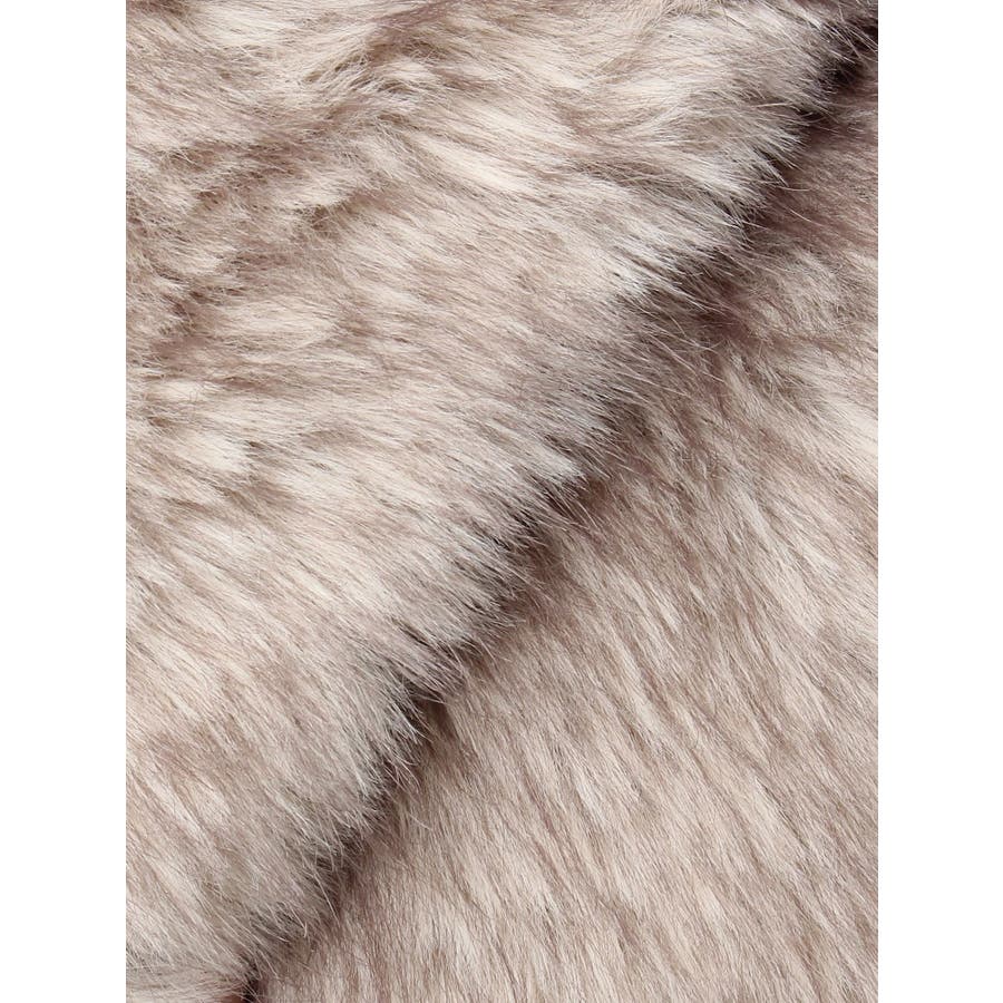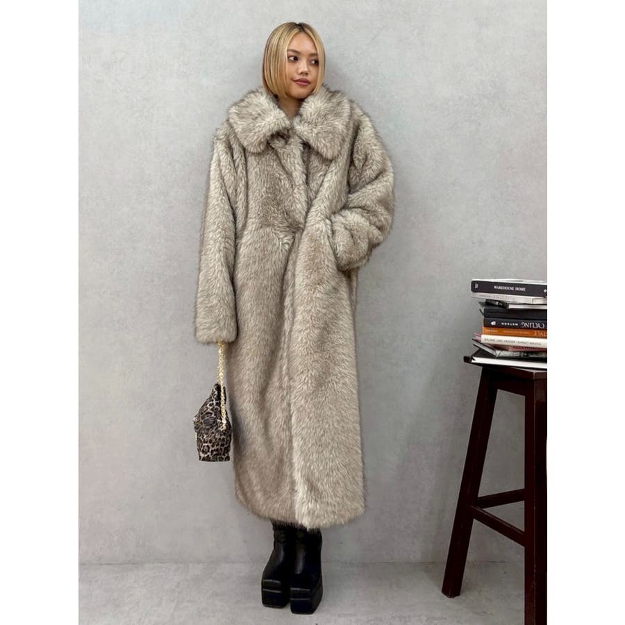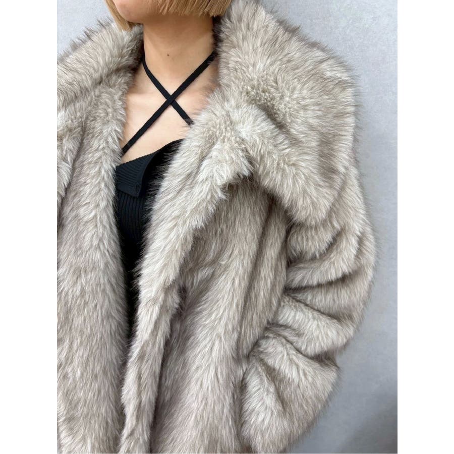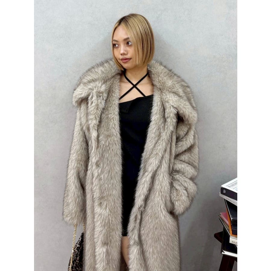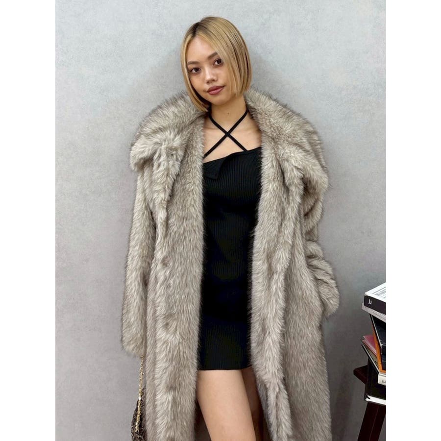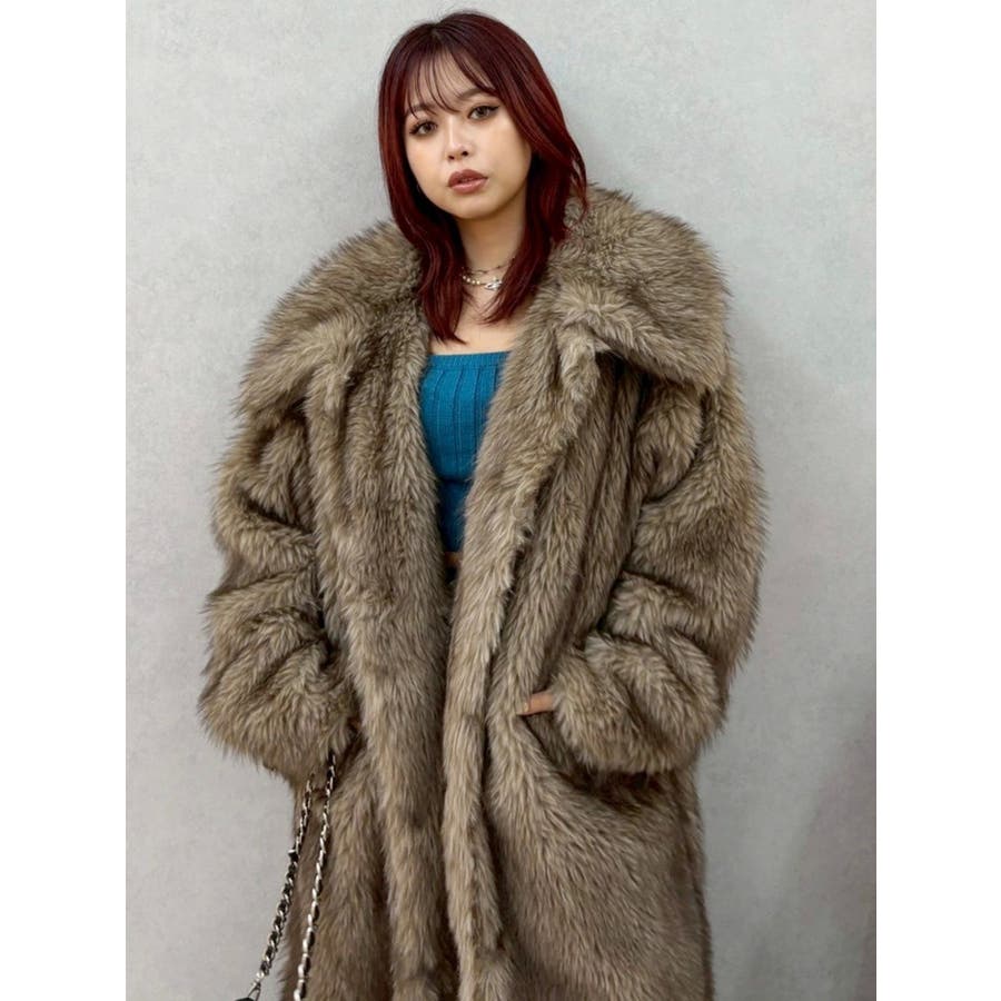 毛先にカラーが付いており、リアルなファー感が特徴のフェイクファーロングコートです。かなりボリューム感があり、ゴージャスな印象を与えてくれます。ボリューム感があるので、タイトなワンピースやカジュアルなデニム合わせがオススメです。衿も大きくしており、閉めて着用するとマフラー代わりにもなり暖かいアウターです。