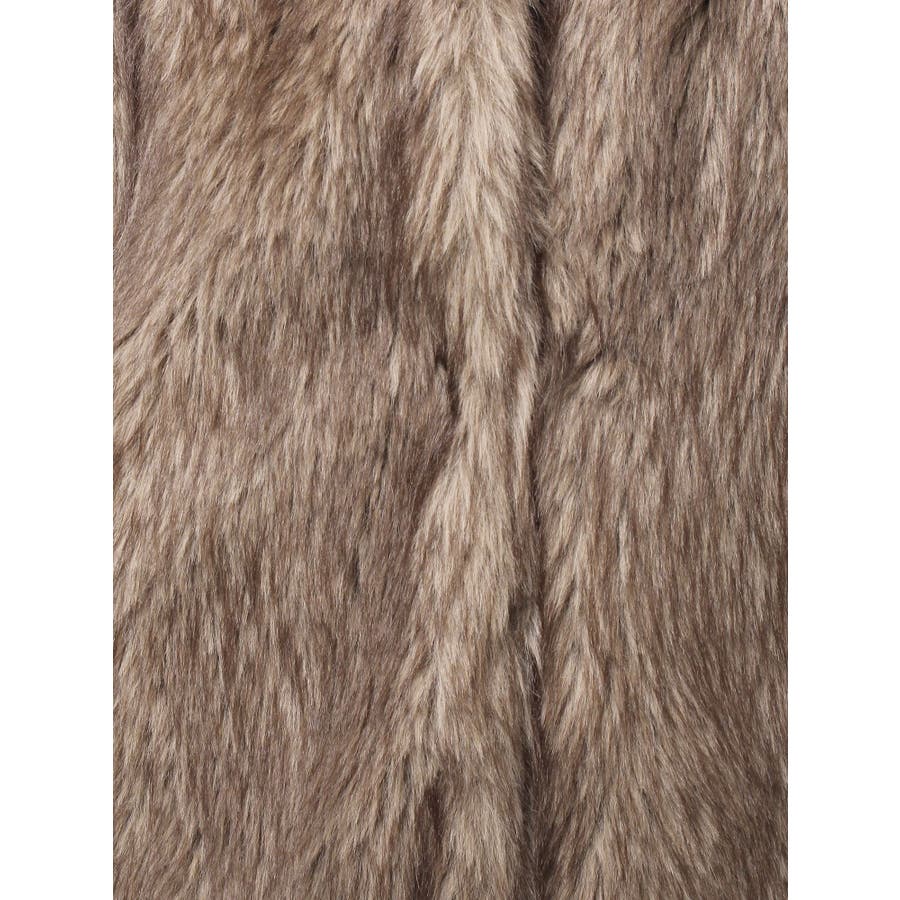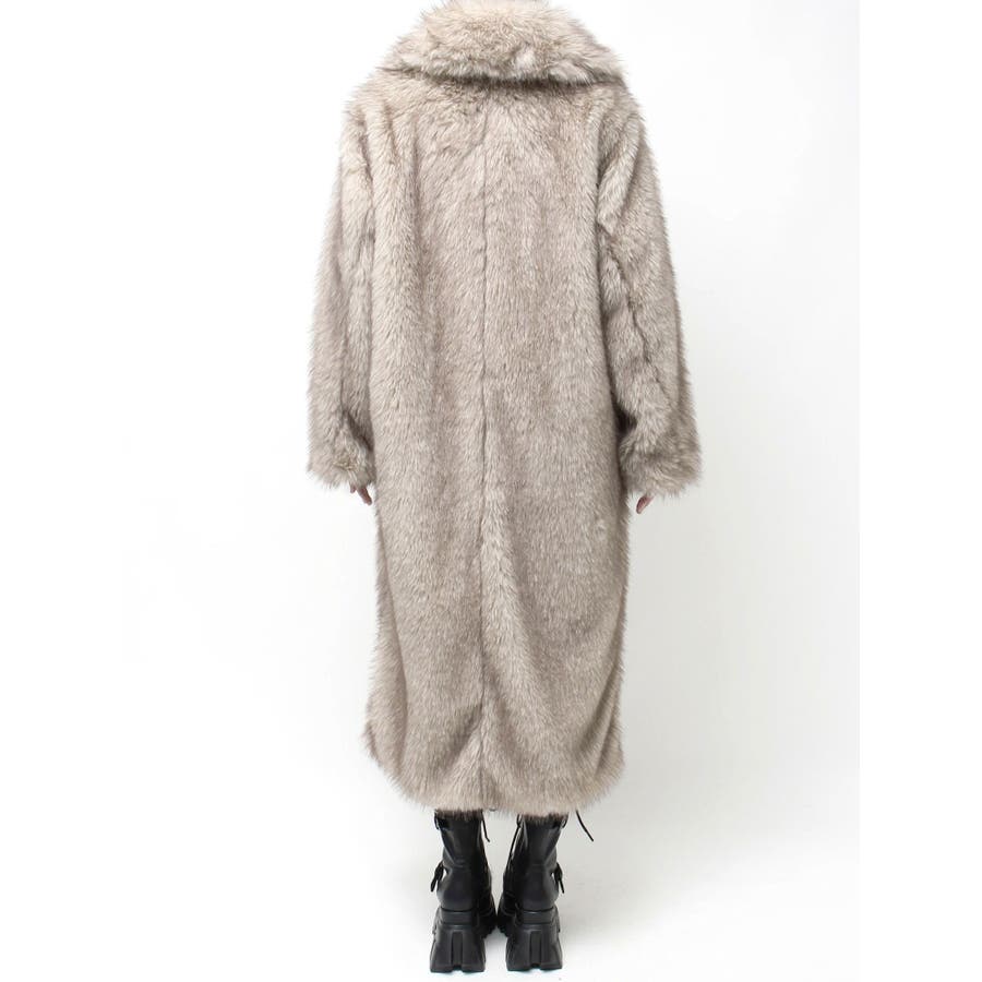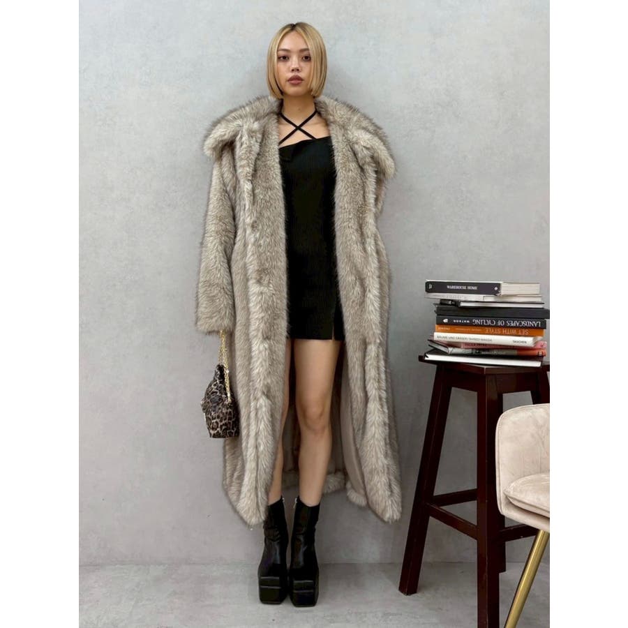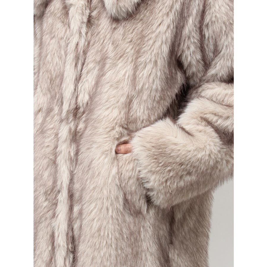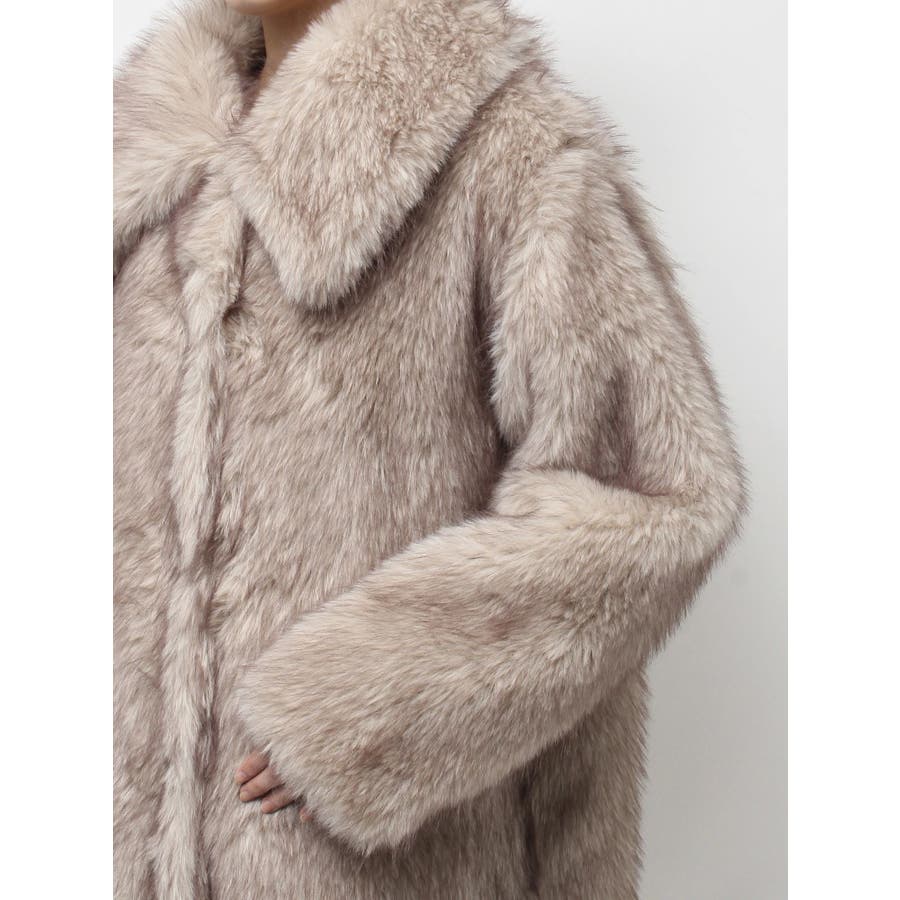 毛先にカラーが付いており、リアルなファー感が特徴のフェイクファーロングコートです。かなりボリューム感があり、ゴージャスな印象を与えてくれます。ボリューム感があるので、タイトなワンピースやカジュアルなデニム合わせがオススメです。衿も大きくしており、閉めて着用するとマフラー代わりにもなり暖かいアウターです。