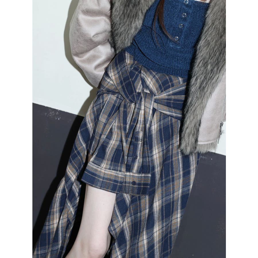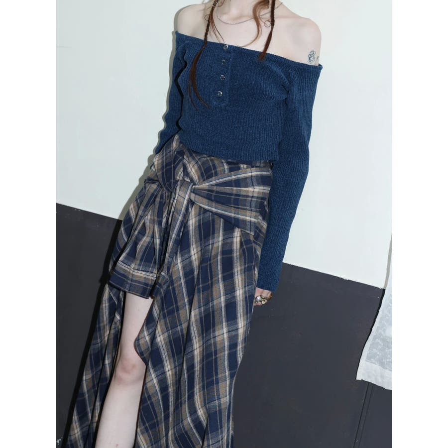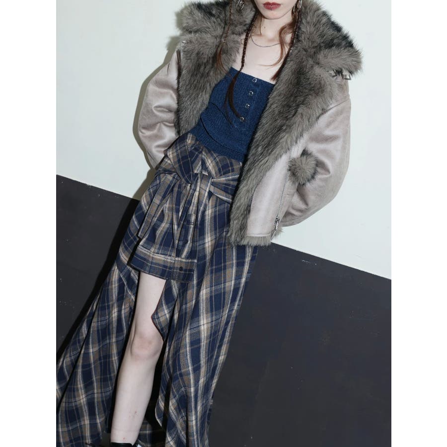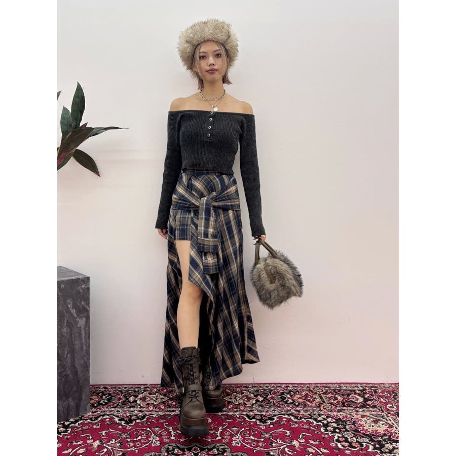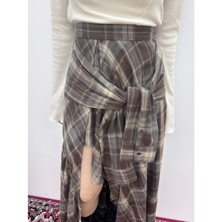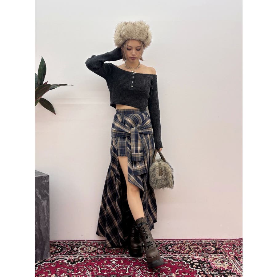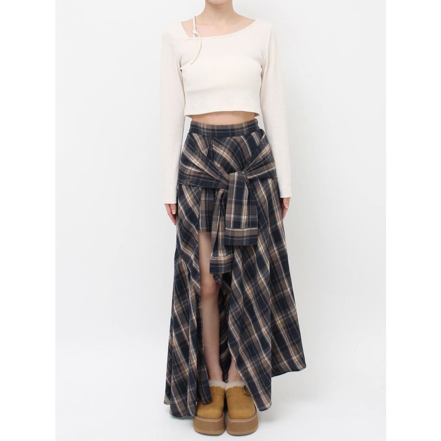 【ブラック】スリーブデザインチェックアシンメトリースカート