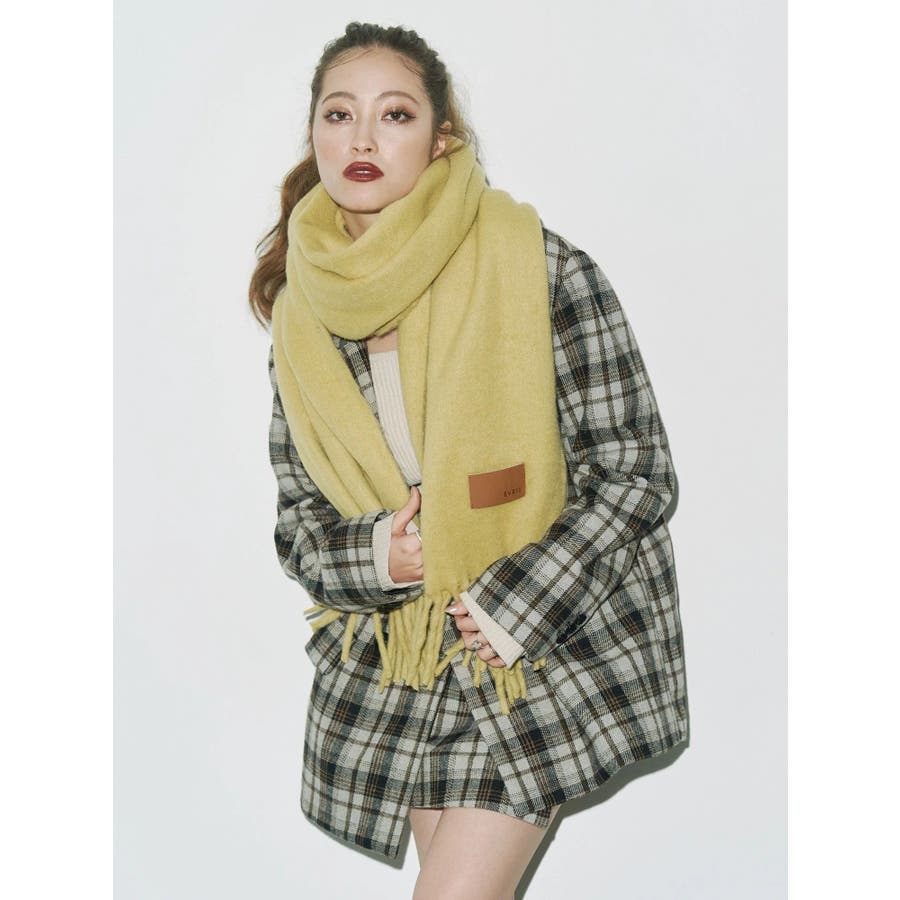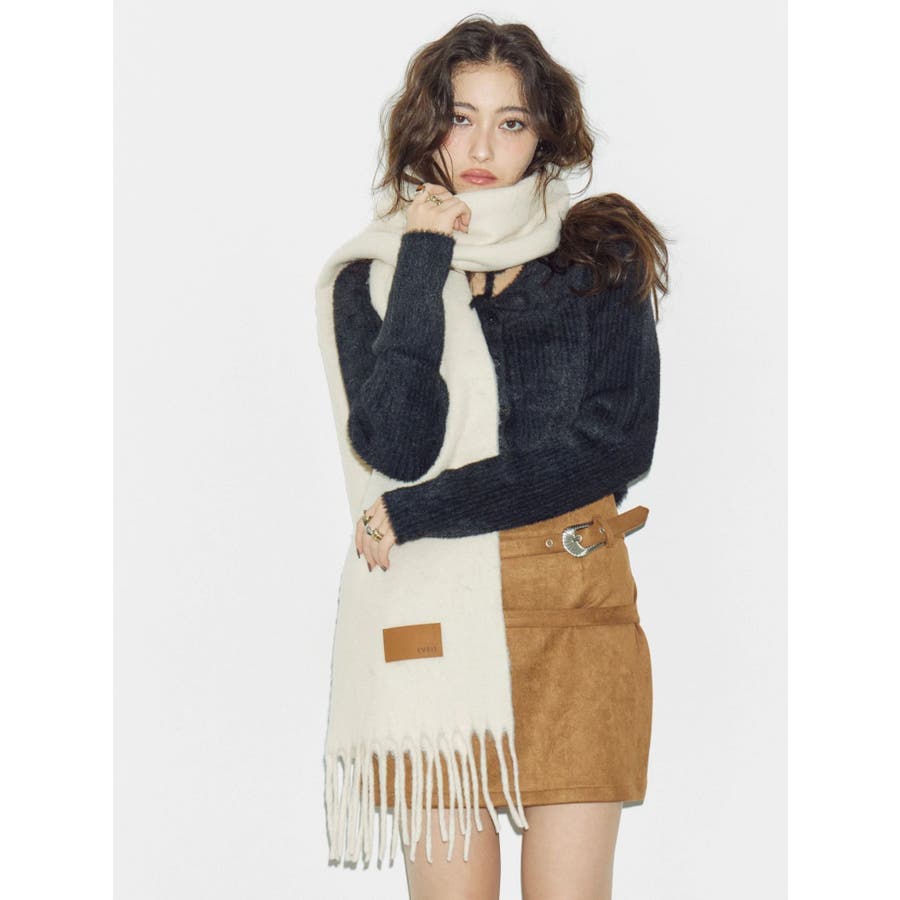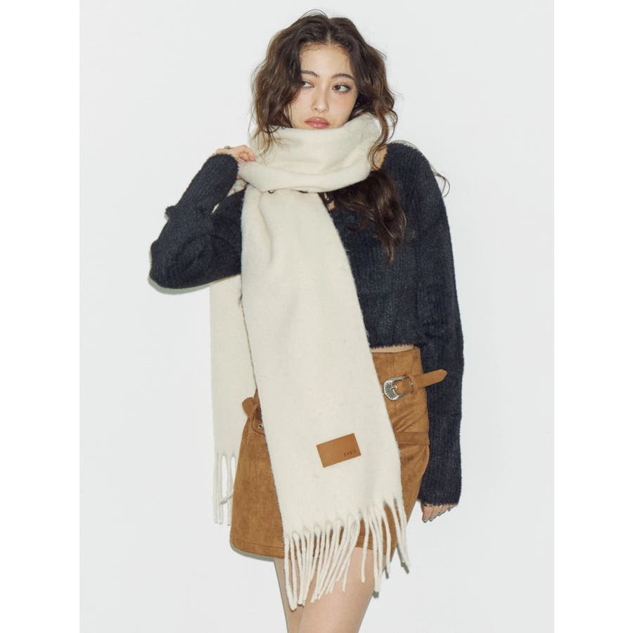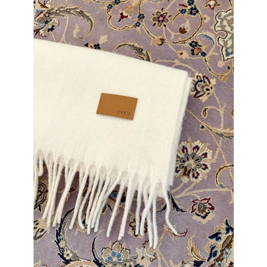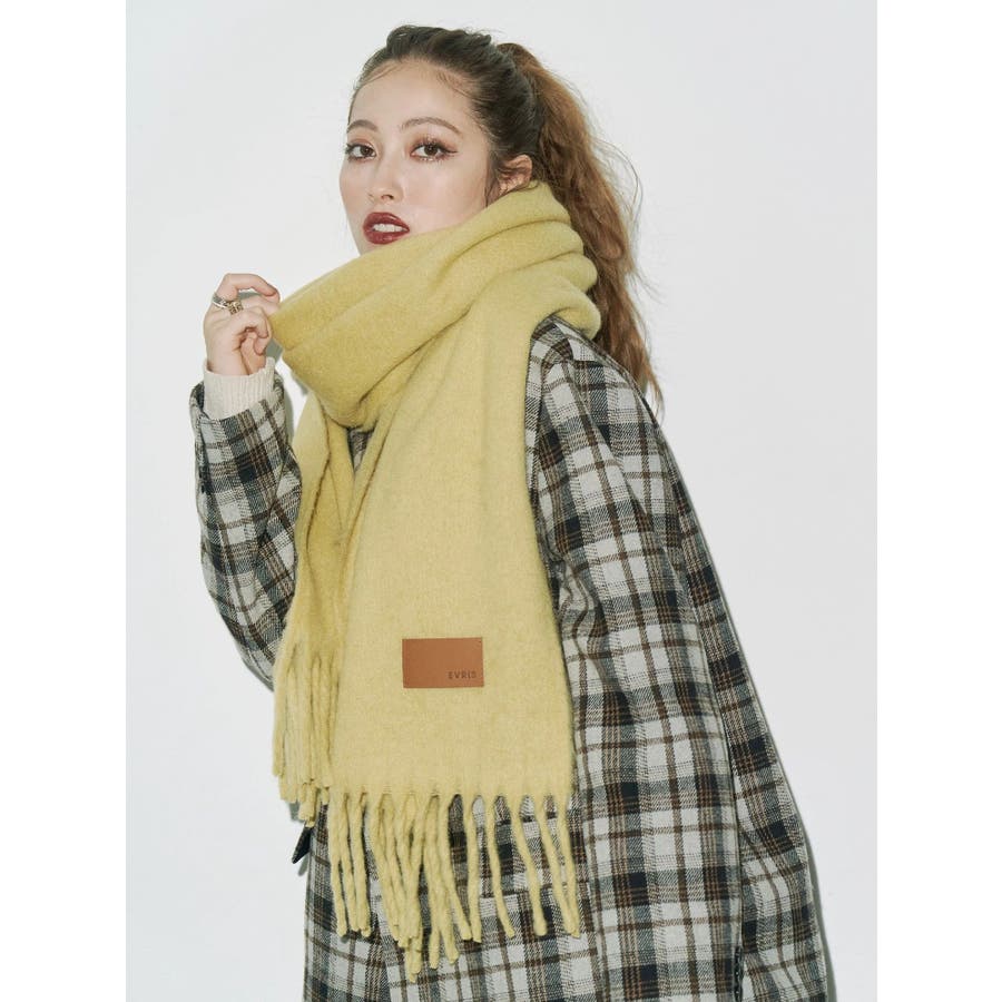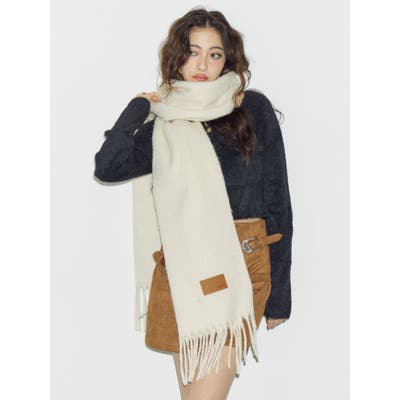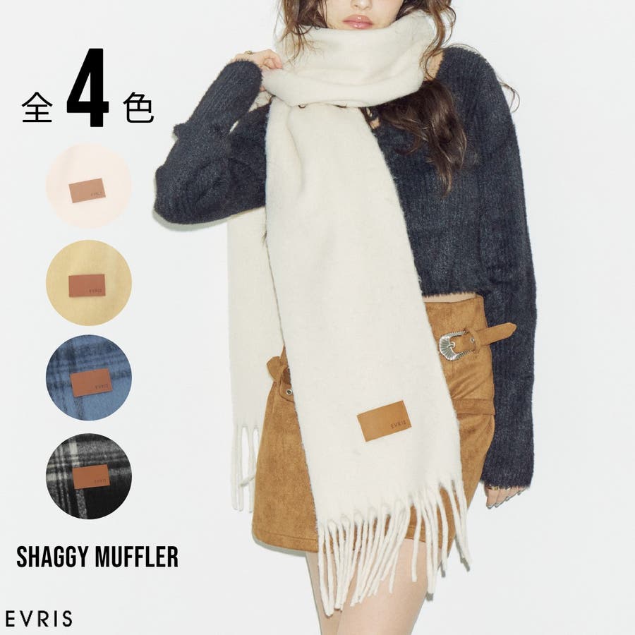 緩く起毛がかかったシャギーマフラーです。横幅が45cmあるのでかなりボリューム感のあるマフラーで、スタイリングを華やかにするアイテムです。左側のフリンジ上にはEVRIS(エヴリス)オリジナル皮パッチを付けておりワンポイントに。