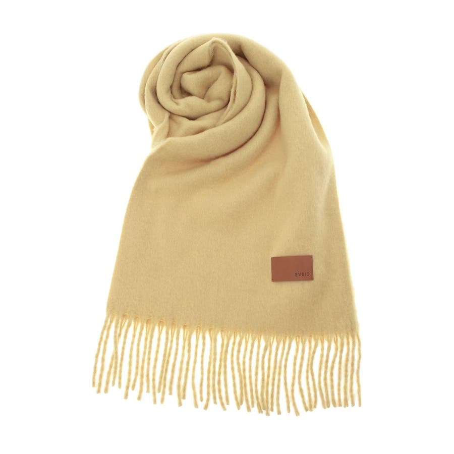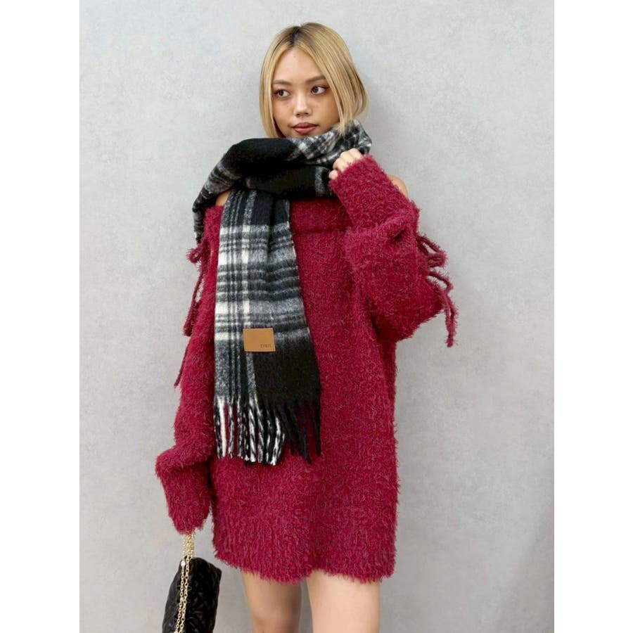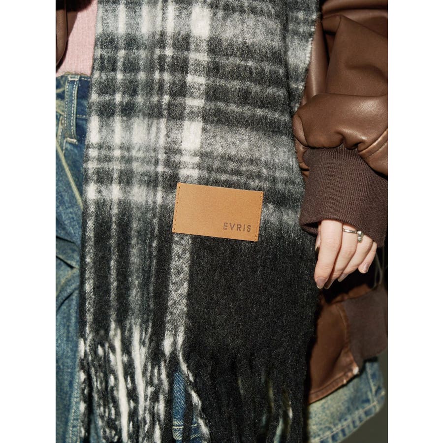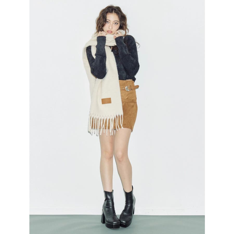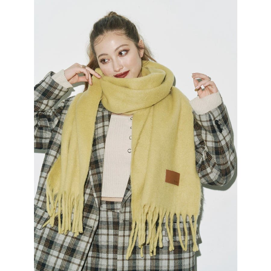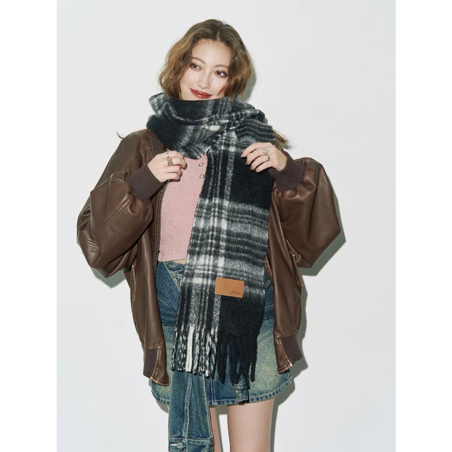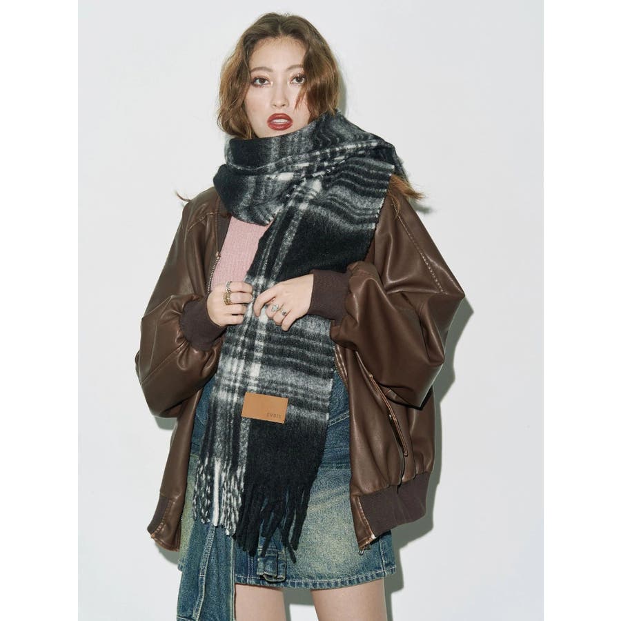 緩く起毛がかかったシャギーマフラーです。横幅が45cmあるのでかなりボリューム感のあるマフラーで、スタイリングを華やかにするアイテムです。左側のフリンジ上にはEVRIS(エヴリス)オリジナル皮パッチを付けておりワンポイントに。
