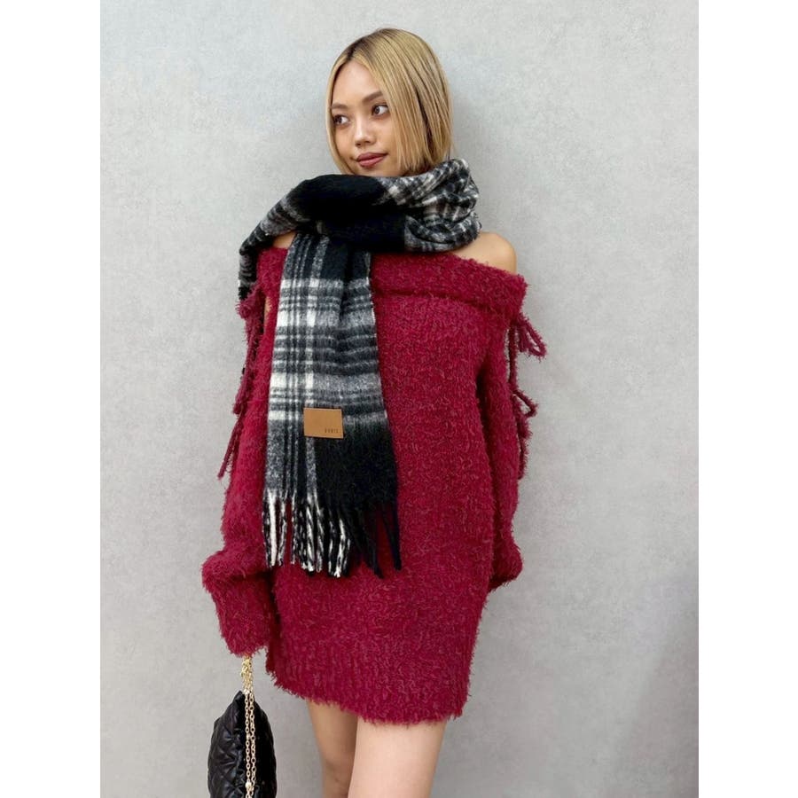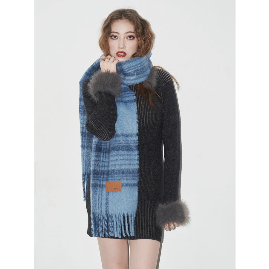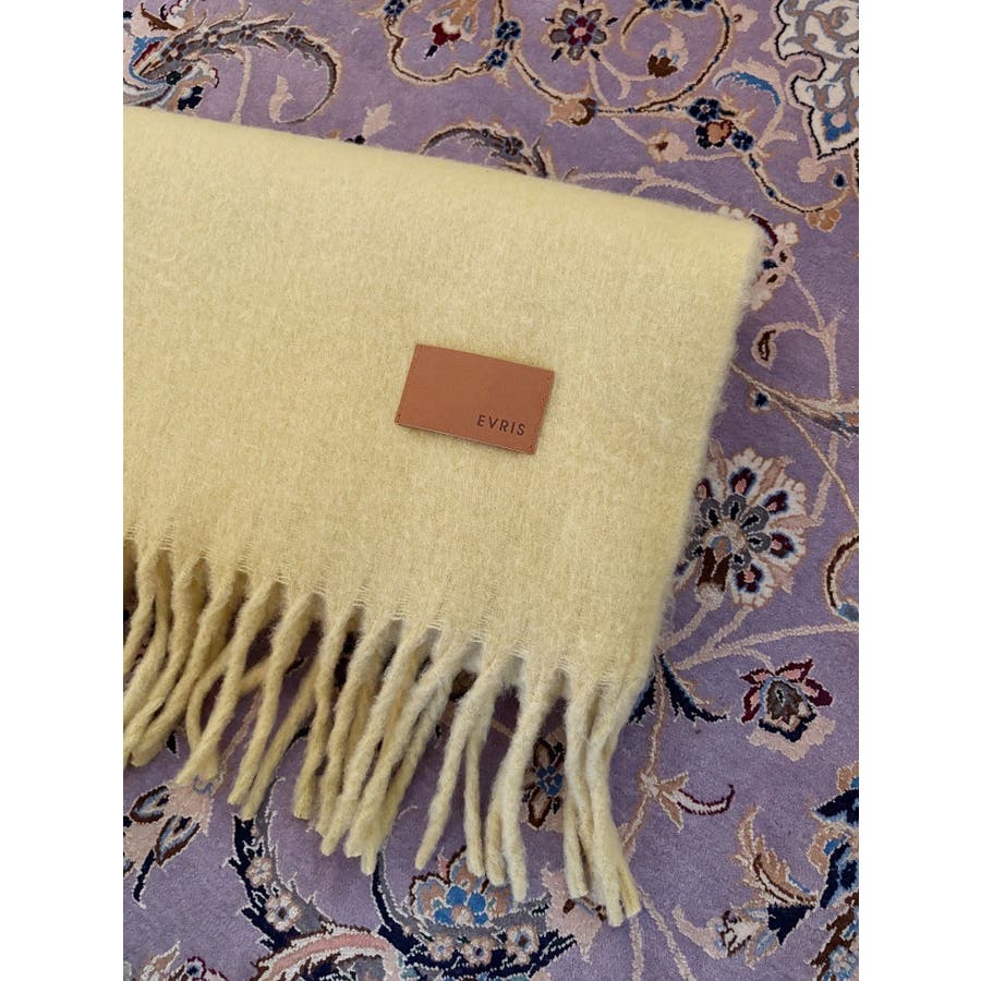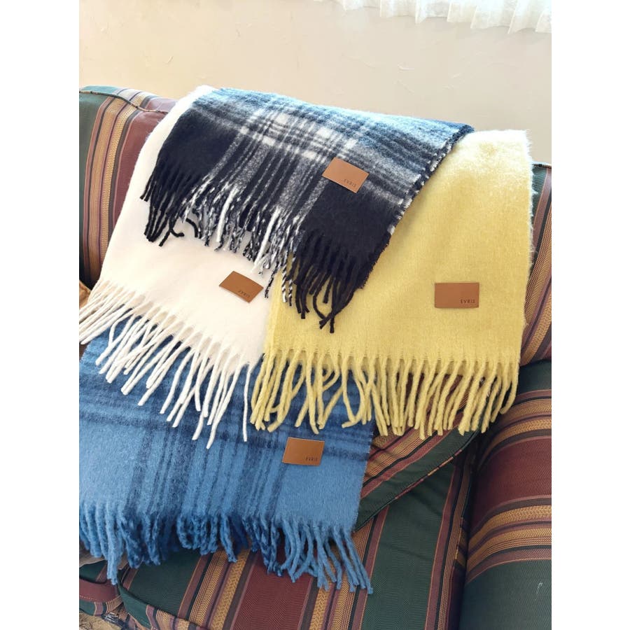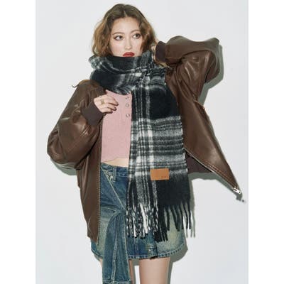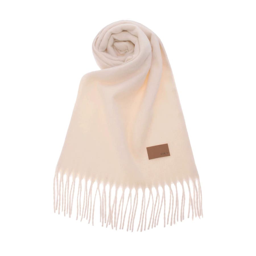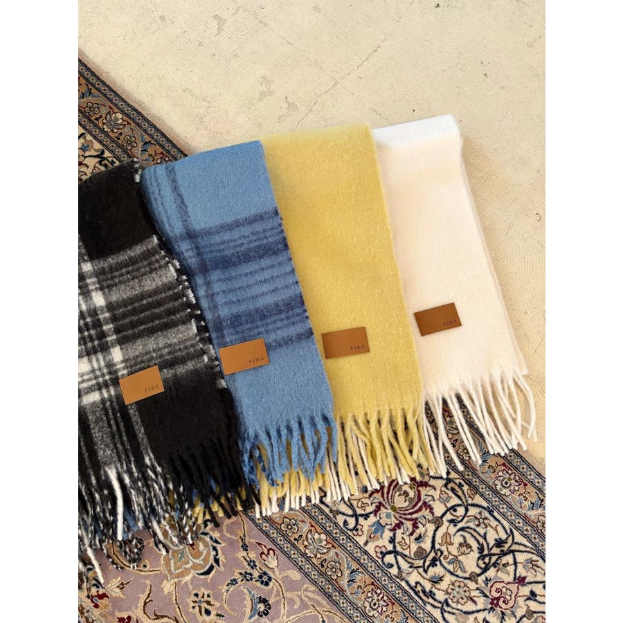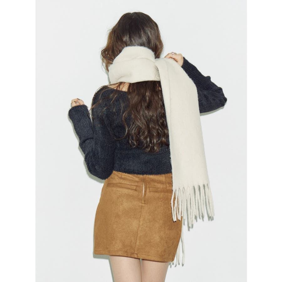 緩く起毛がかかったシャギーマフラーです。横幅が45cmあるのでかなりボリューム感のあるマフラーで、スタイリングを華やかにするアイテムです。左側のフリンジ上にはEVRIS(エヴリス)オリジナル皮パッチを付けておりワンポイントに。