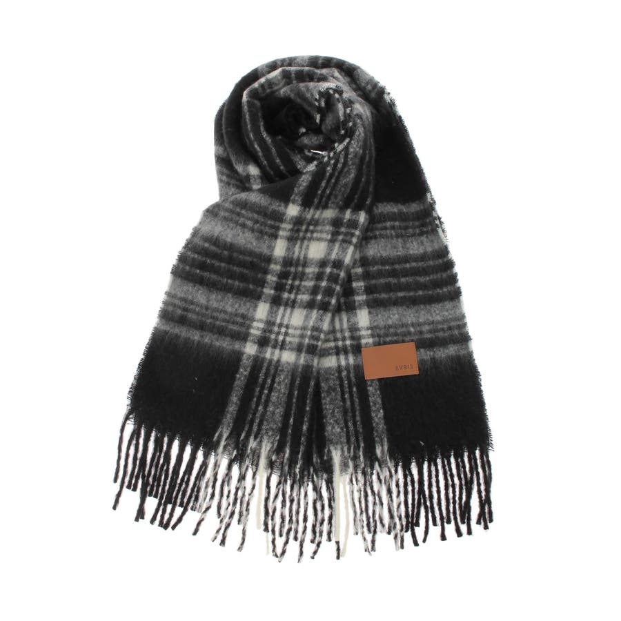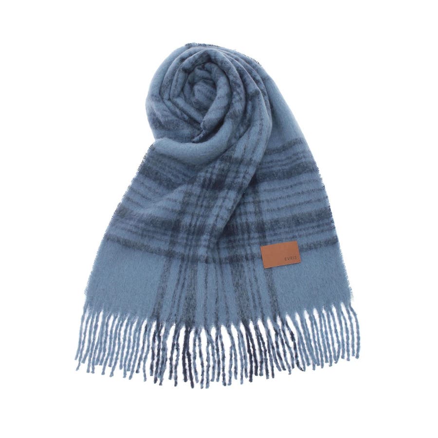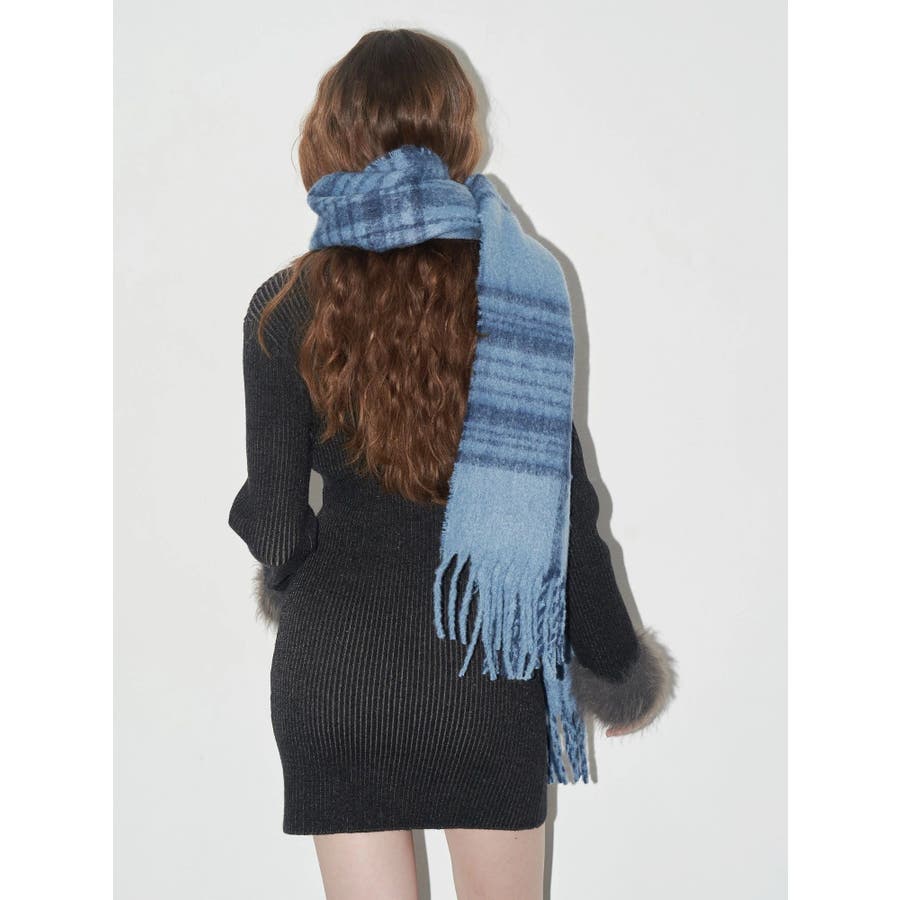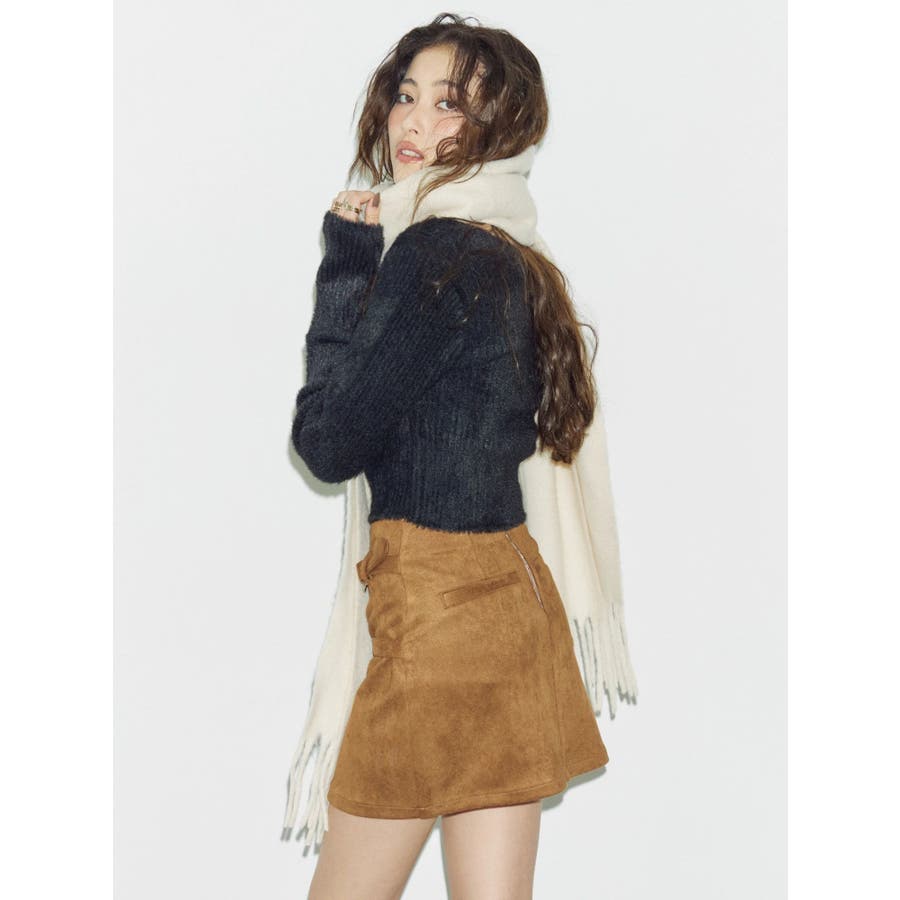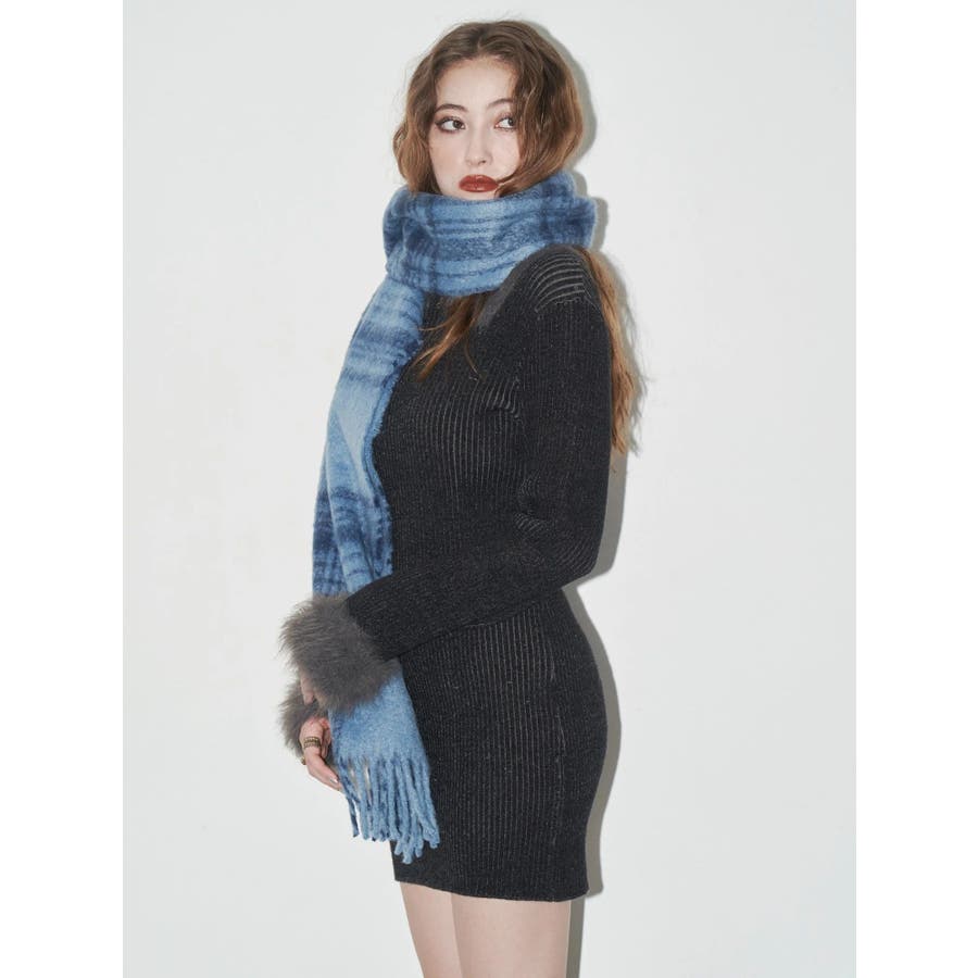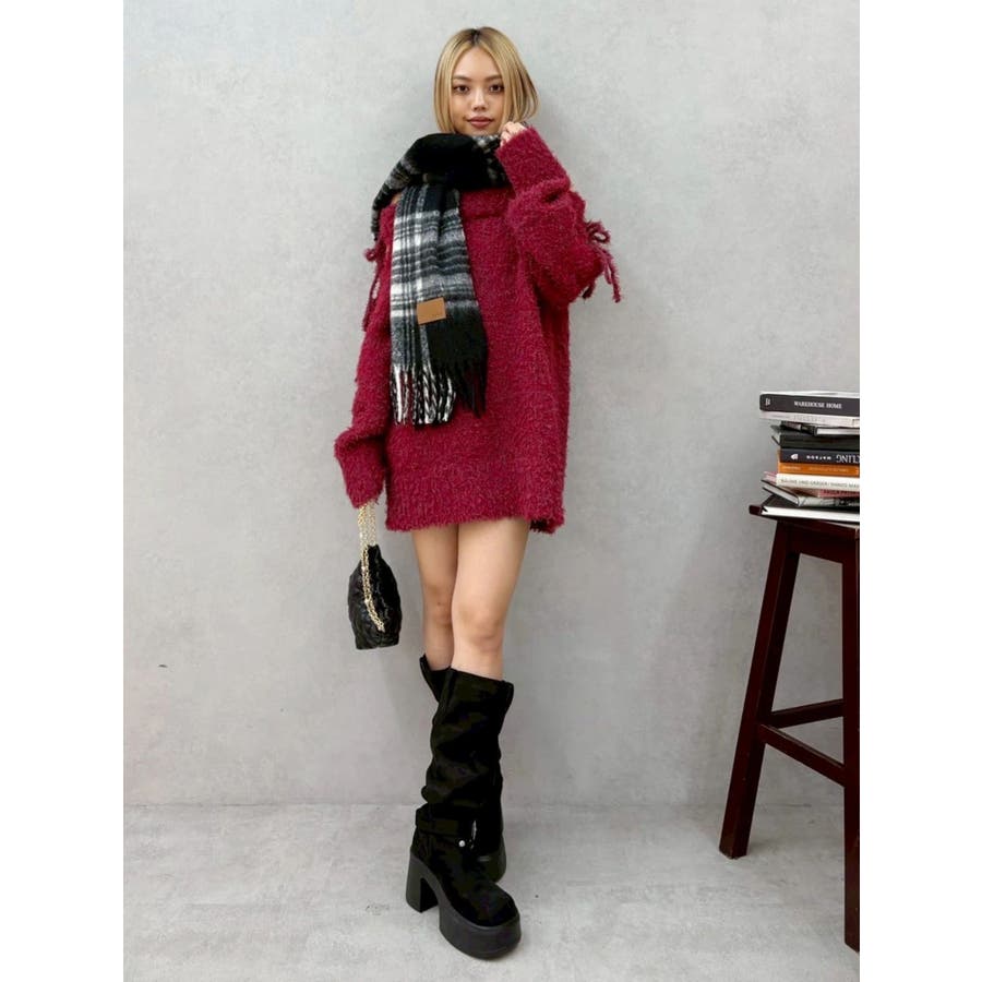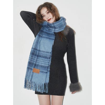 緩く起毛がかかったシャギーマフラーです。横幅が45cmあるのでかなりボリューム感のあるマフラーで、スタイリングを華やかにするアイテムです。左側のフリンジ上にはEVRIS(エヴリス)オリジナル皮パッチを付けておりワンポイントに。