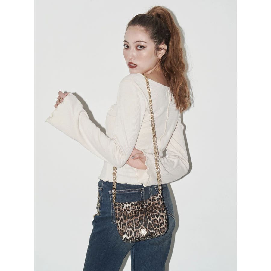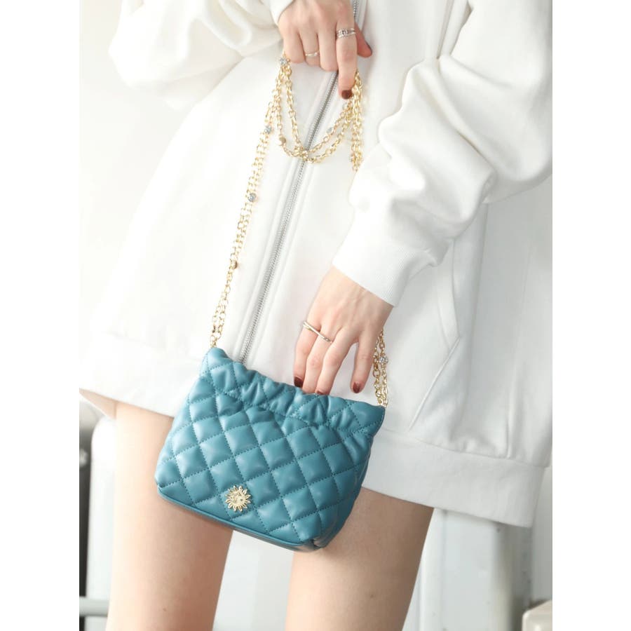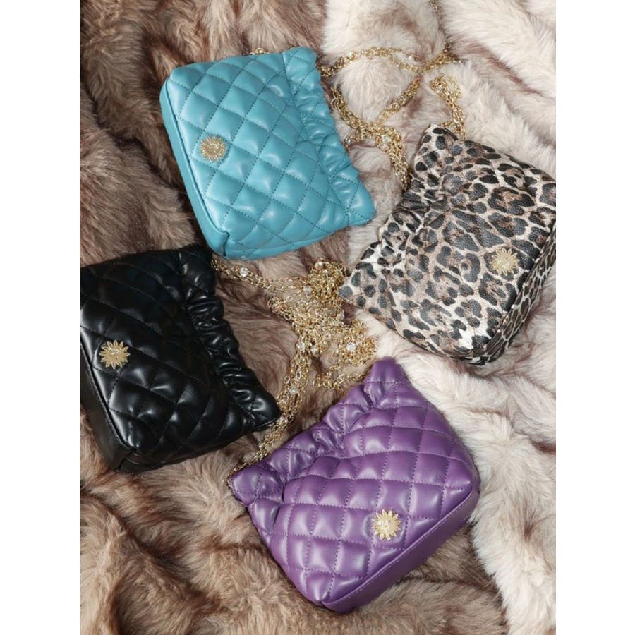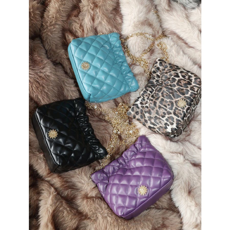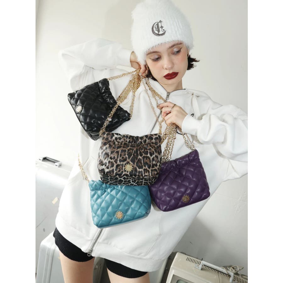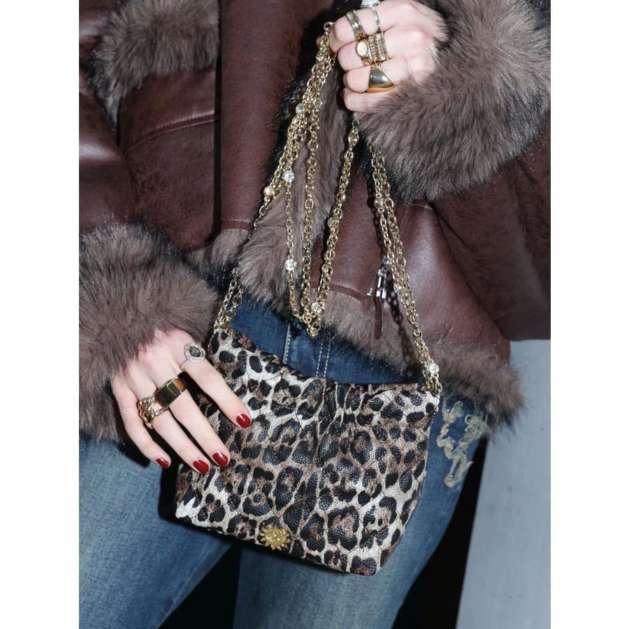 EVRIS(エヴリス)定番のキルティングBAGの今季バージョンです。今季はショルダー部分をビジューチェーンにしています。チェーンも贅沢に2本使いでラグジュアリーな印象に。シンプルながらもキラッと光るデザインで、スタイリングのアクセントになるBAGです。ミックスはEVRISらしいレオパード柄の生地を使用しています。