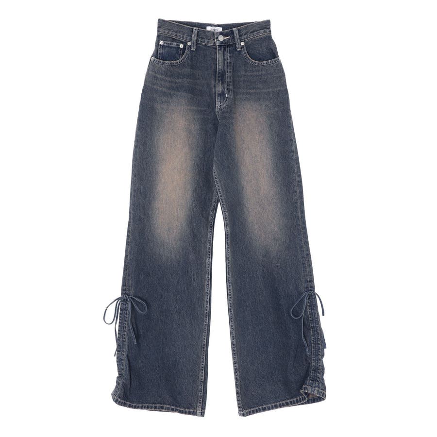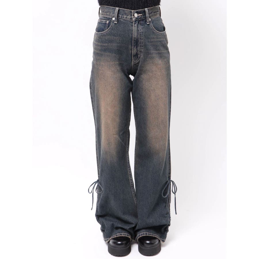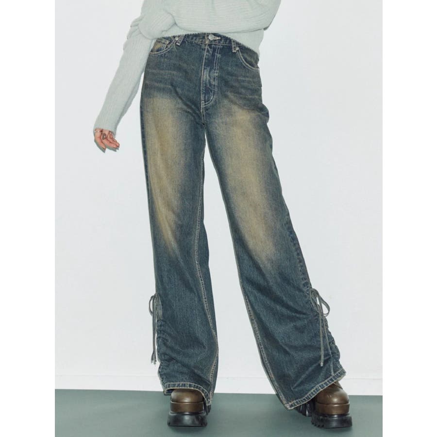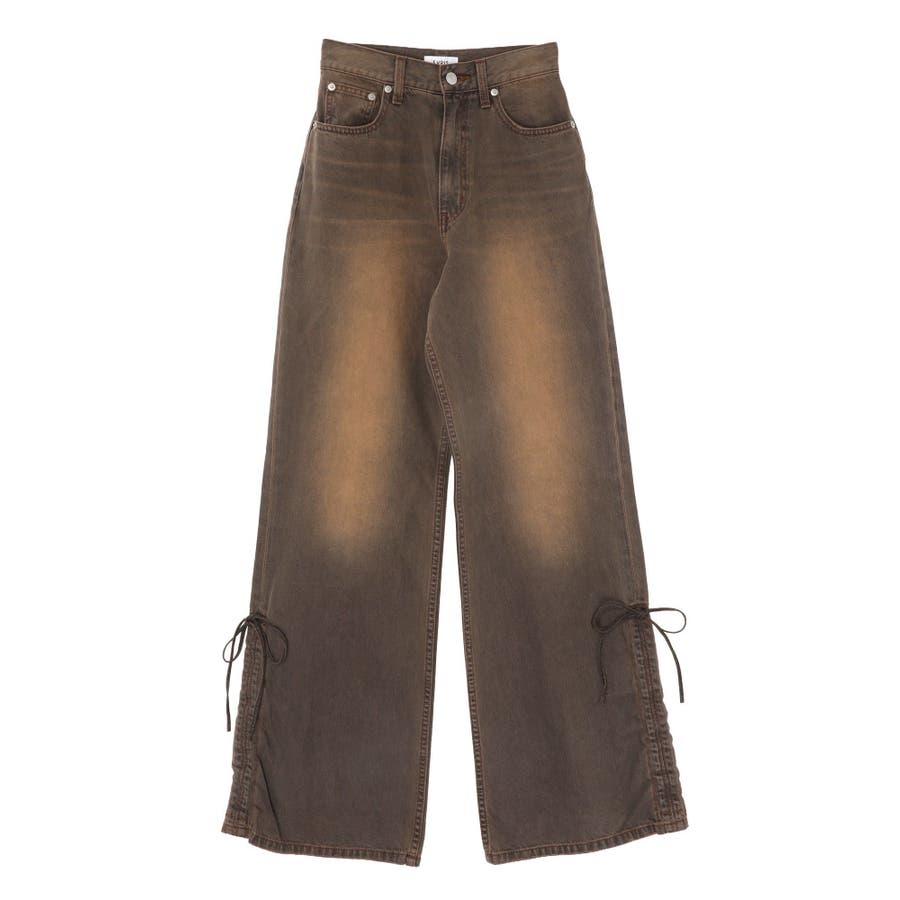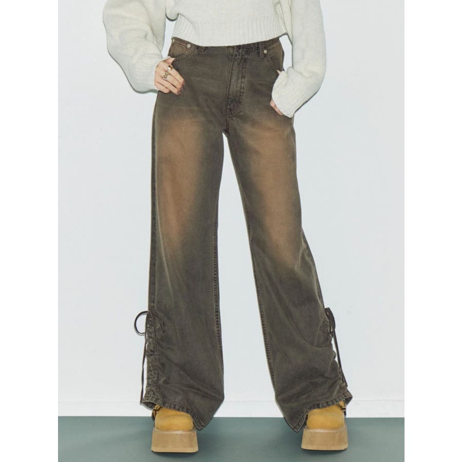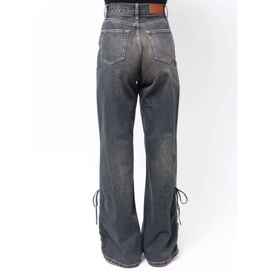 トレンド感のあるワイドストレートシルエットに裾のドローストリング(絞りディテール)でエッジを効かせたデニムパンツです。前身は脚のラインを立体的に見えるようデニム全体に加工を施しているので、こなれ感がでます。両サイドにギャザーリボンがあり裾を絞ればバルーン調にもなる2WAY仕様でコーデの幅がグッと広がる優秀アイテムです。