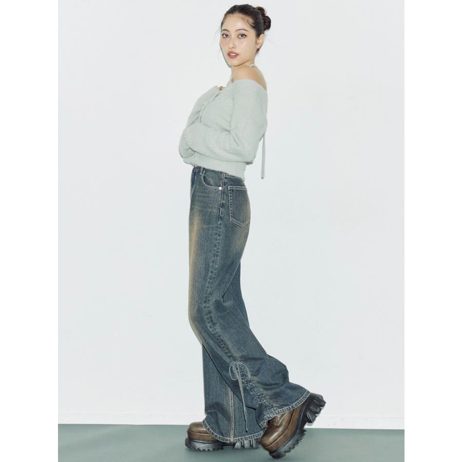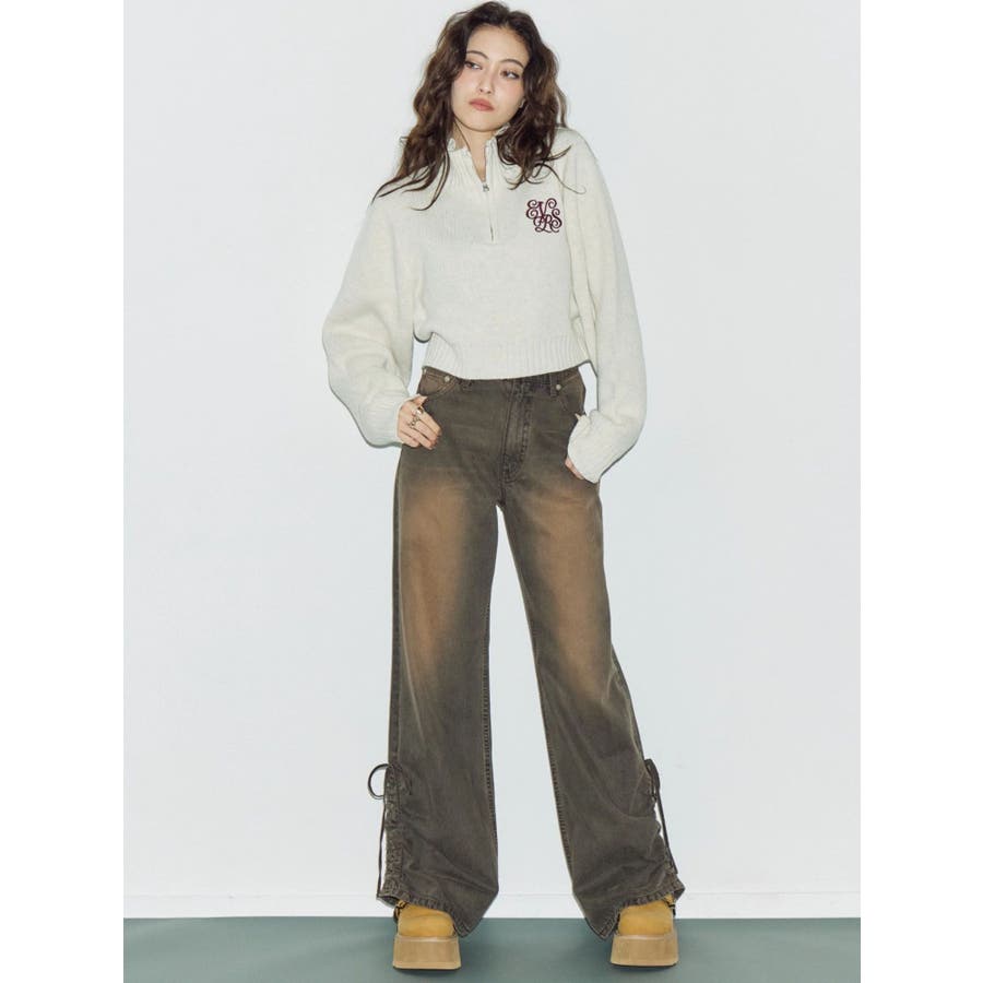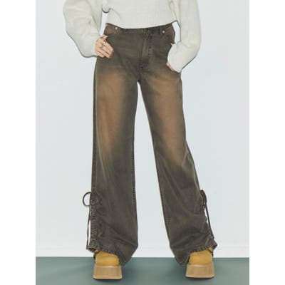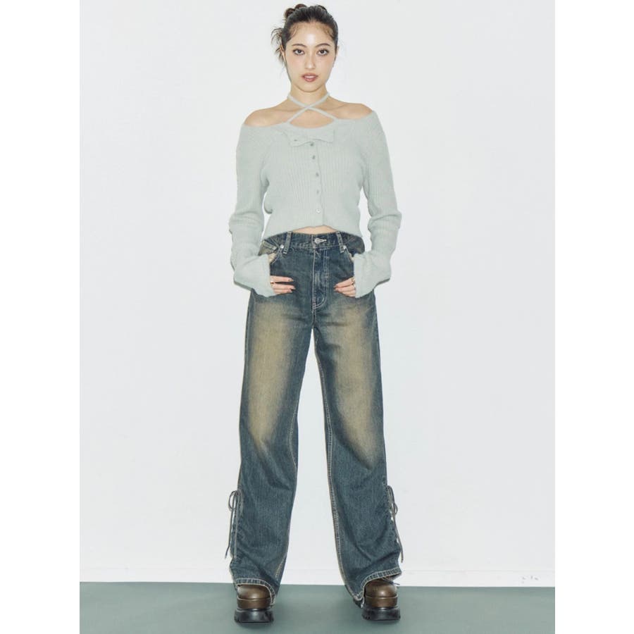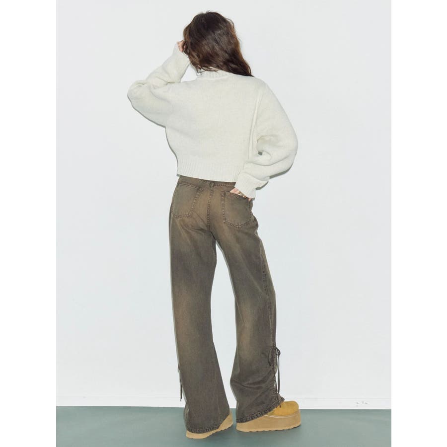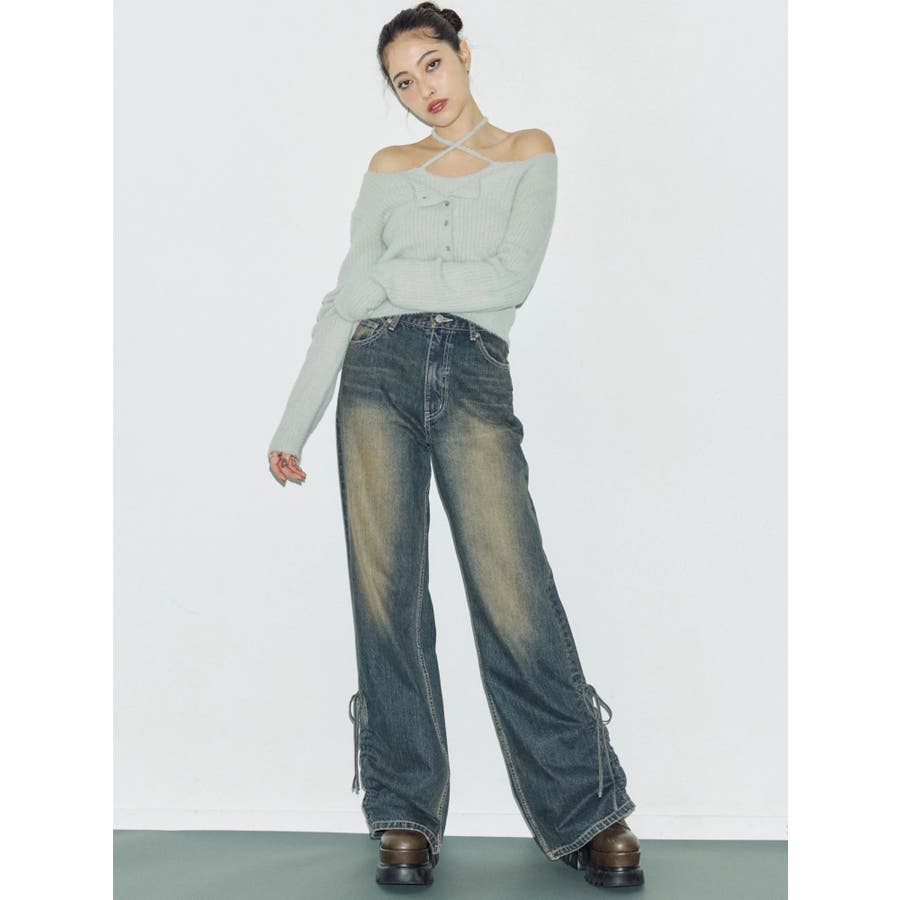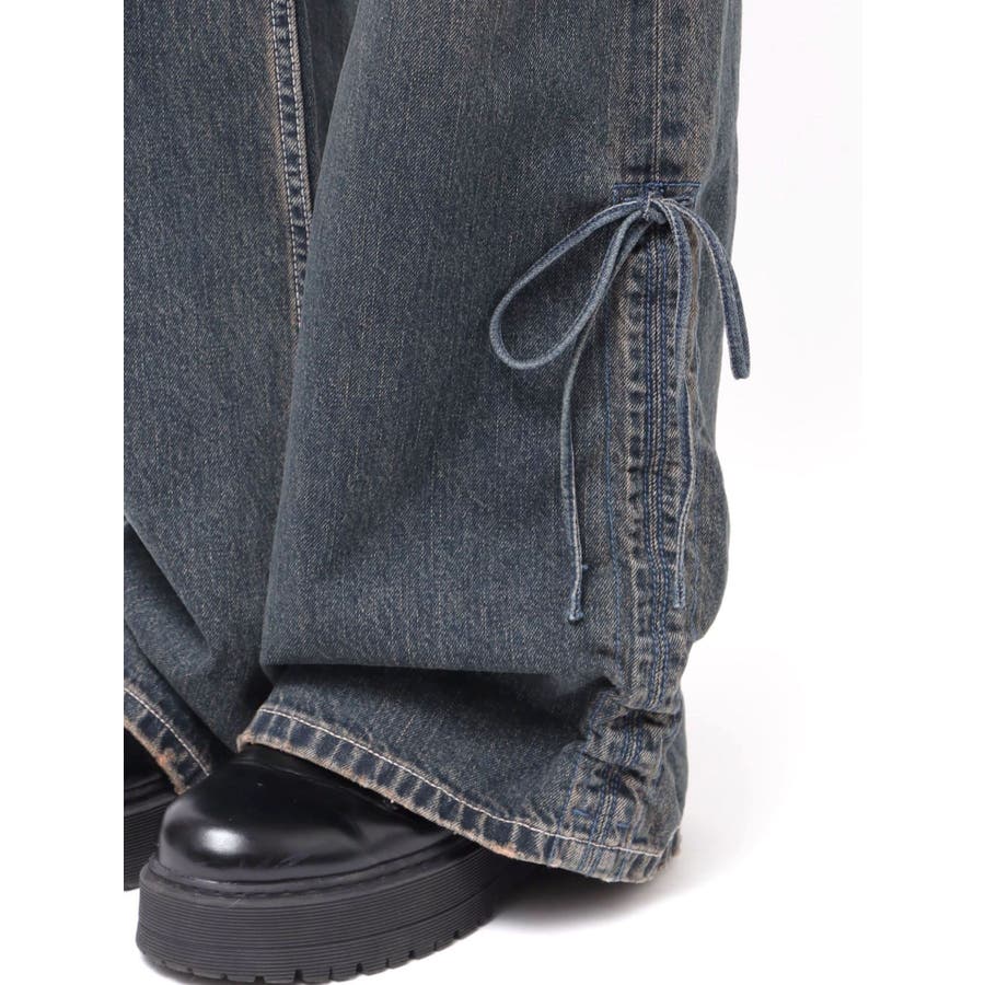 トレンド感のあるワイドストレートシルエットに裾のドローストリング(絞りディテール)でエッジを効かせたデニムパンツです。前身は脚のラインを立体的に見えるようデニム全体に加工を施しているので、こなれ感がでます。両サイドにギャザーリボンがあり裾を絞ればバルーン調にもなる2WAY仕様でコーデの幅がグッと広がる優秀アイテムです。