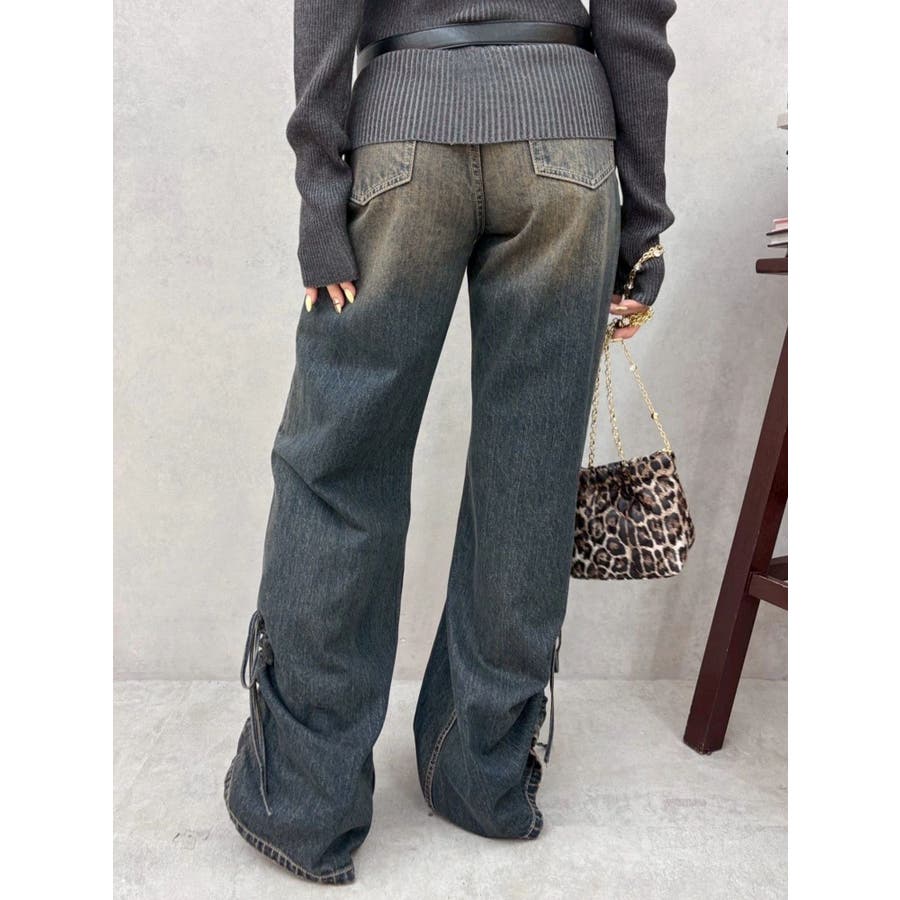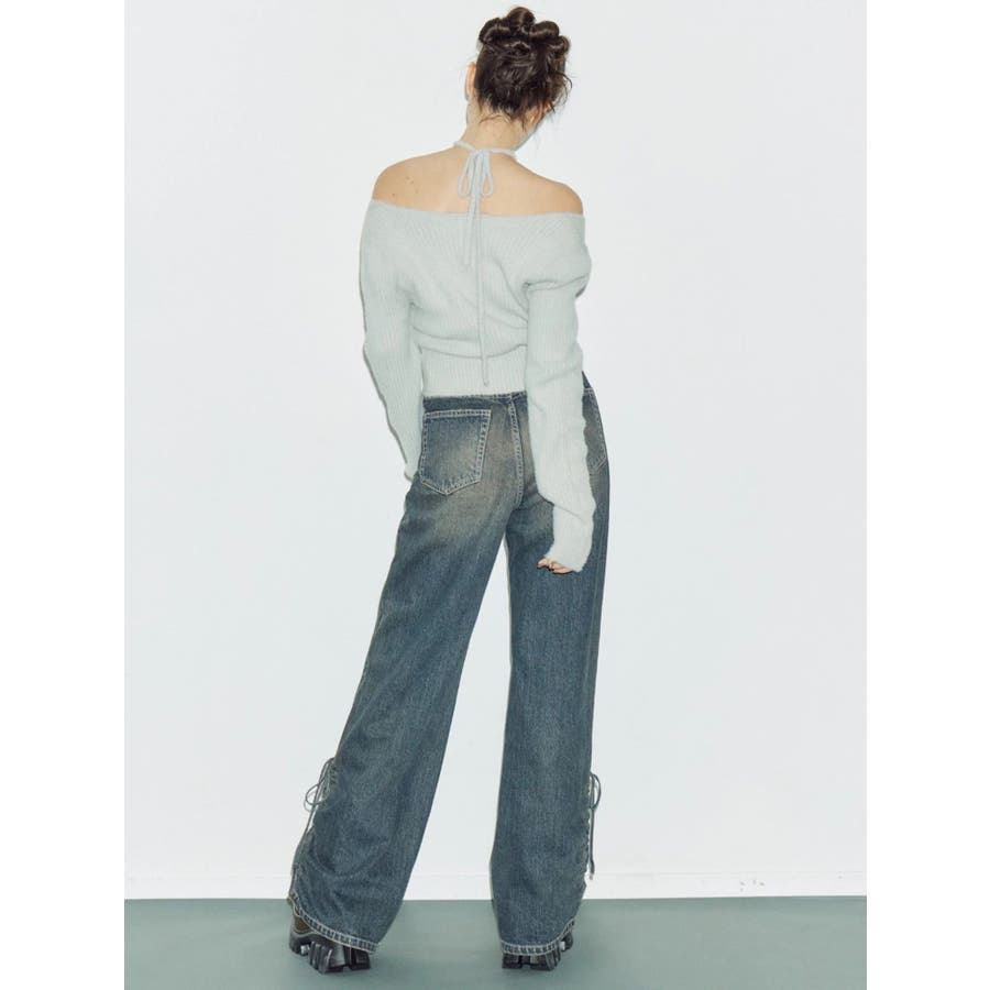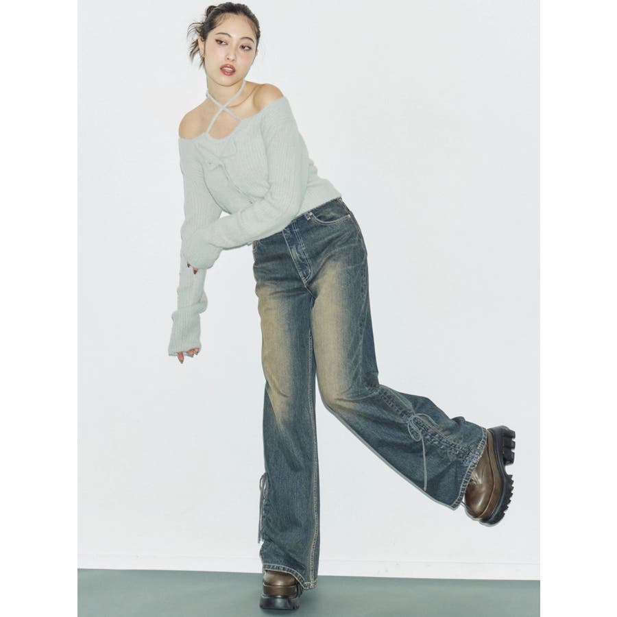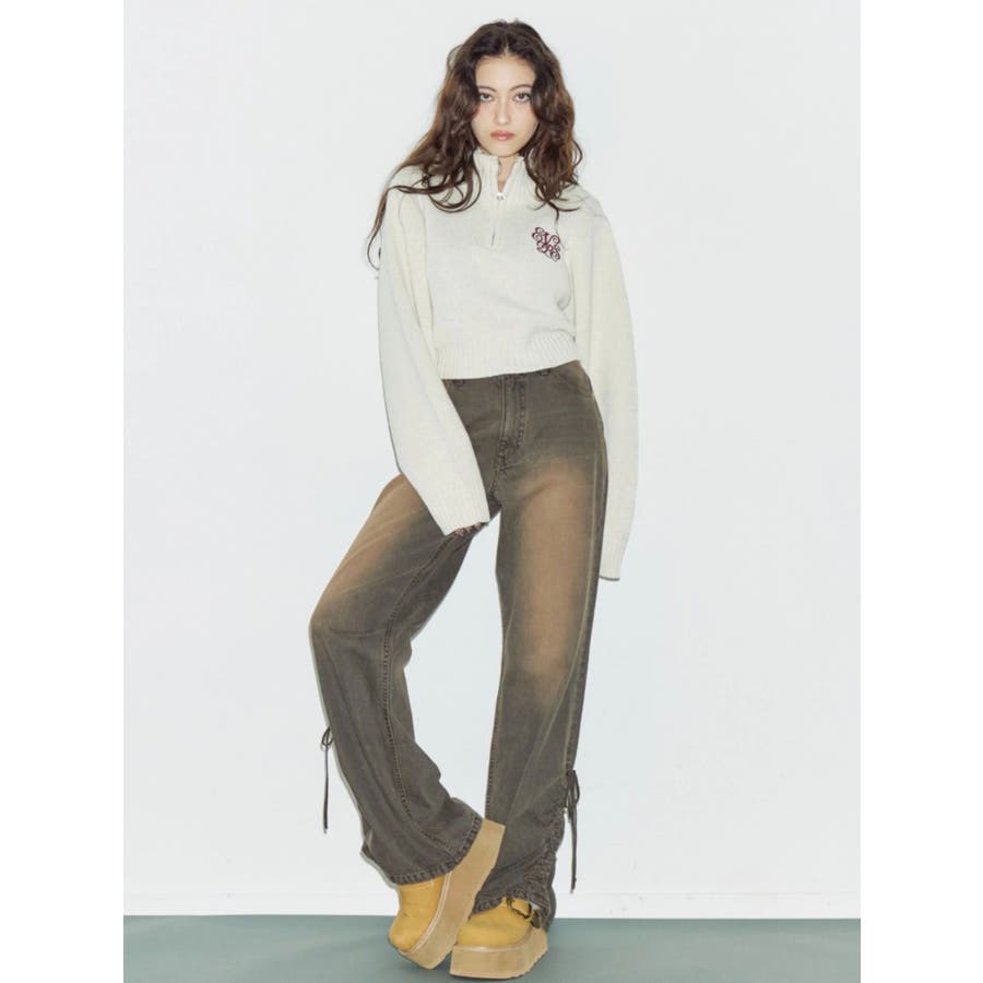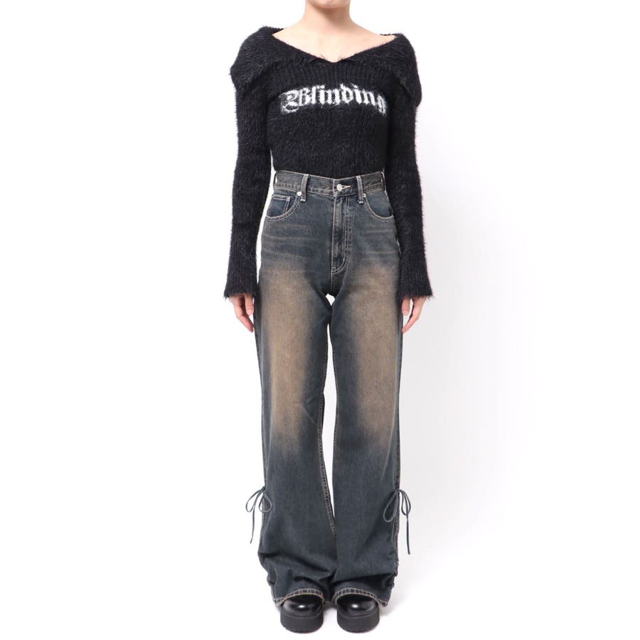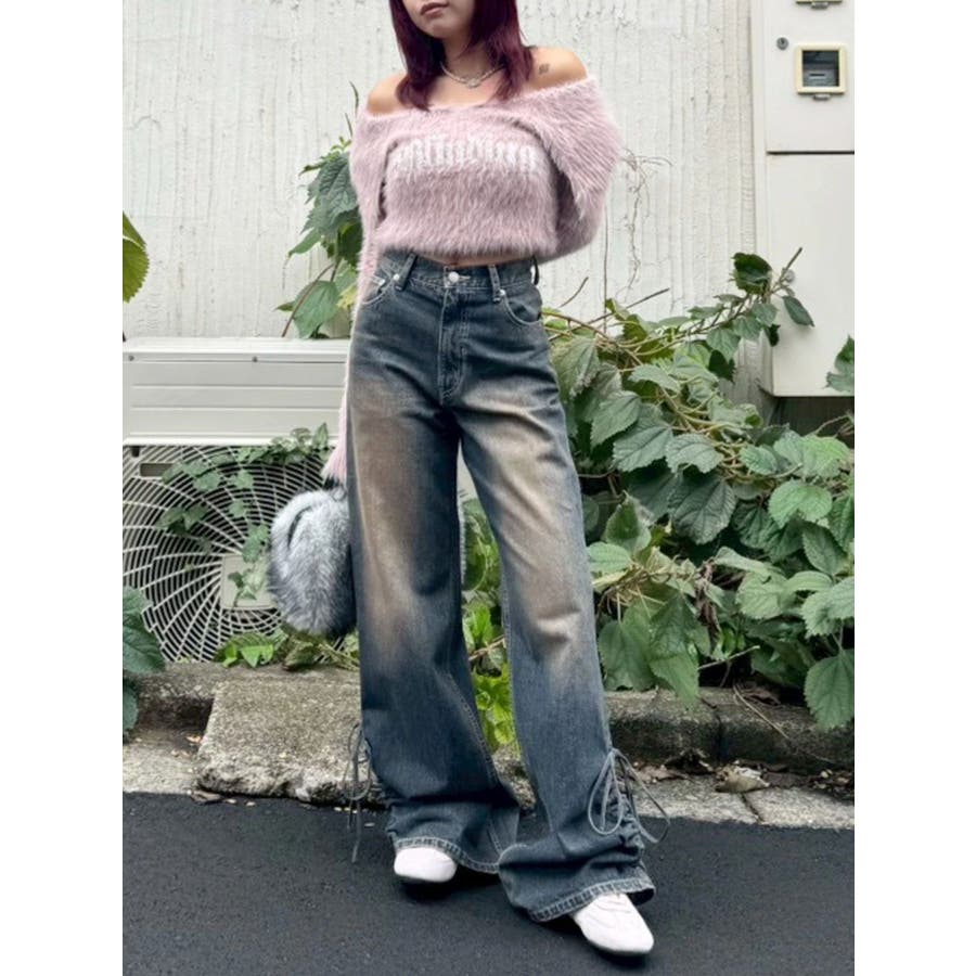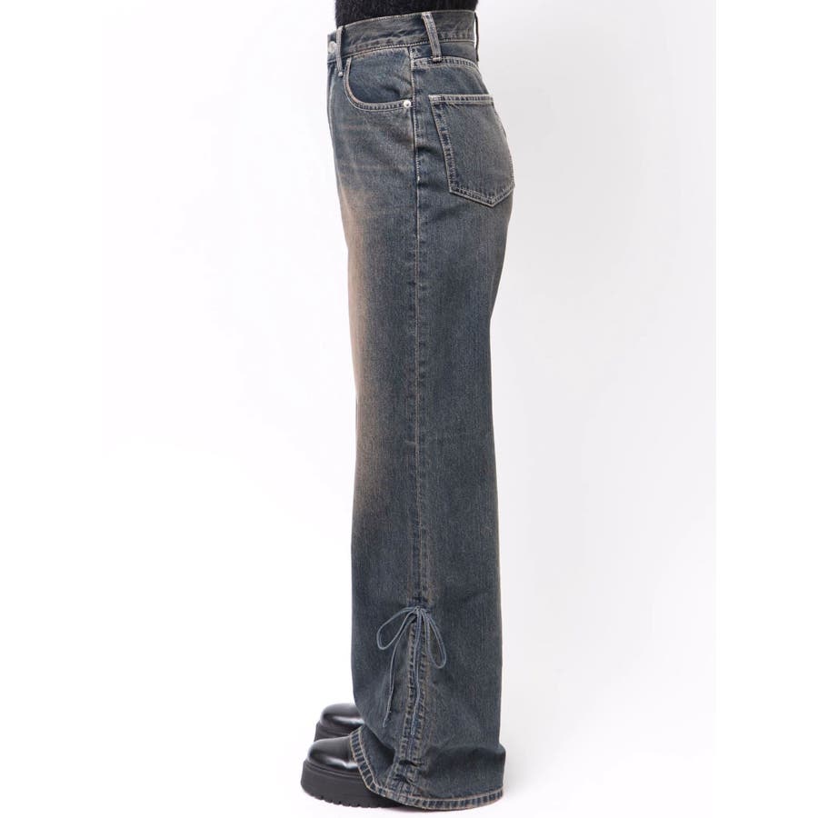 トレンド感のあるワイドストレートシルエットに裾のドローストリング(絞りディテール)でエッジを効かせたデニムパンツです。前身は脚のラインを立体的に見えるようデニム全体に加工を施しているので、こなれ感がでます。両サイドにギャザーリボンがあり裾を絞ればバルーン調にもなる2WAY仕様でコーデの幅がグッと広がる優秀アイテムです。
