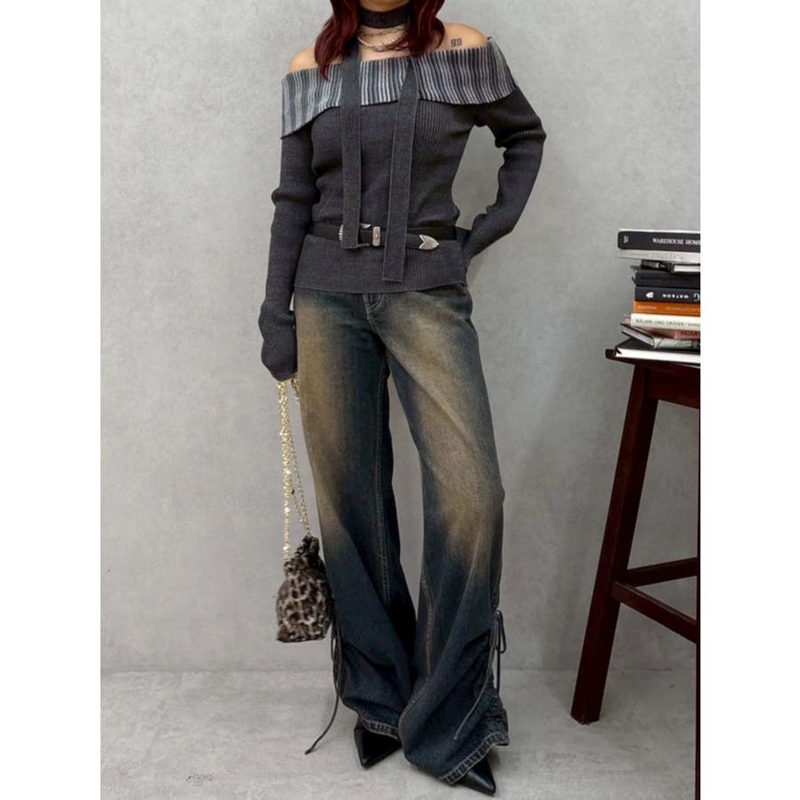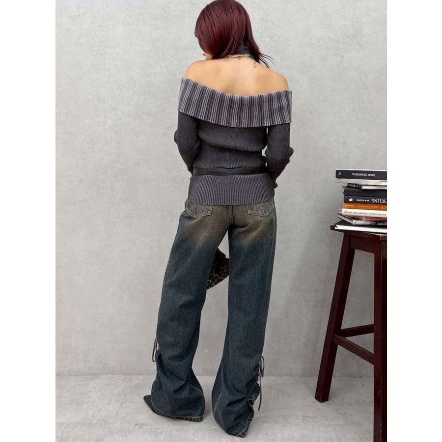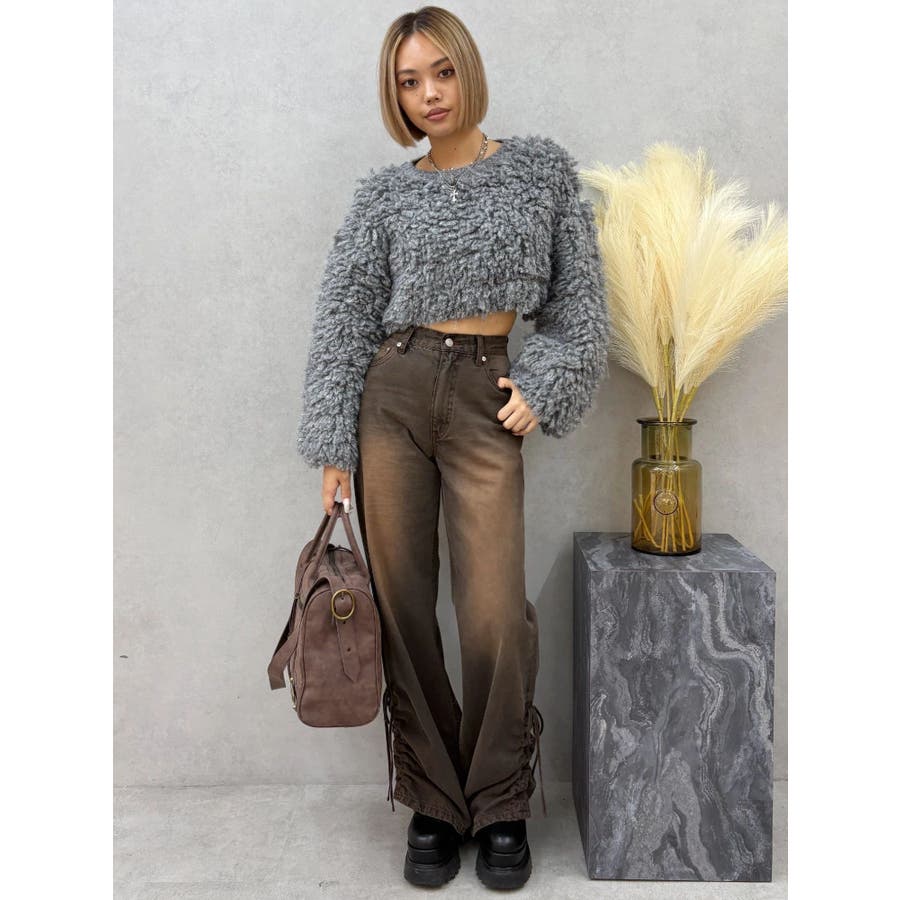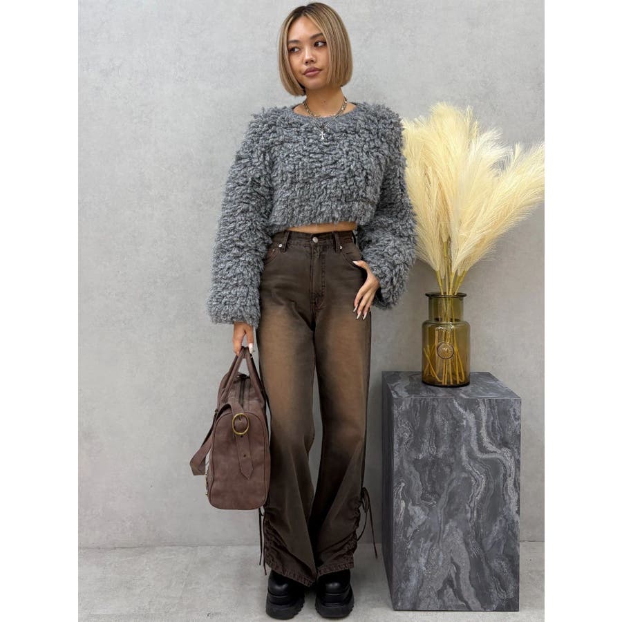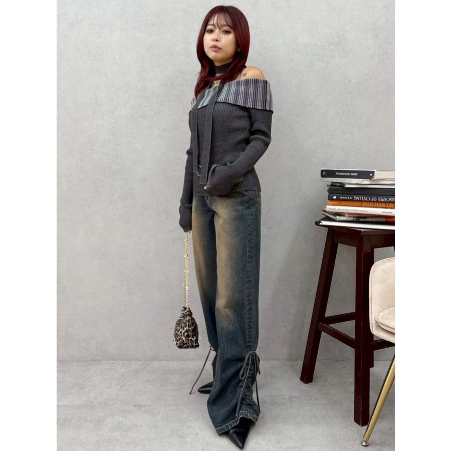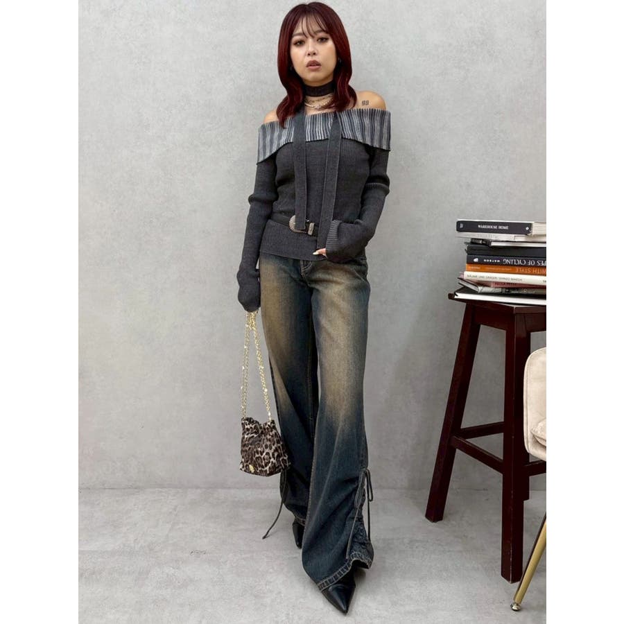トレンド感のあるワイドストレートシルエットに裾のドローストリング(絞りディテール)でエッジを効かせたデニムパンツです。前身は脚のラインを立体的に見えるようデニム全体に加工を施しているので、こなれ感がでます。両サイドにギャザーリボンがあり裾を絞ればバルーン調にもなる2WAY仕様でコーデの幅がグッと広がる優秀アイテムです。