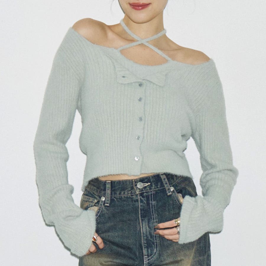 ■デザイントレンドのホルターネックデザインのニット。デコルテまわりはレイヤード風のデザインになっており、よりトレンド感がアップしています。ホルターネック部分はクロスさせても良いですし、そのまま後ろで結ぶことも可能です。毛足の短めのシャギー素材を使用しているため、存在感は有りますがアウターにも響きにくいサイズに仕上がっています。■スタイリング シンプルながらもデザイン性があるので1枚でこなれたスタイリングに。デニムパンツ、柄スカートなど何にでも合わせやすいニット。暖かく肌触りの良い素材でアウターのインナーとしても使いやすいです。-------------- 透け感:なし 裏地:なし 生地の厚み:普通 伸縮性:あり --------------