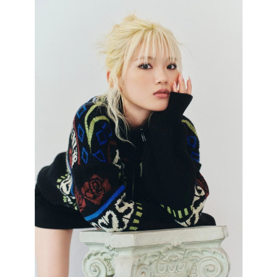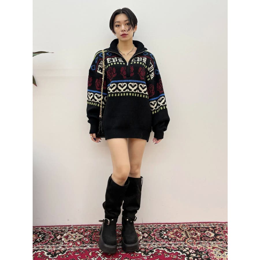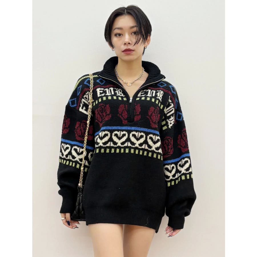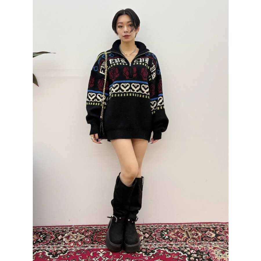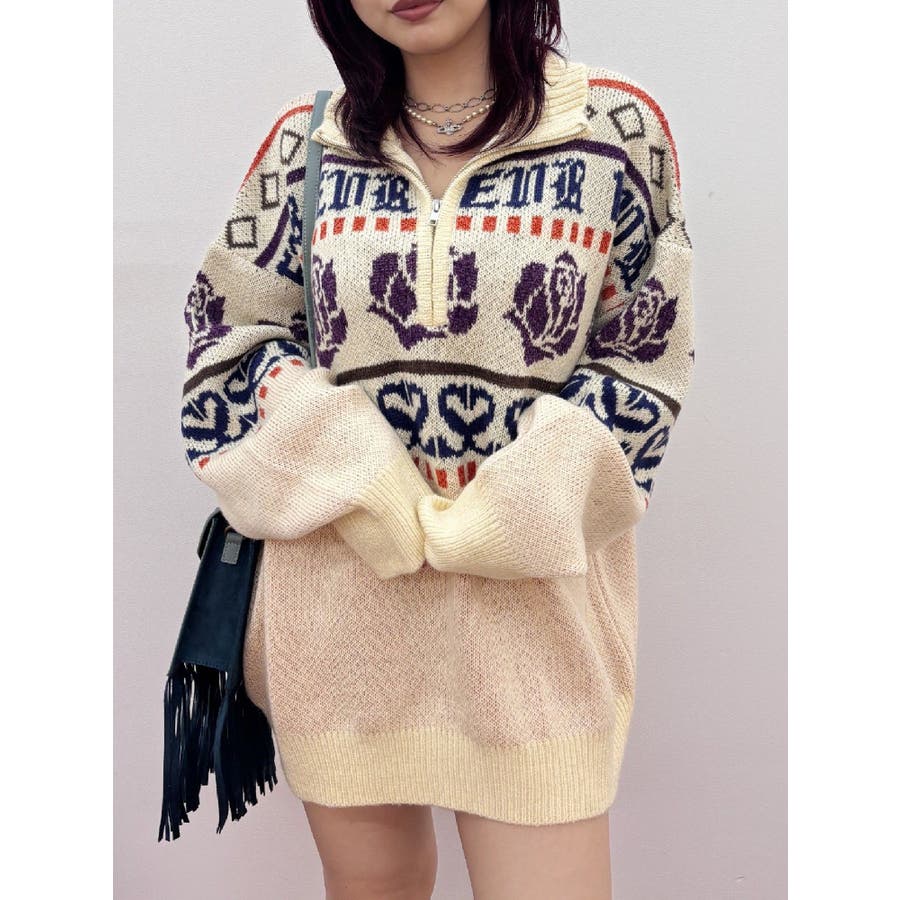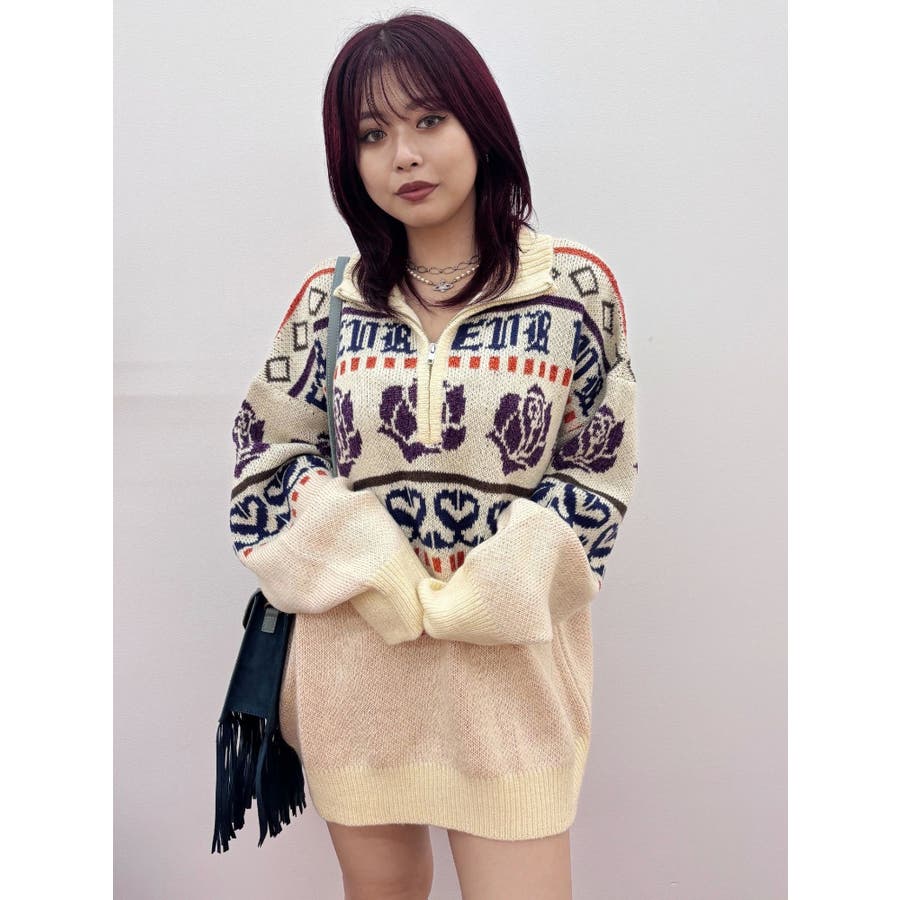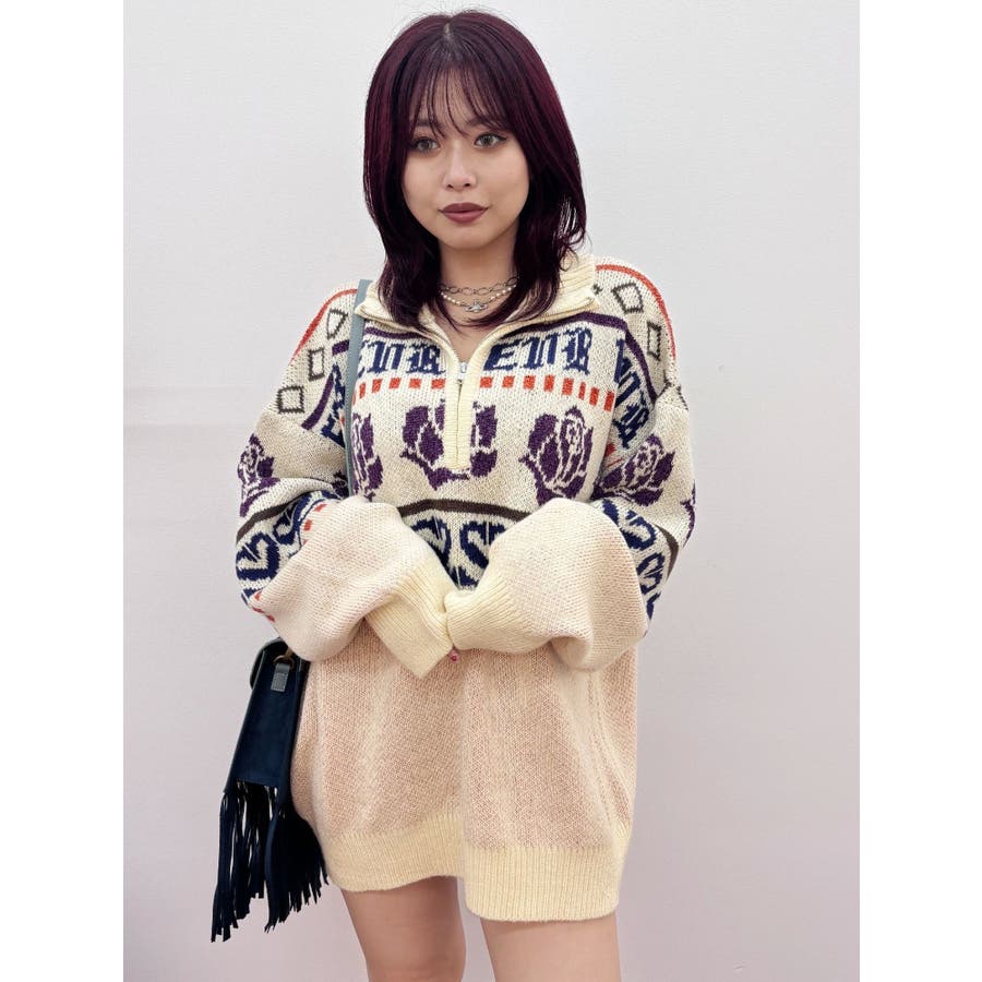 モールヤーンとモヘアタッチ素材を組み合わせた、存在感抜群のジャガードニット。EVRIS(エヴリス)らしいオリジナルのグラフィックパターンが印象的で、コーディネートの主軸になる1着です。ゆったりとしたシルエットにハーフジップを加え、抜け感と着まわしやすさを両立。長めの着丈で、ボトムを選ばずワンピース風の着こなしも可能です。