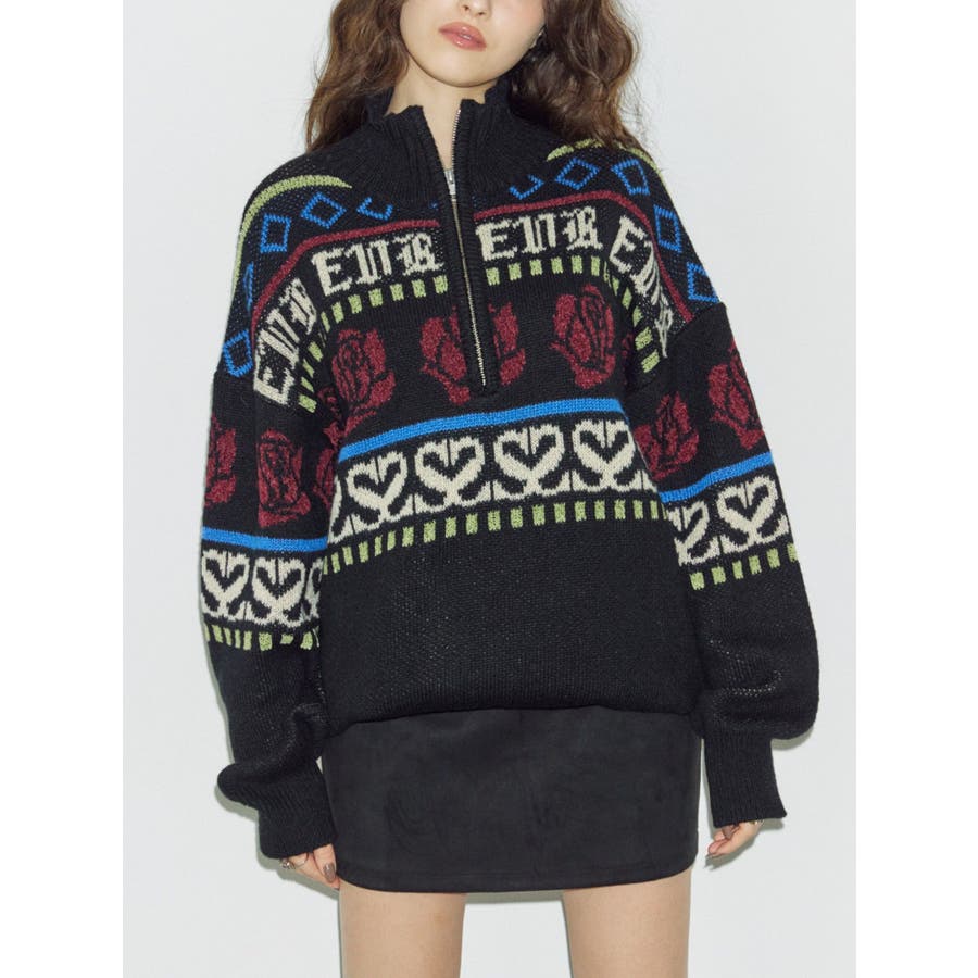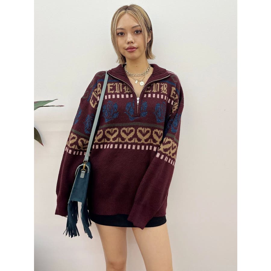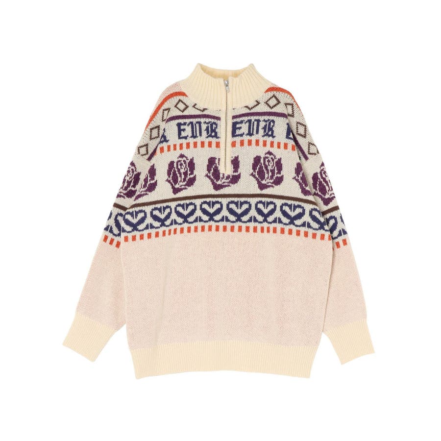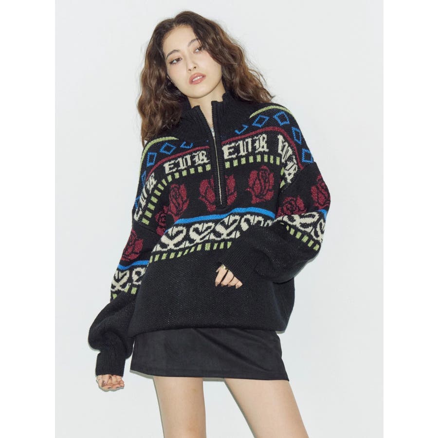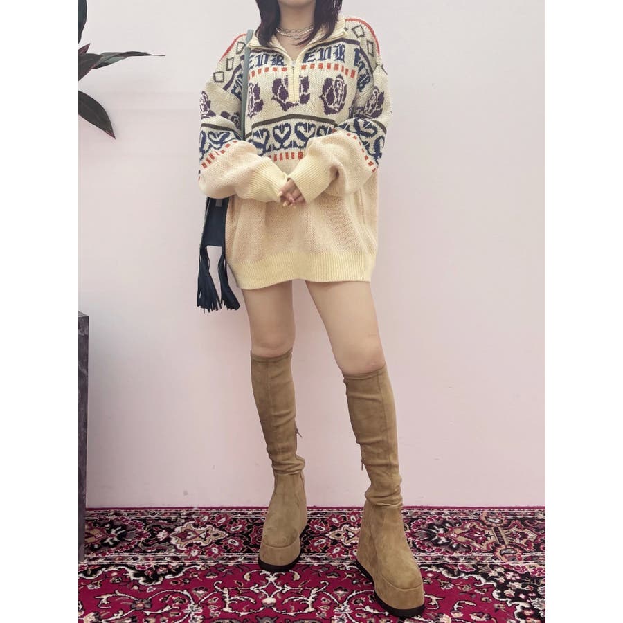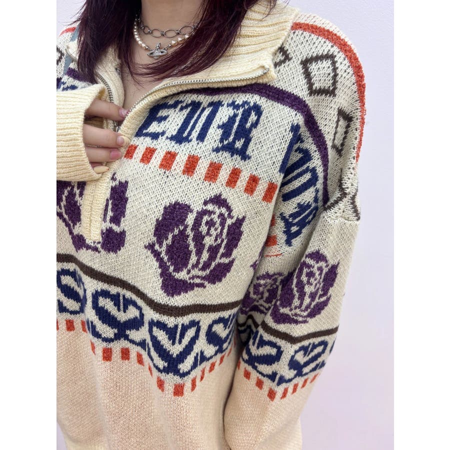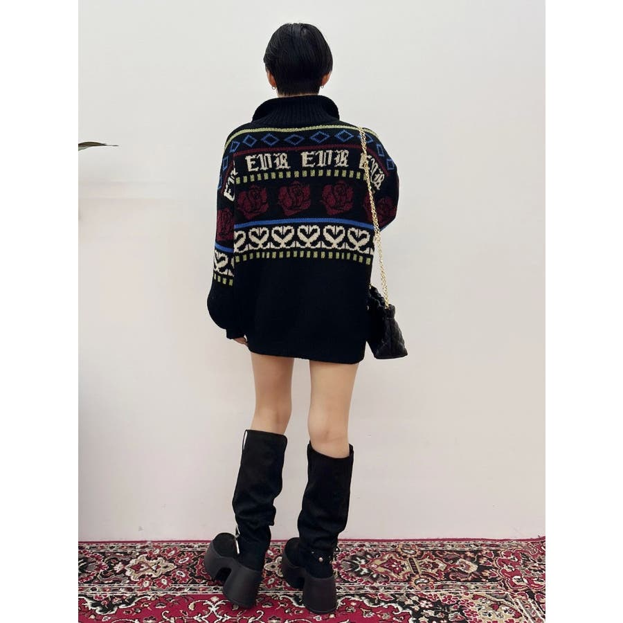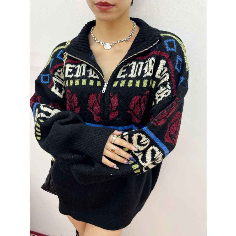 モールヤーンとモヘアタッチ素材を組み合わせた、存在感抜群のジャガードニット。EVRIS(エヴリス)らしいオリジナルのグラフィックパターンが印象的で、コーディネートの主軸になる1着です。ゆったりとしたシルエットにハーフジップを加え、抜け感と着まわしやすさを両立。長めの着丈で、ボトムを選ばずワンピース風の着こなしも可能です。
