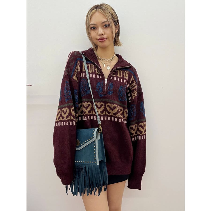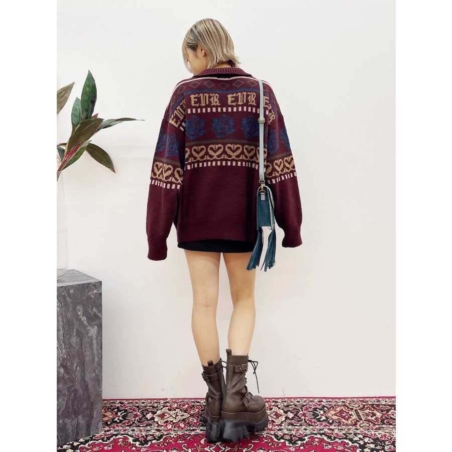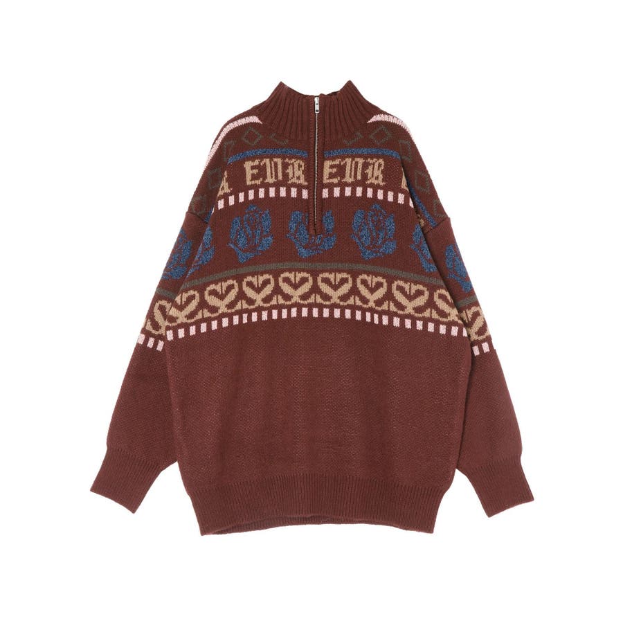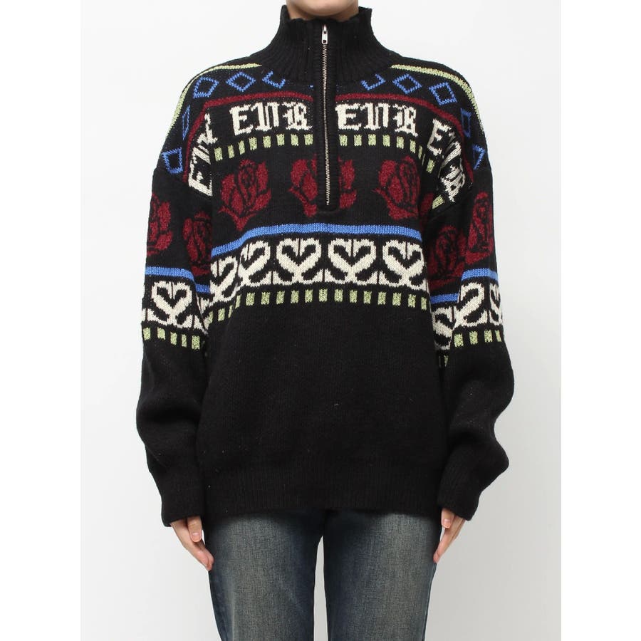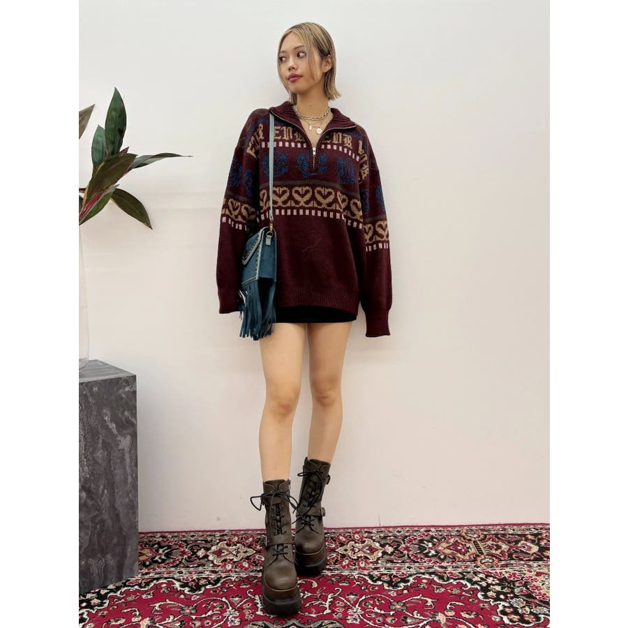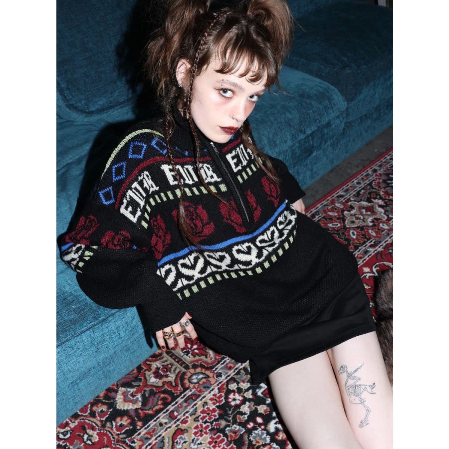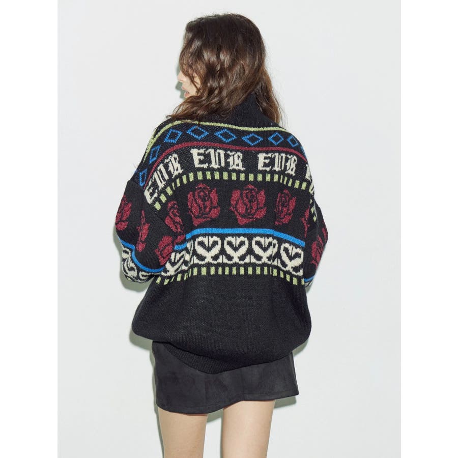 モールヤーンとモヘアタッチ素材を組み合わせた、存在感抜群のジャガードニット。EVRIS(エヴリス)らしいオリジナルのグラフィックパターンが印象的で、コーディネートの主軸になる1着です。ゆったりとしたシルエットにハーフジップを加え、抜け感と着まわしやすさを両立。長めの着丈で、ボトムを選ばずワンピース風の着こなしも可能です。