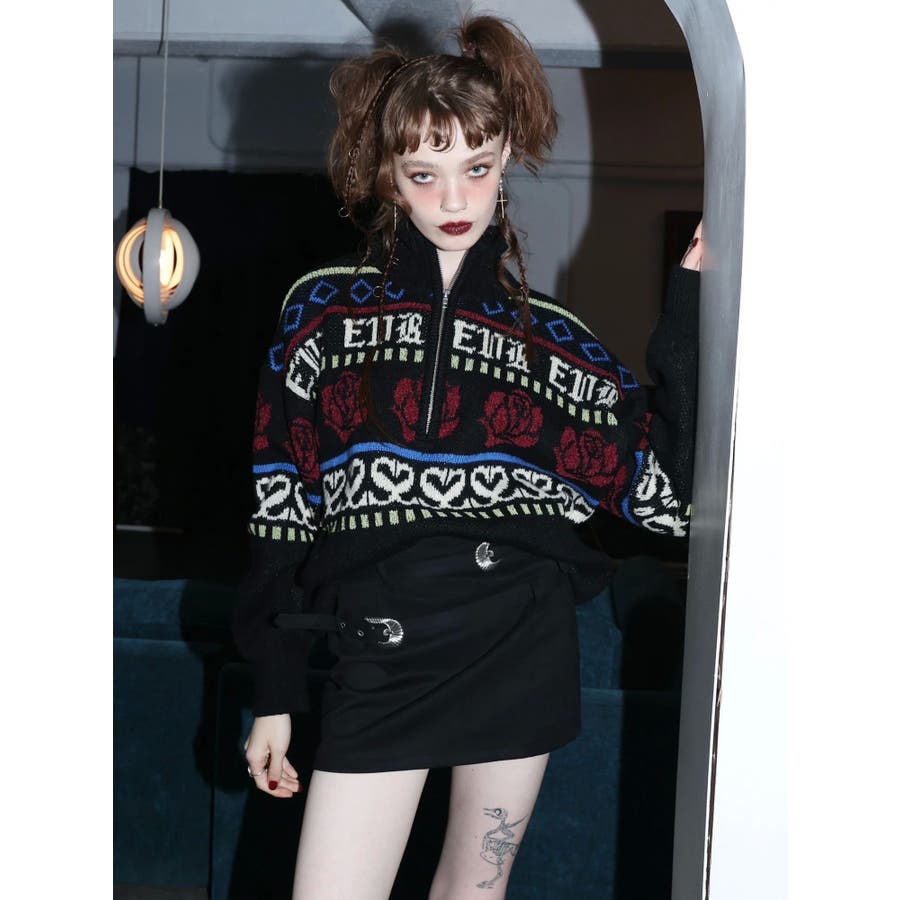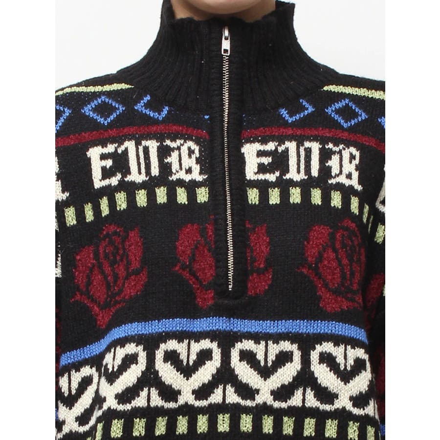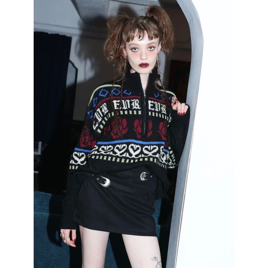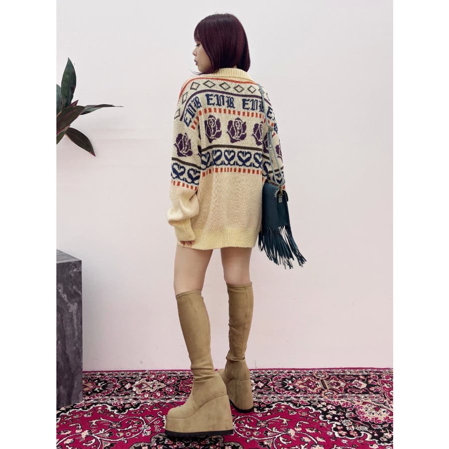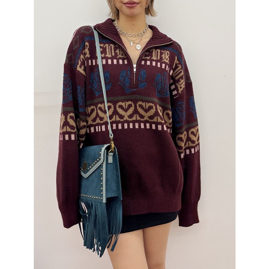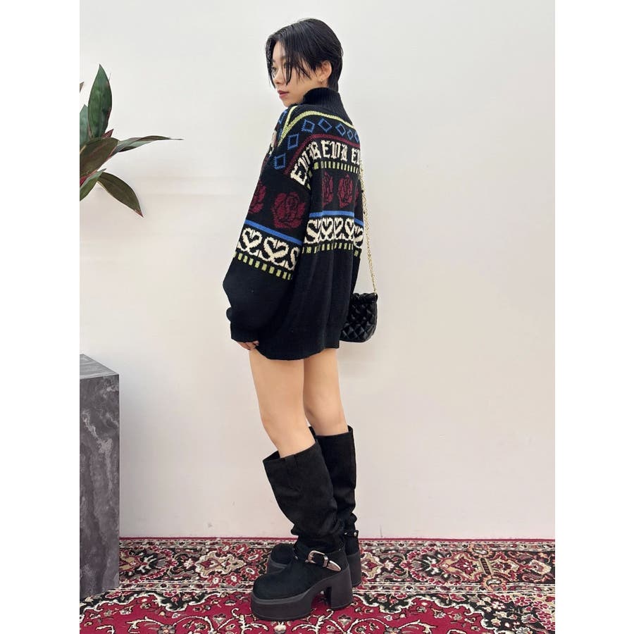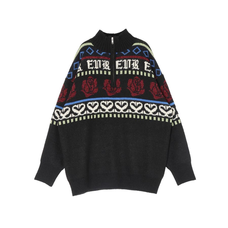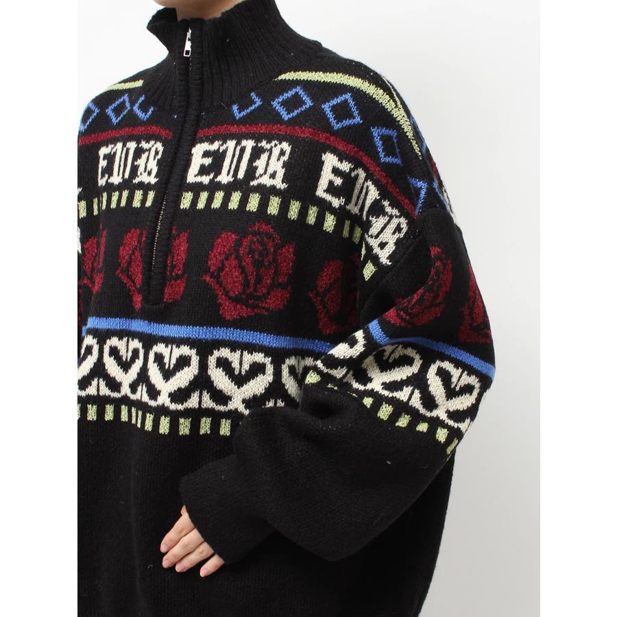 モールヤーンとモヘアタッチ素材を組み合わせた、存在感抜群のジャガードニット。EVRIS(エヴリス)らしいオリジナルのグラフィックパターンが印象的で、コーディネートの主軸になる1着です。ゆったりとしたシルエットにハーフジップを加え、抜け感と着まわしやすさを両立。長めの着丈で、ボトムを選ばずワンピース風の着こなしも可能です。