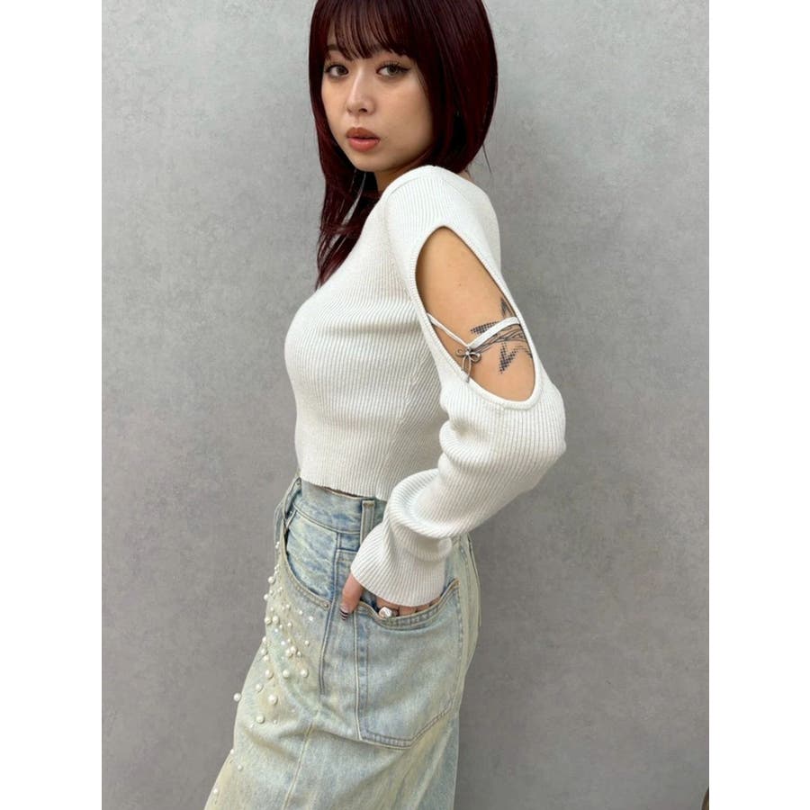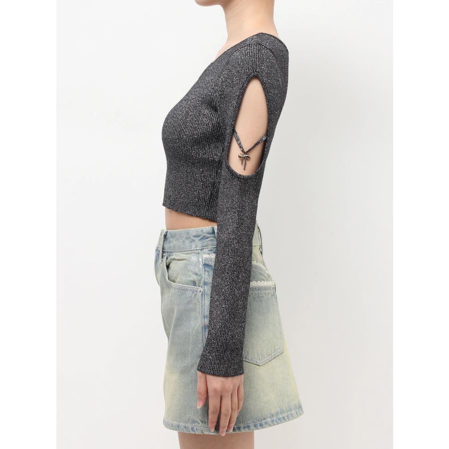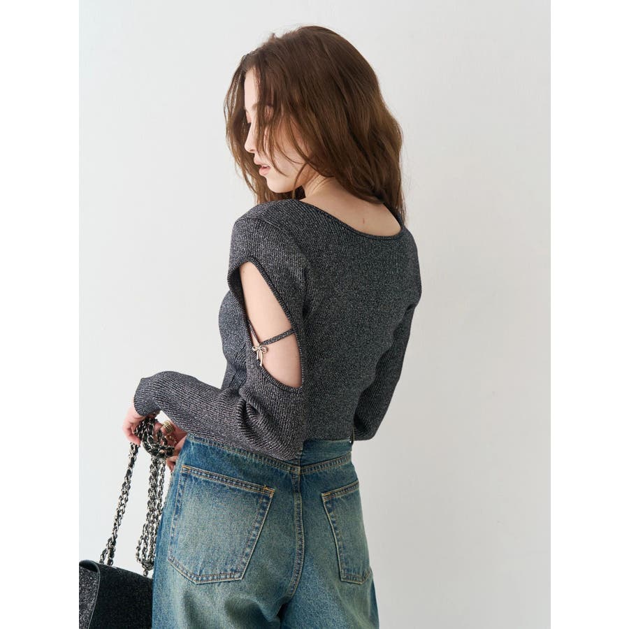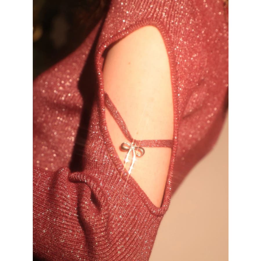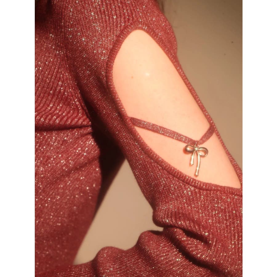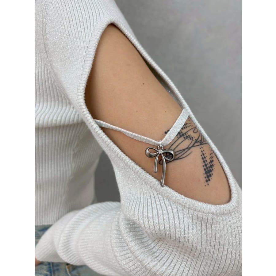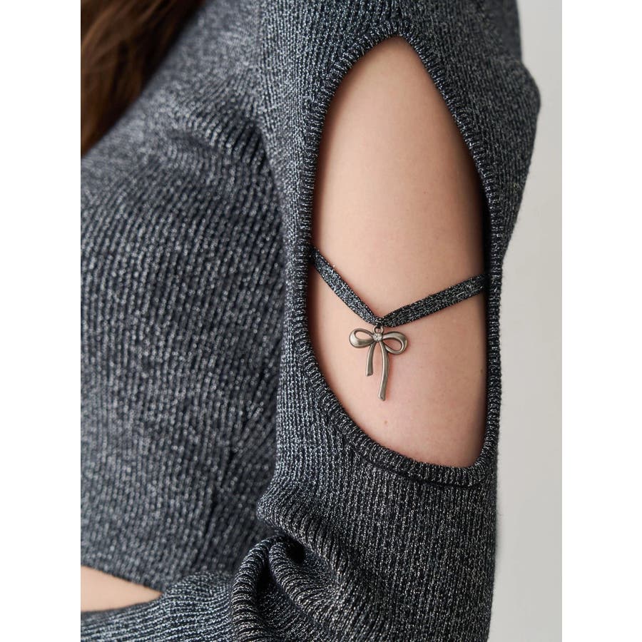 さり気ない袖の肌見せ、リボンのチャームが