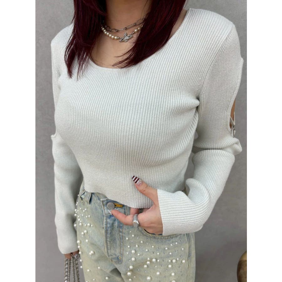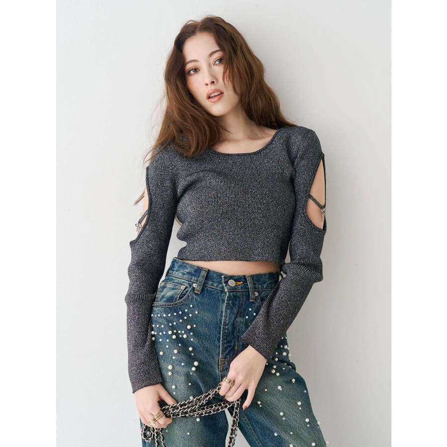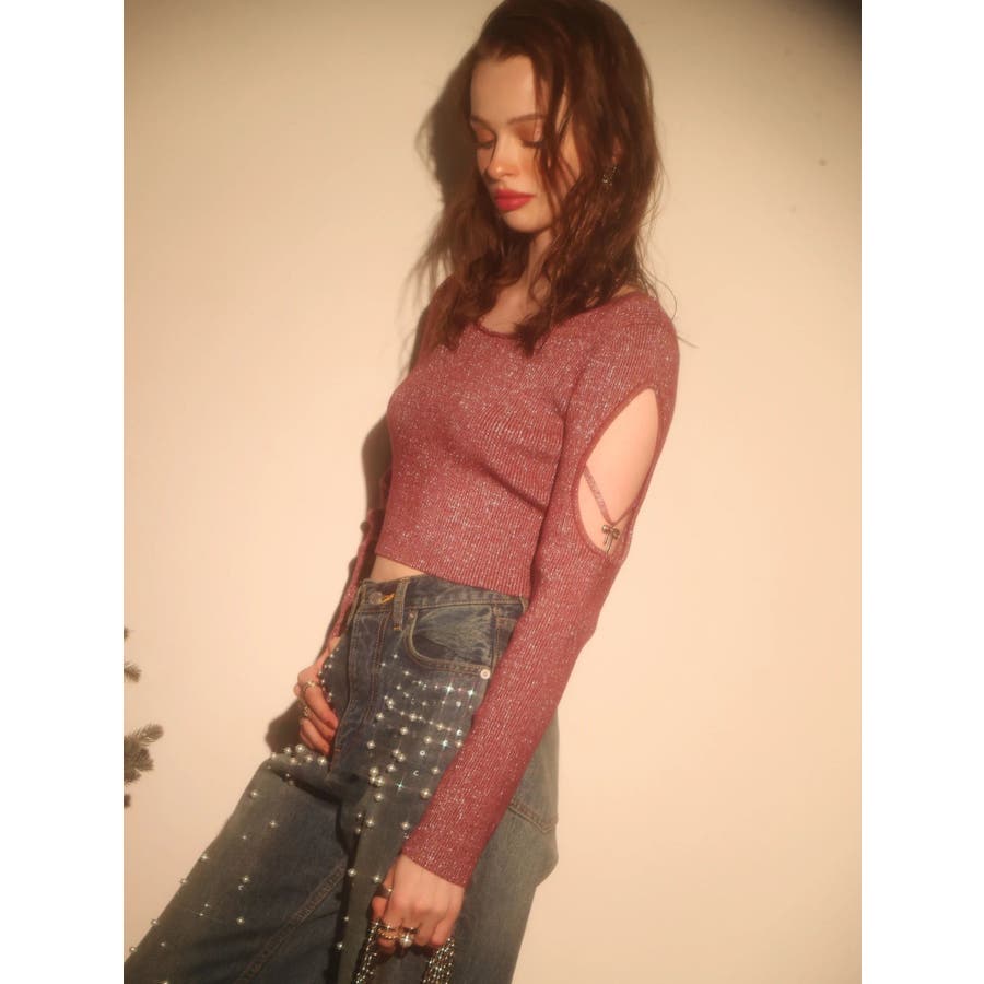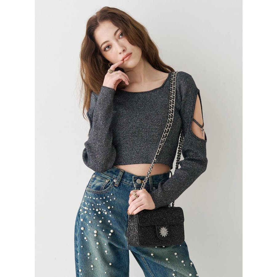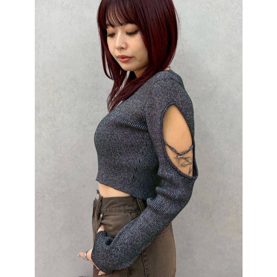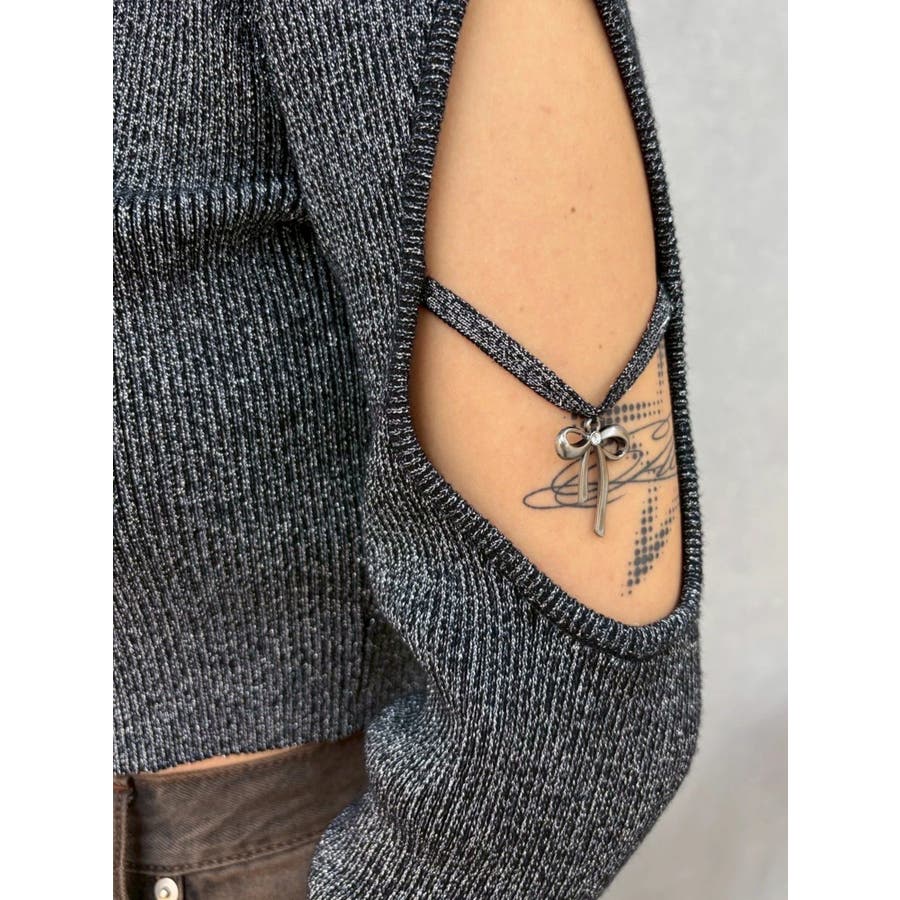オープンアームラメチャームニットトップス