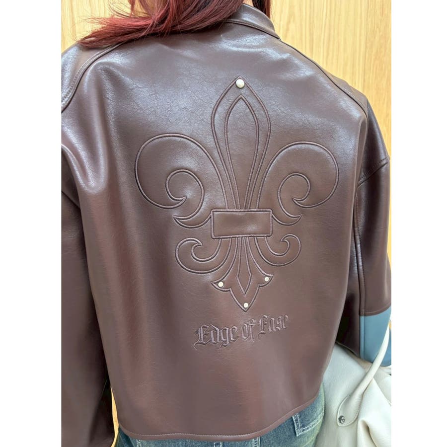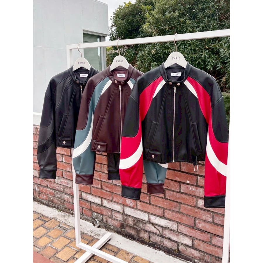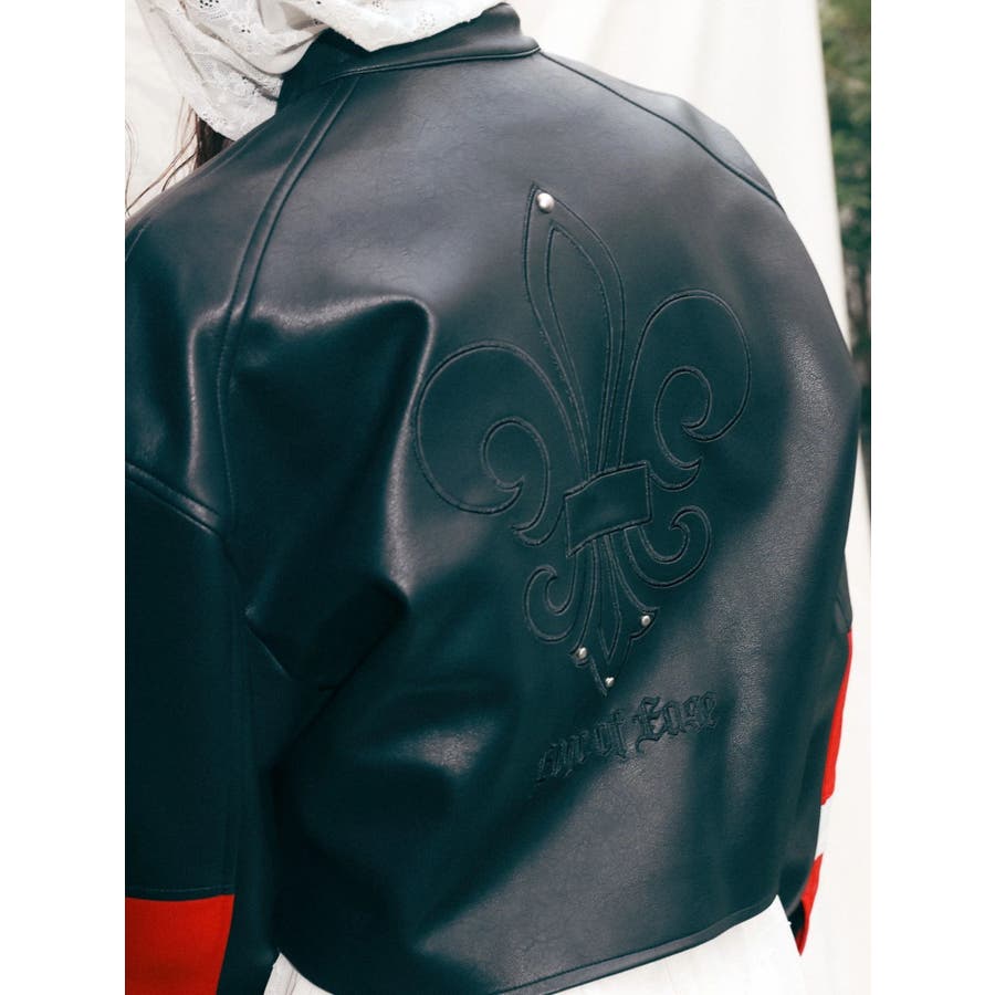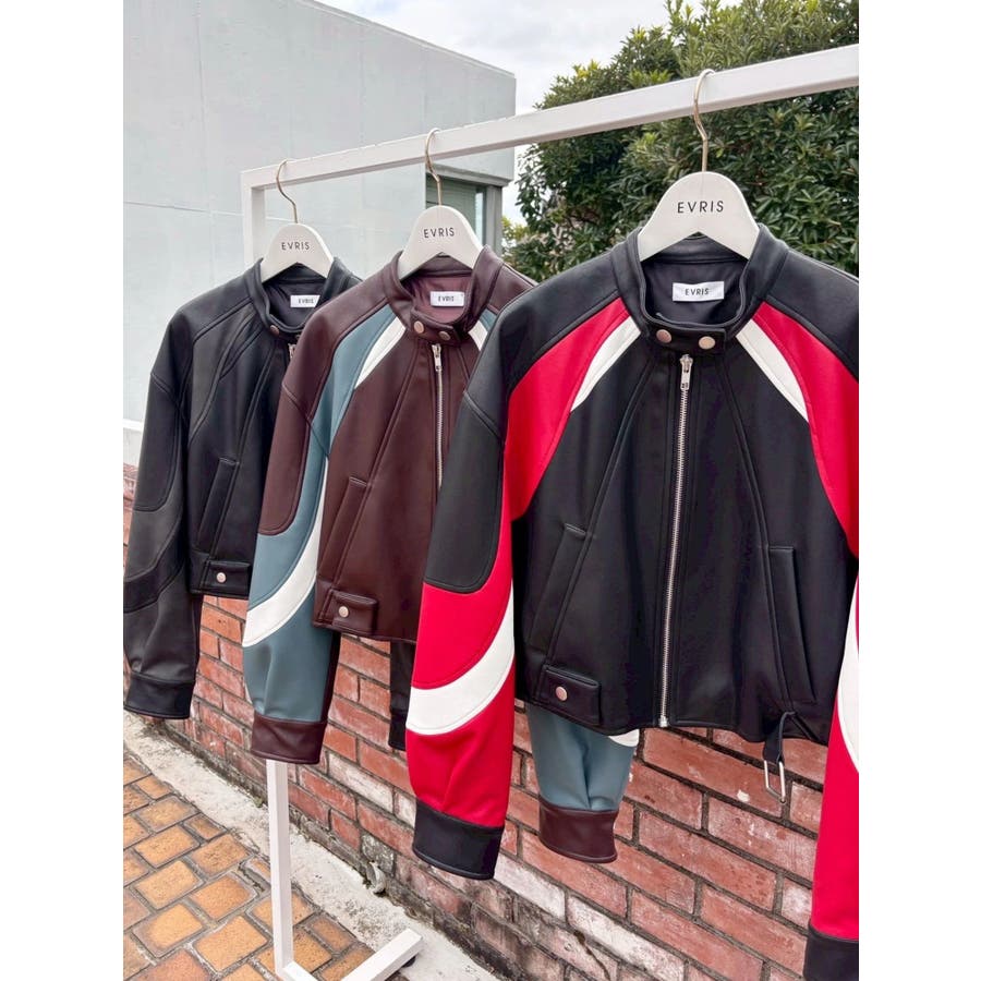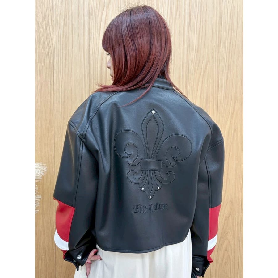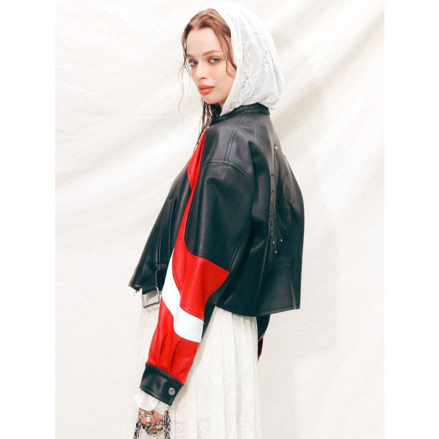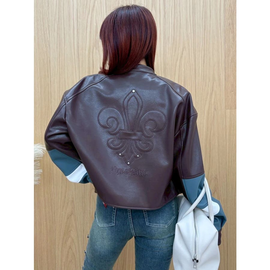 ■デザインオリジナルのエンブレムを背面にパッチワークしたインパクトのあるデザインのアウターです。袖部分を配色のデザインにしておりEVRISにしかないデザインに仕上がっています。柔らかく着心地の良い合皮素材を使用しています。ブラックも異素材の微配色の素材を使用しておりこなれ感のある色合いです。裾のベルトは調整用ではなく、デザインとして付けています。■スタイリングあえてフェミニンなワンピースやトップスと合わせるスタイリングがおすすめです。■セットアップアイテム >>フェイクレザーベルトミニスカート--------------透け感:なし裏地:あり生地の厚み:普通伸縮性:なし--------------