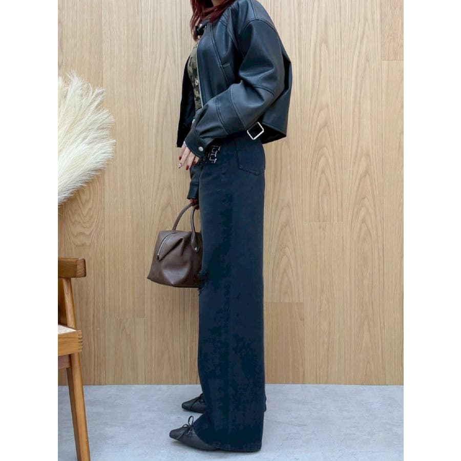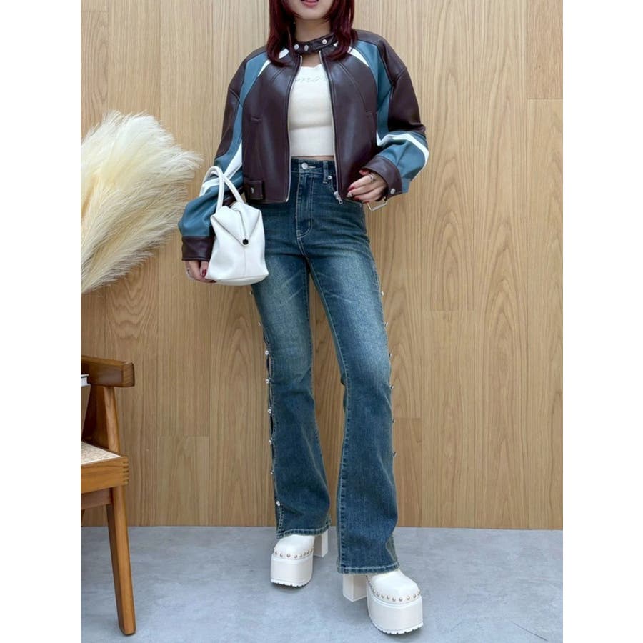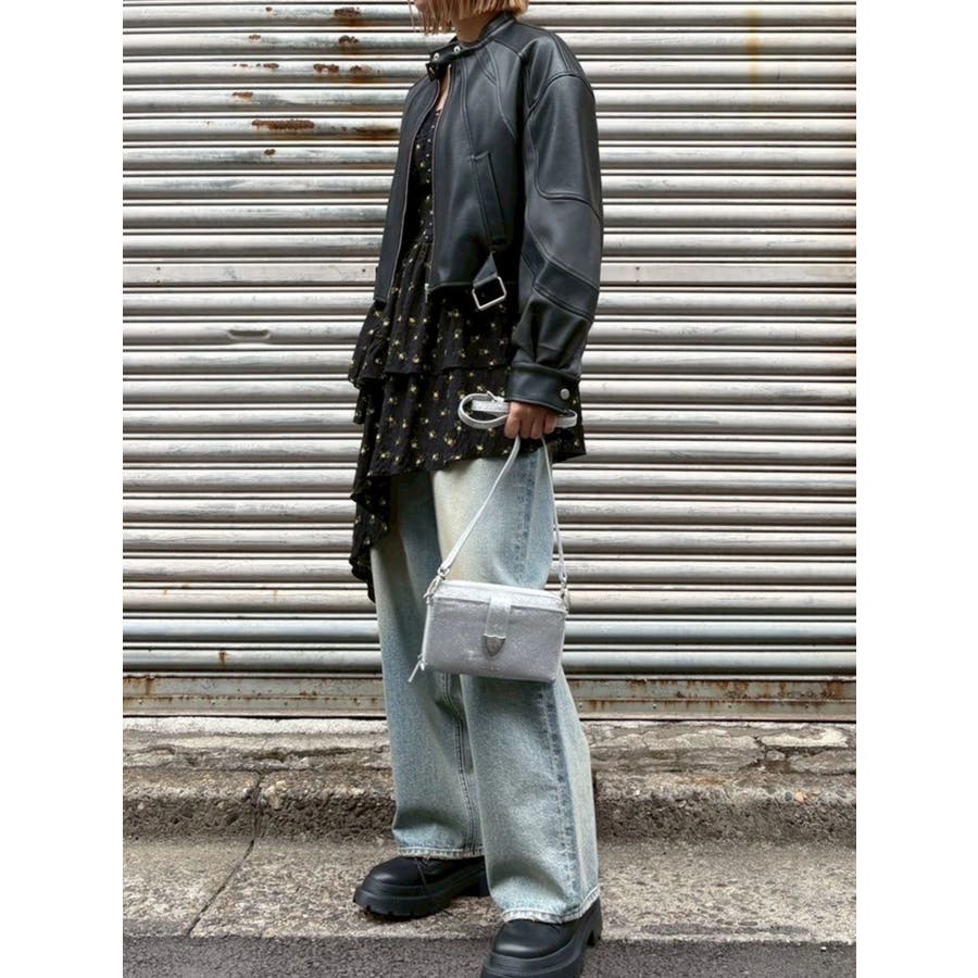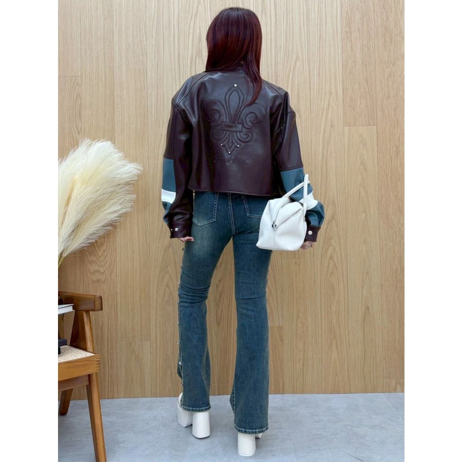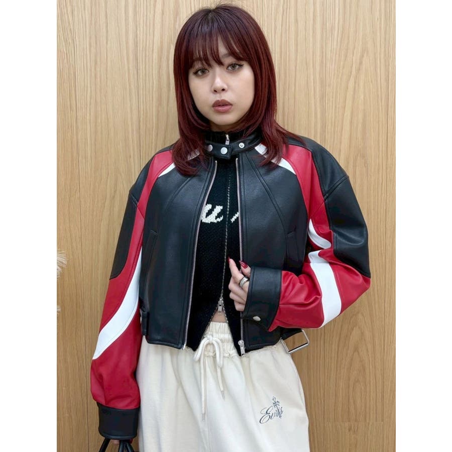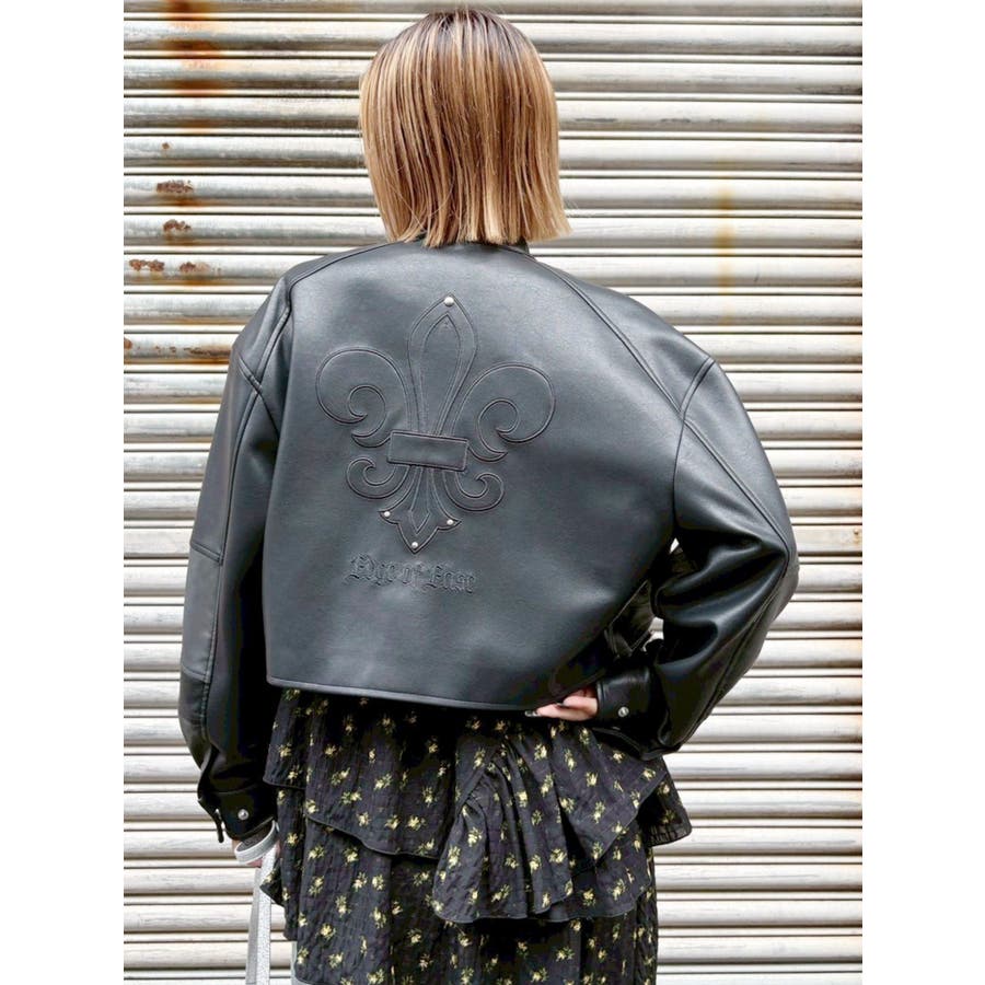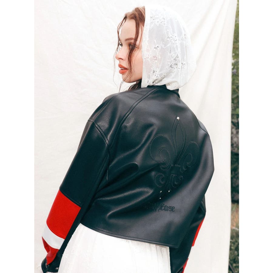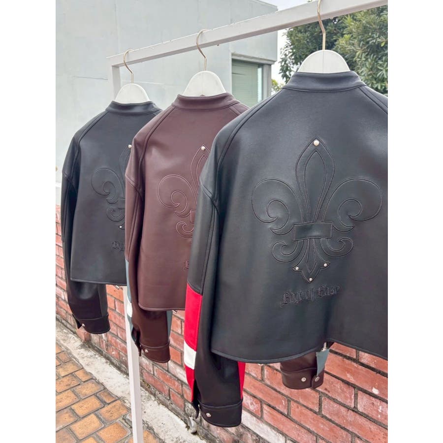 ■デザインオリジナルのエンブレムを背面にパッチワークしたインパクトのあるデザインのアウターです。袖部分を配色のデザインにしておりEVRISにしかないデザインに仕上がっています。柔らかく着心地の良い合皮素材を使用しています。ブラックも異素材の微配色の素材を使用しておりこなれ感のある色合いです。裾のベルトは調整用ではなく、デザインとして付けています。■スタイリングあえてフェミニンなワンピースやトップスと合わせるスタイリングがおすすめです。■セットアップアイテム >>フェイクレザーベルトミニスカート--------------透け感:なし裏地:あり生地の厚み:普通伸縮性:なし--------------