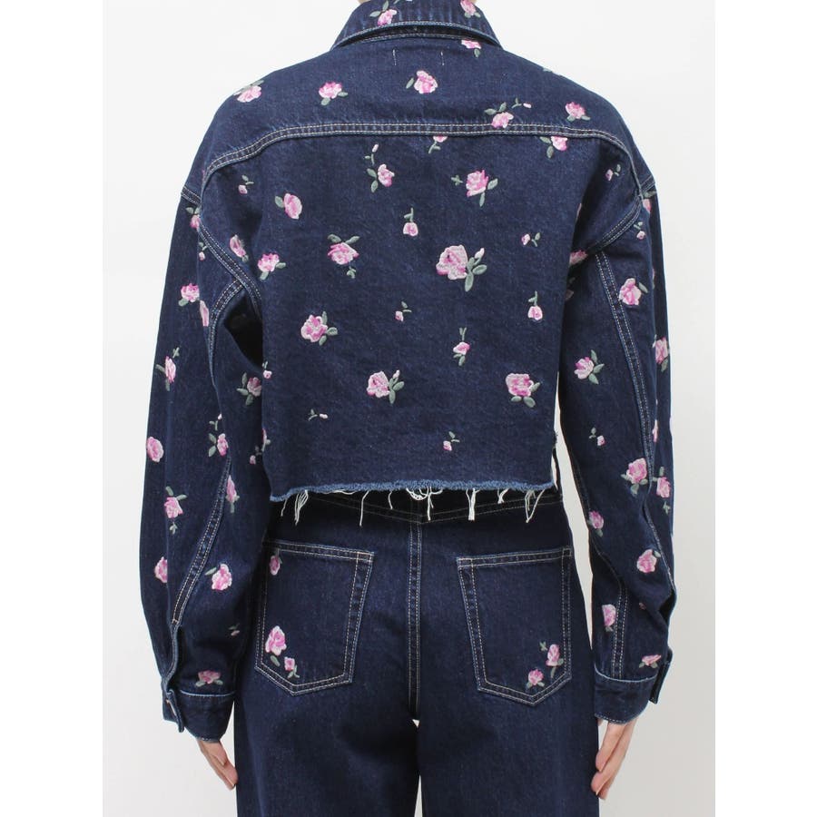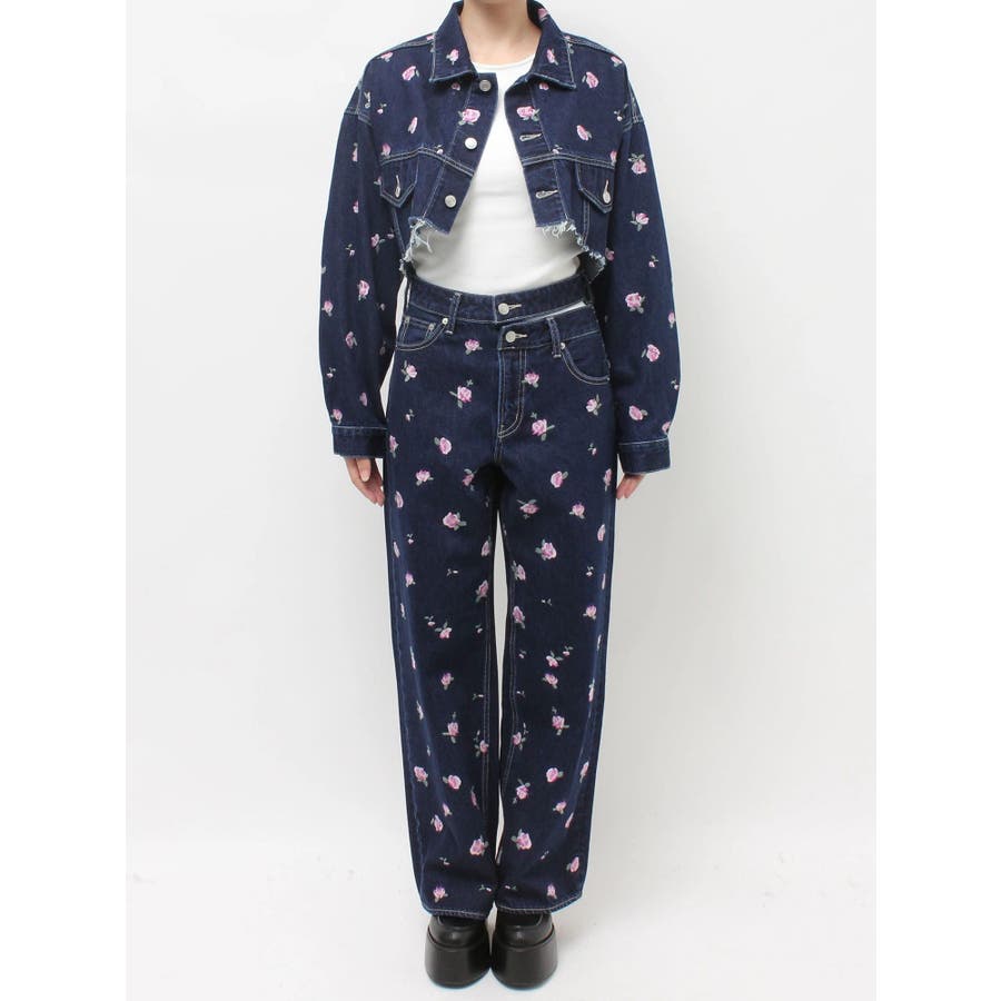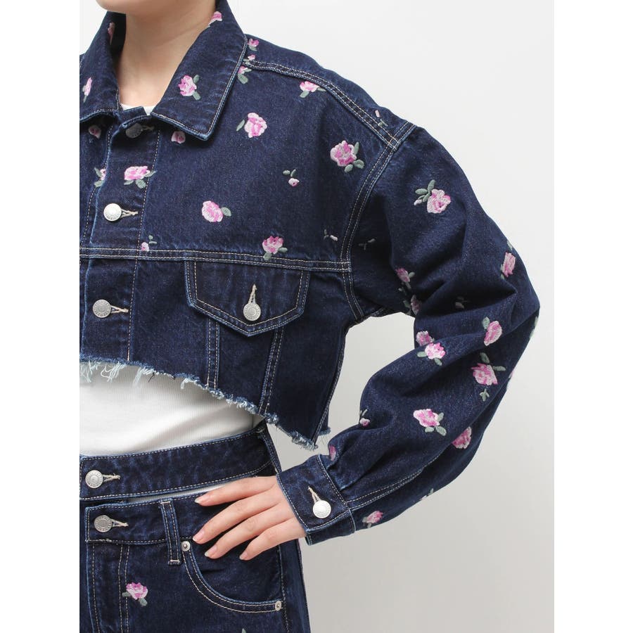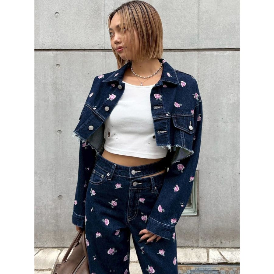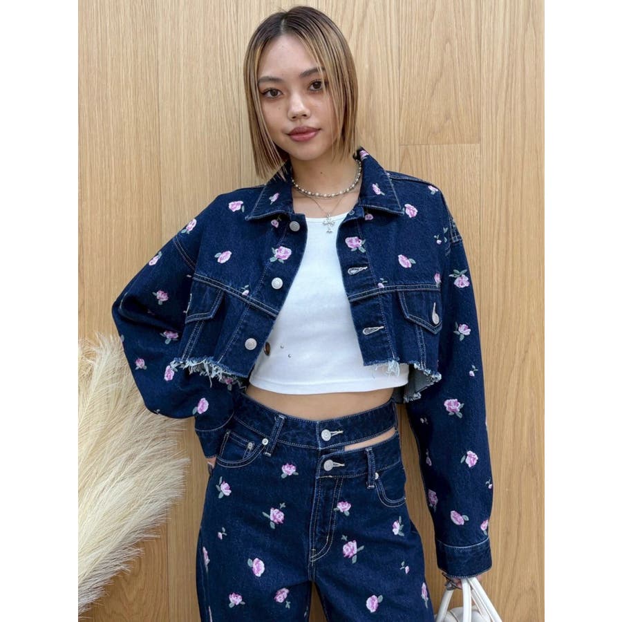 オリジナル小花柄を全体に刺繍したデニムブルゾンです。春らしいカラー展開と、前身裾のカーブで前後差をつけたのがデザインポイントです。インパクトのある1枚で、同じシリーズでワイドパンツも用意しております。セットアップがおすすめスタイリングです。