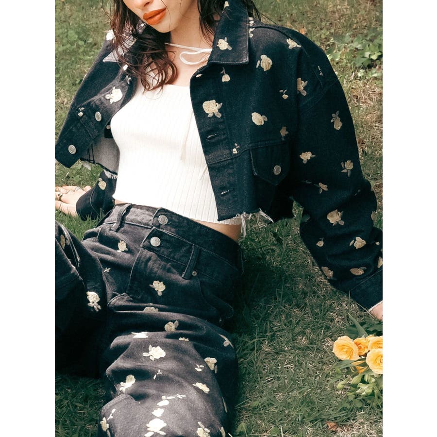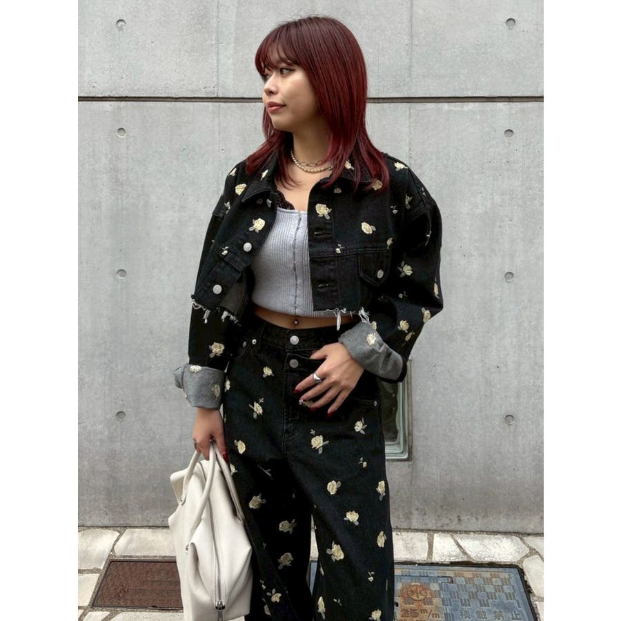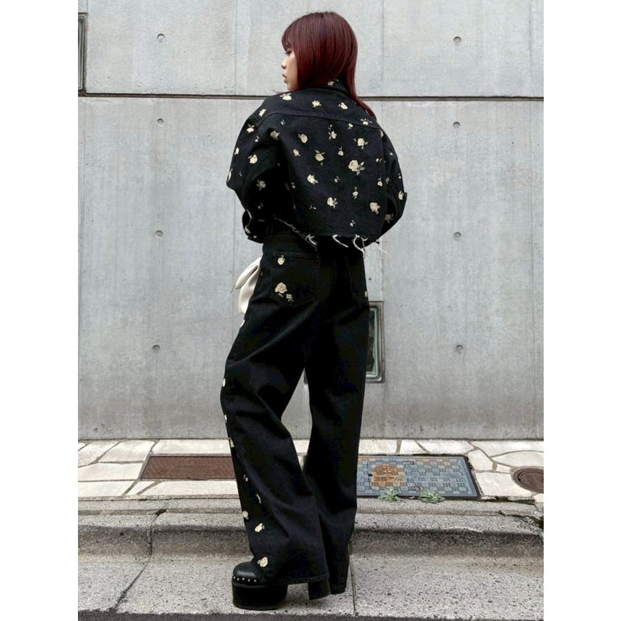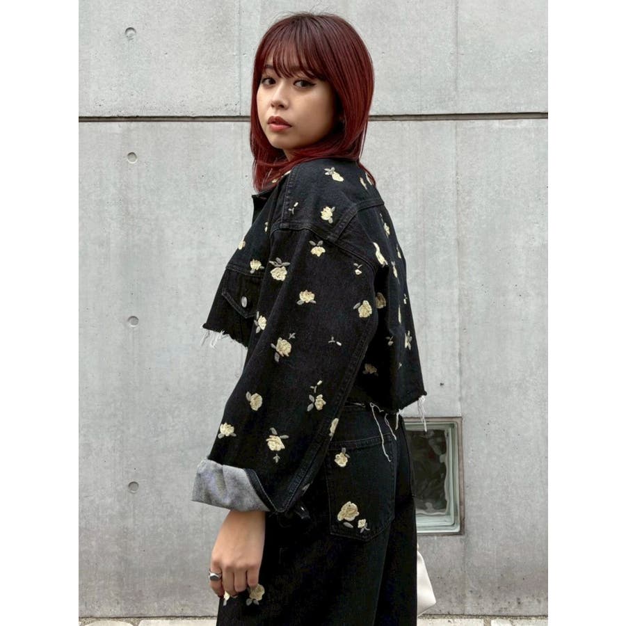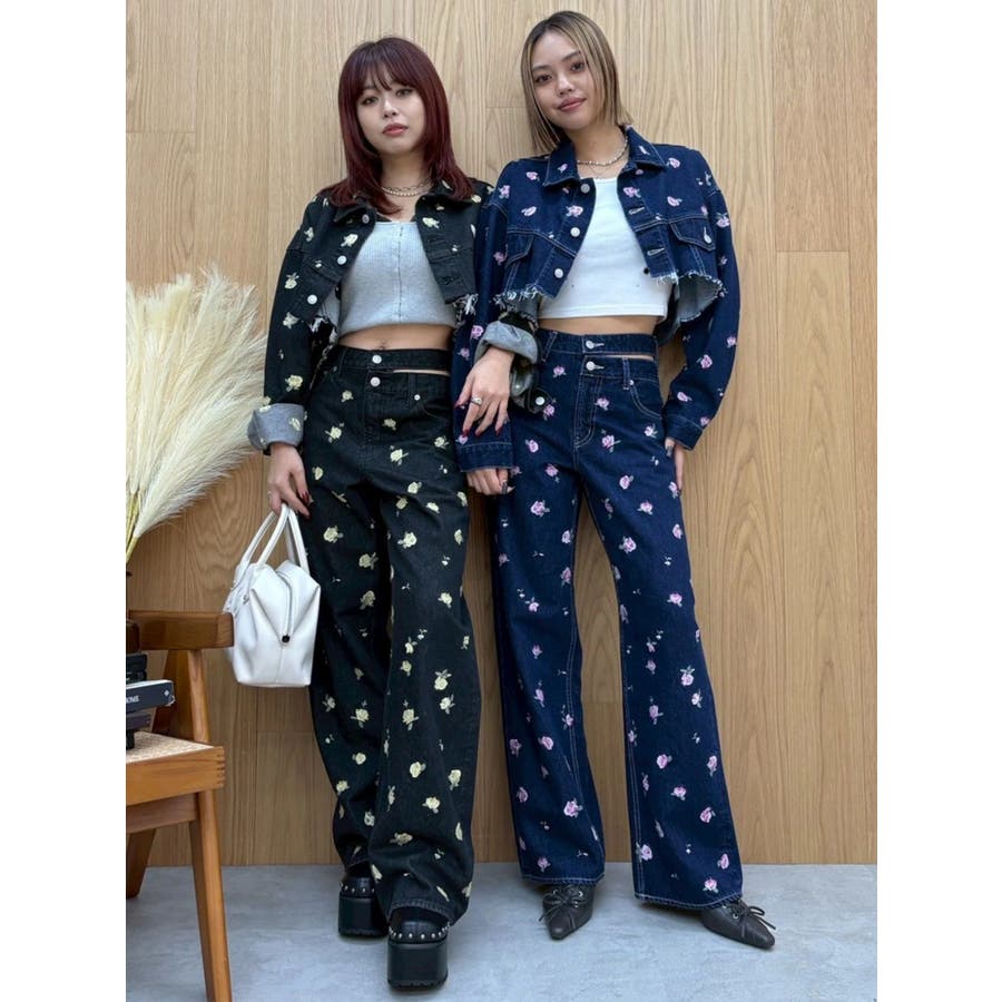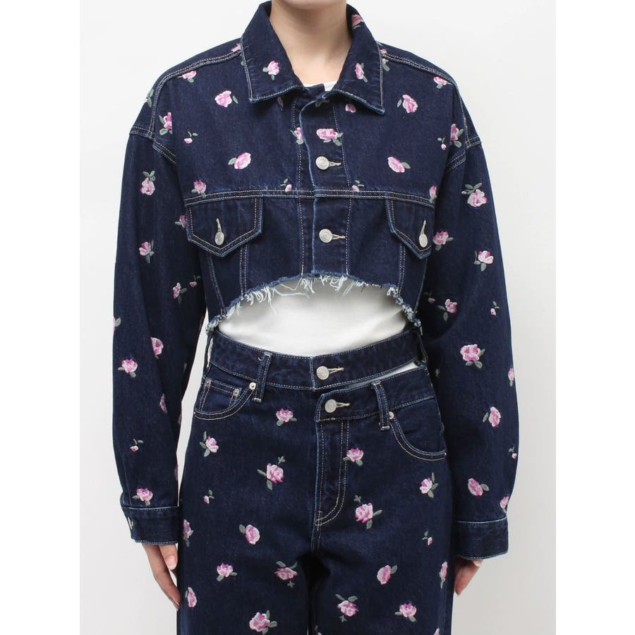 オリジナル小花柄を全体に刺繍したデニムブルゾンです。春らしいカラー展開と、前身裾のカーブで前後差をつけたのがデザインポイントです。インパクトのある1枚で、同じシリーズでワイドパンツも用意しております。セットアップがおすすめスタイリングです。