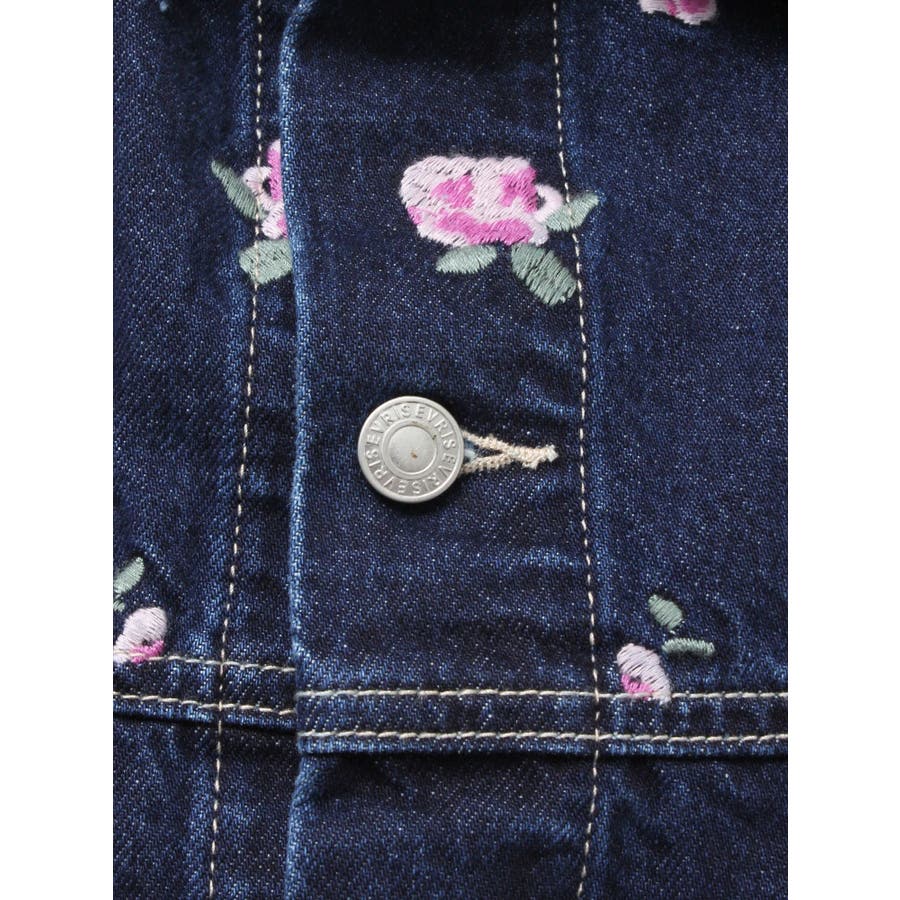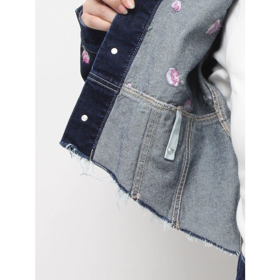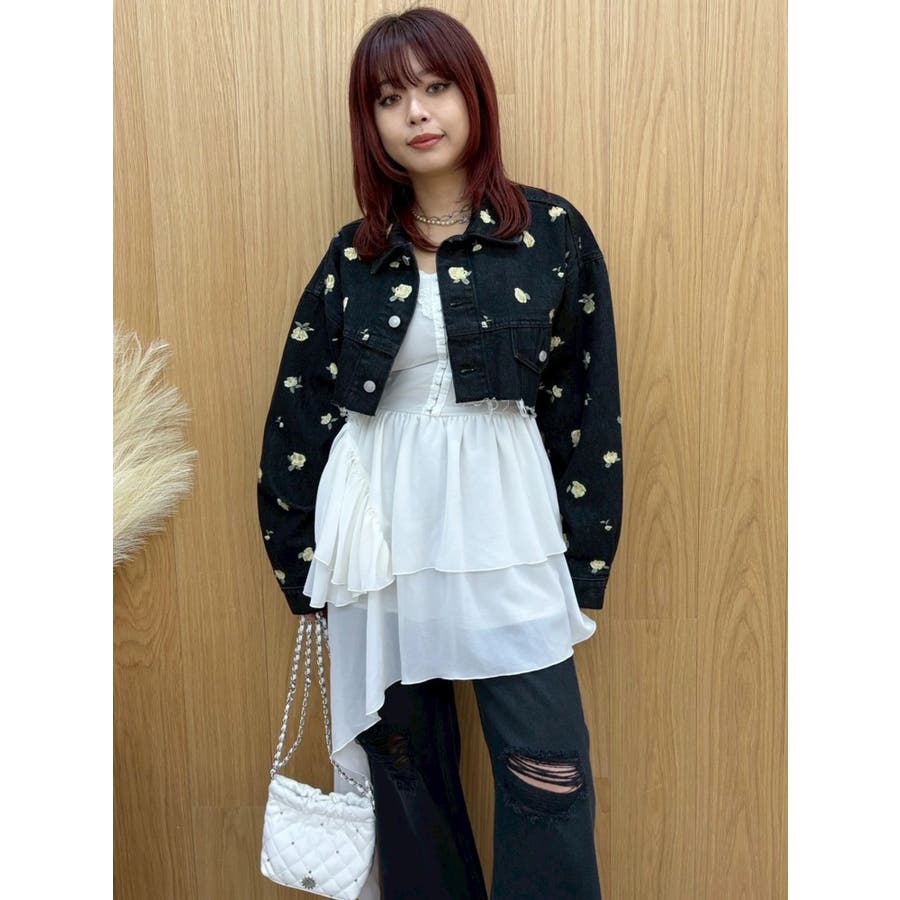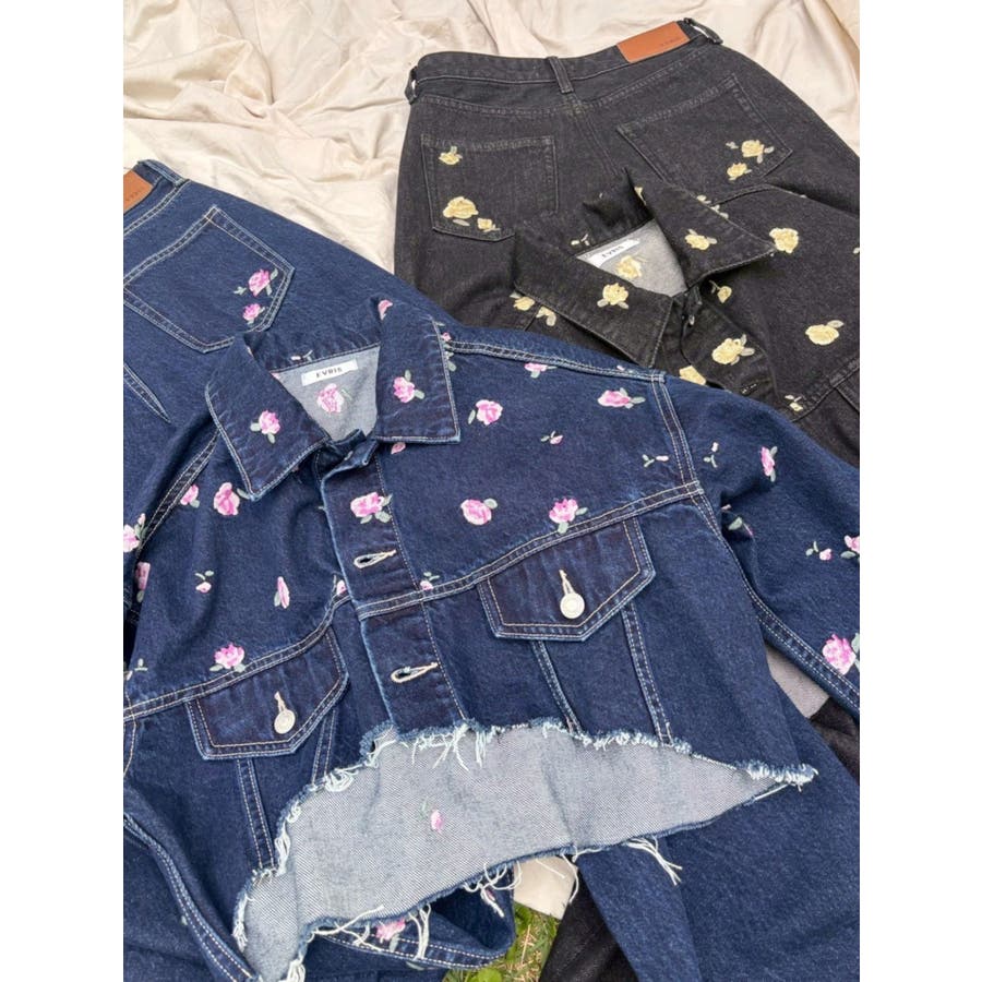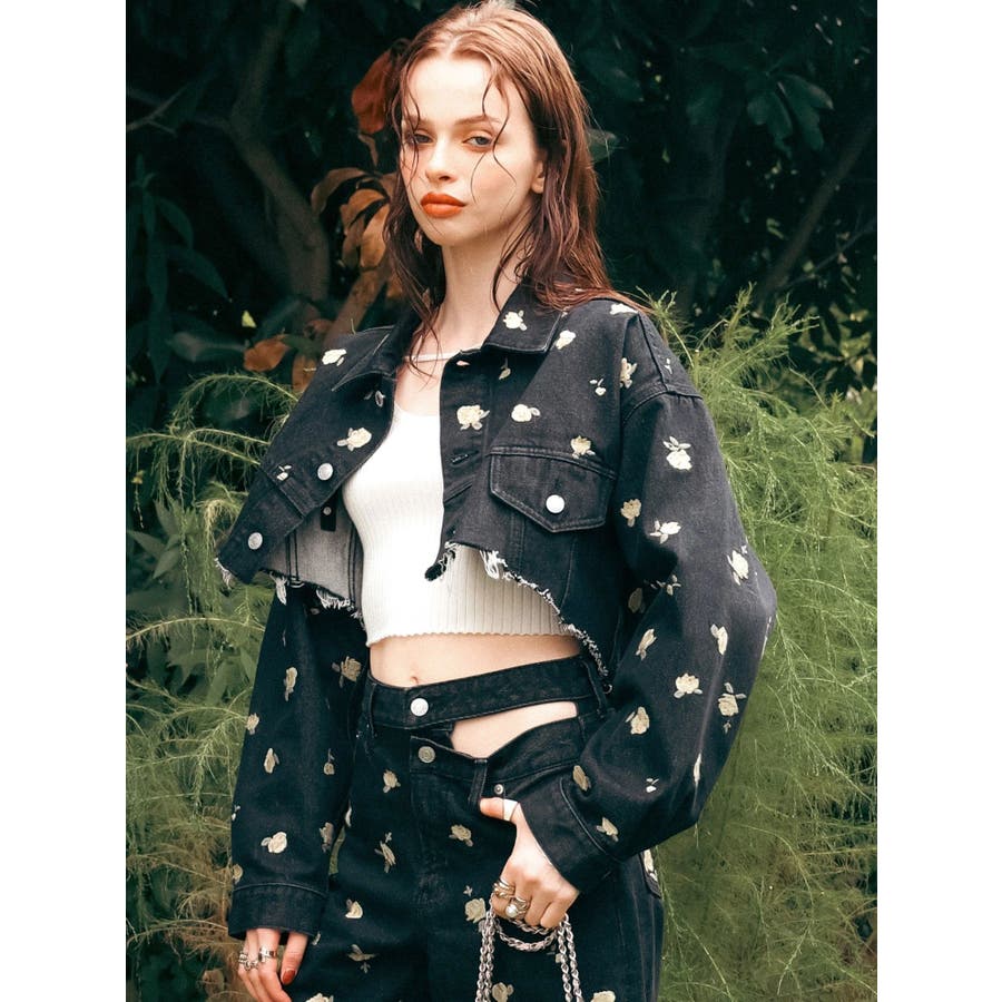 オリジナル小花柄を全体に刺繍したデニムブルゾンです。春らしいカラー展開と、前身裾のカーブで前後差をつけたのがデザインポイントです。インパクトのある1枚で、同じシリーズでワイドパンツも用意しております。セットアップがおすすめスタイリングです。