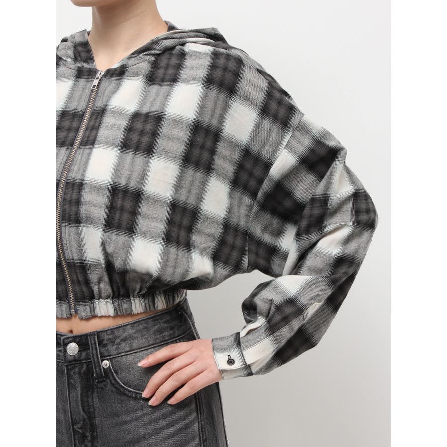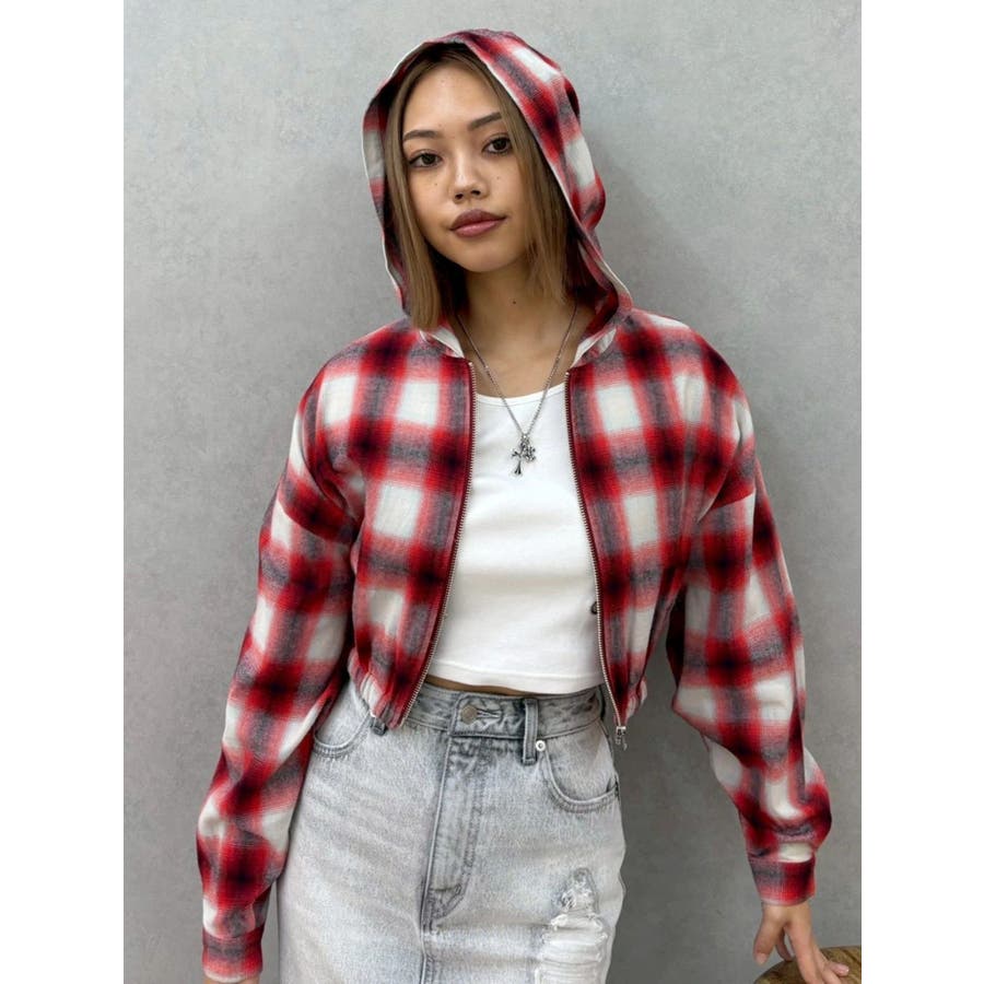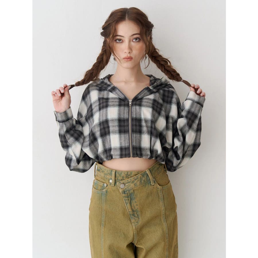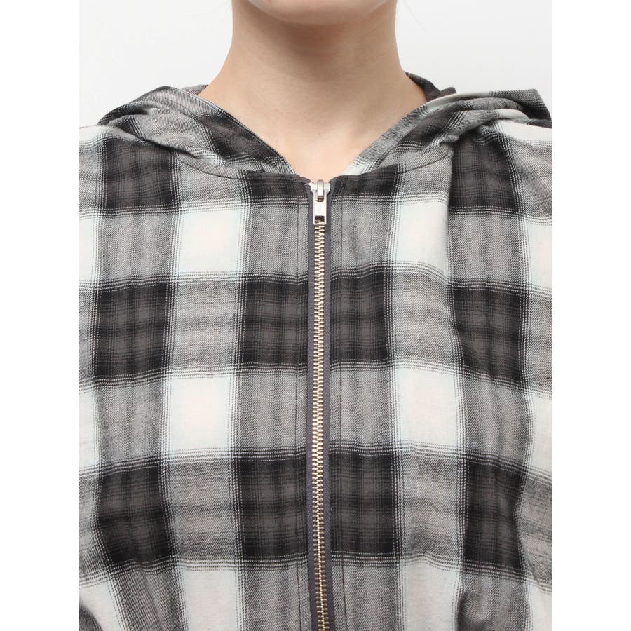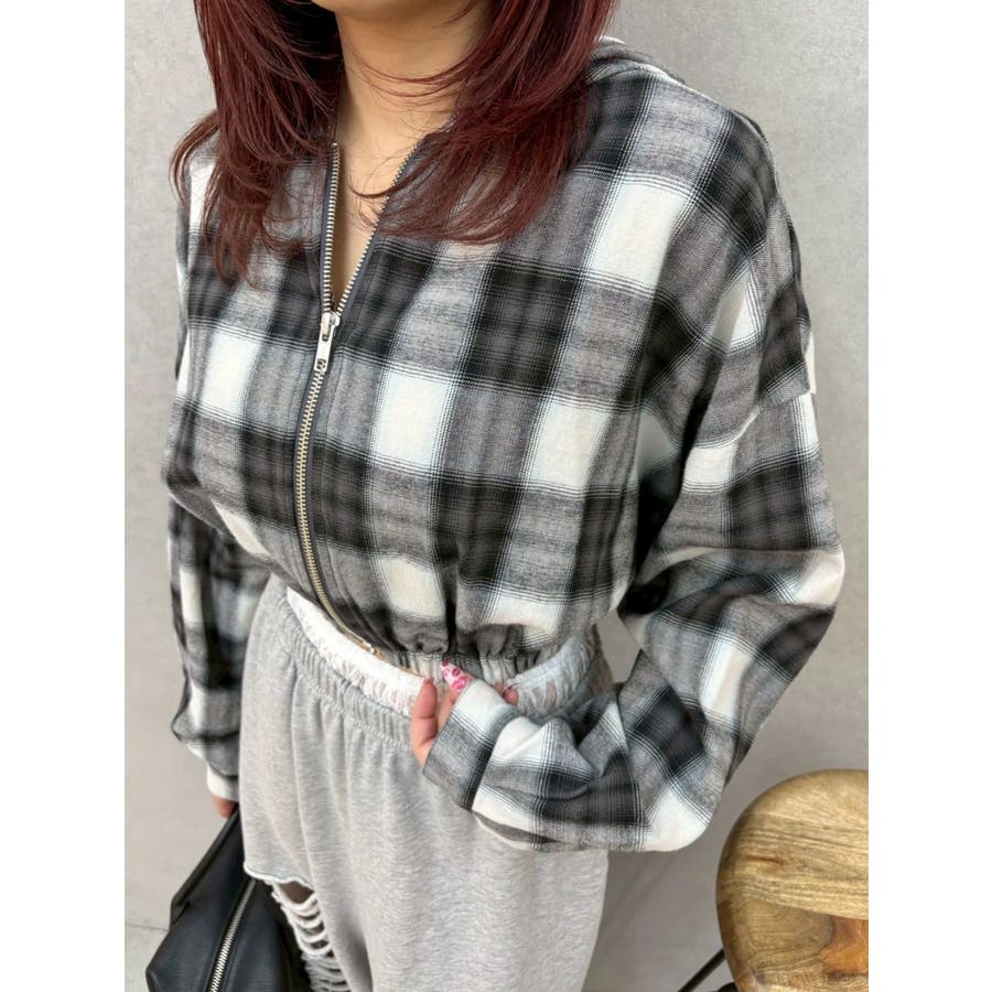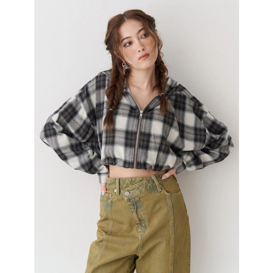 薄っすらとした水色が入ったチェックカラーが可愛いオンブレチェックのフード付きショートシャツです。裾が絞られたメリハリのあるデザインで、EVRIS(エヴリス)で人気のワイドデニム合わせがおすすめです。ジップアップなので、羽織としても着用できます。