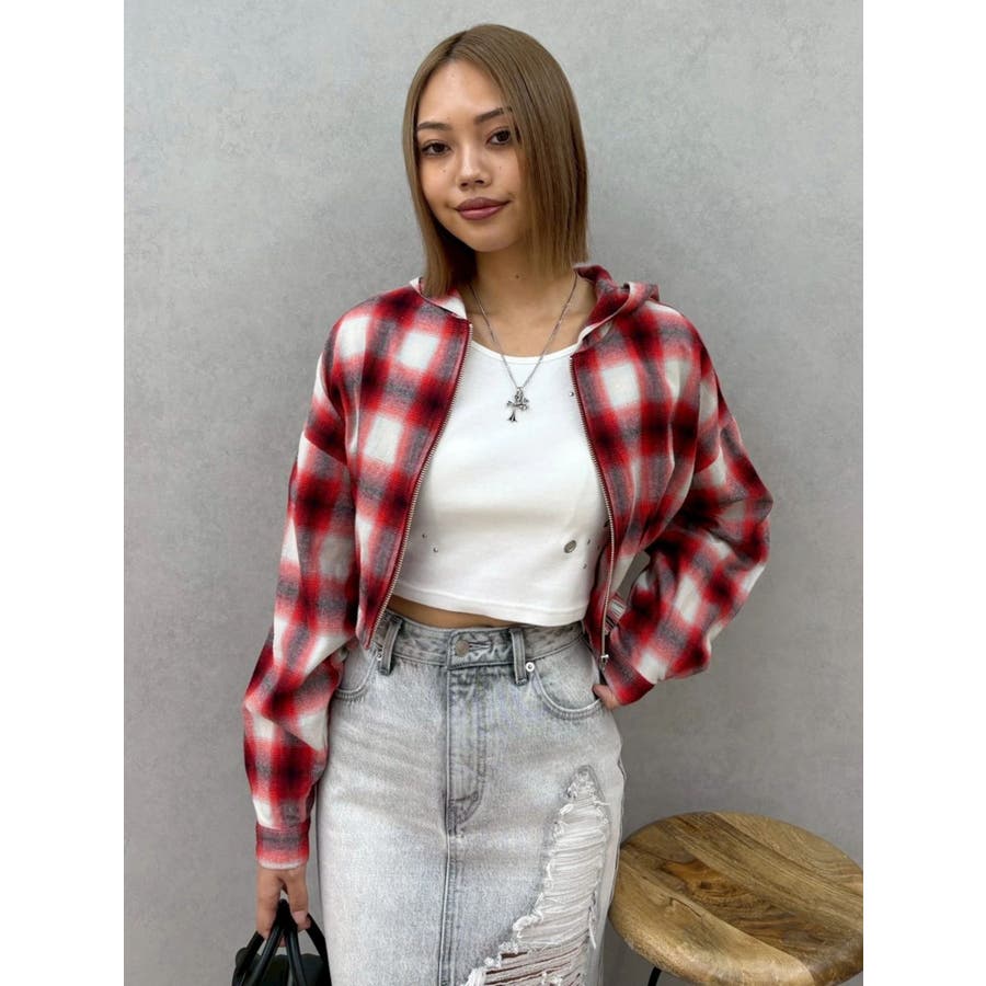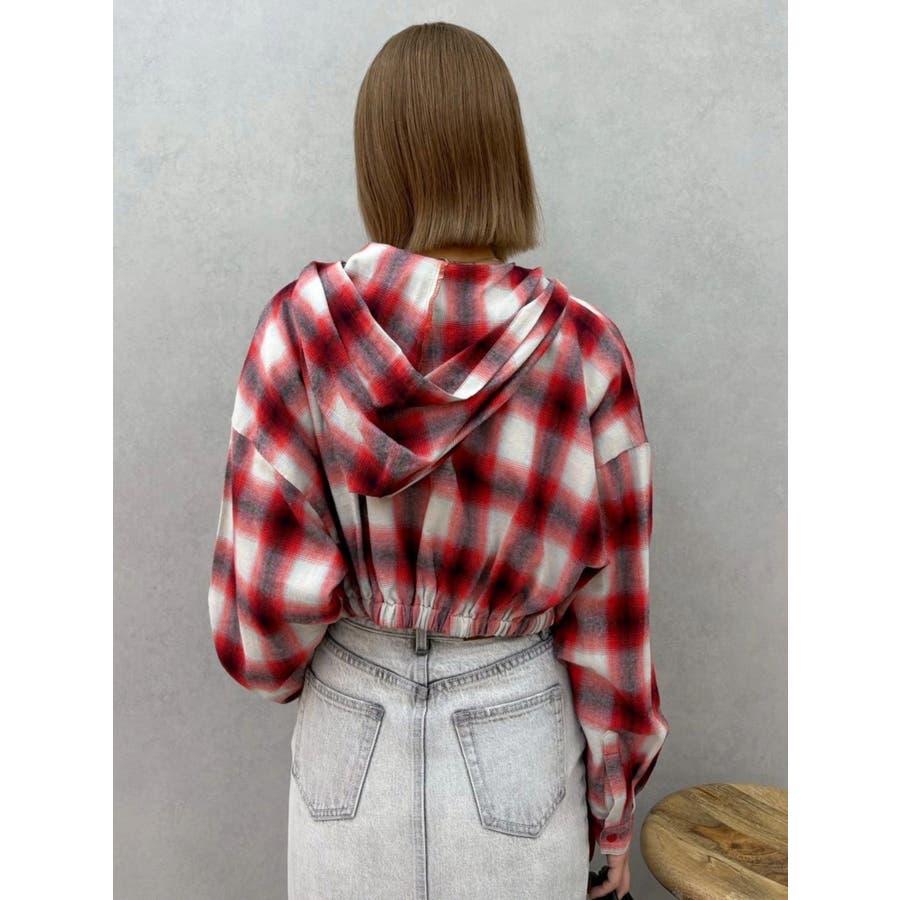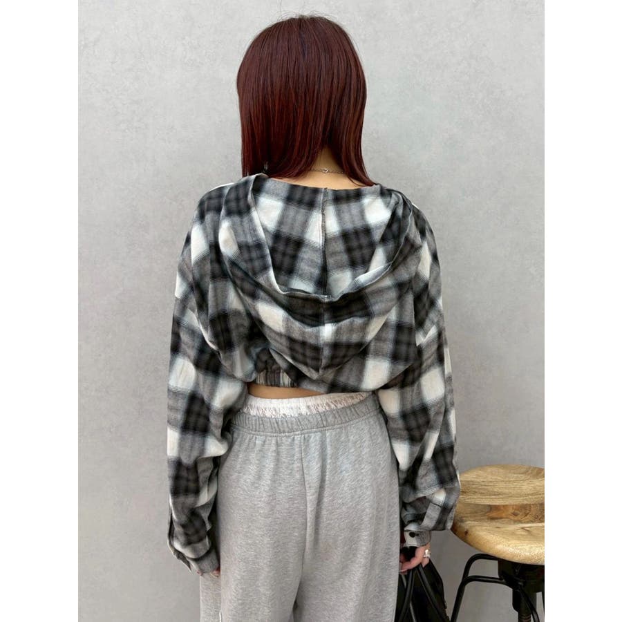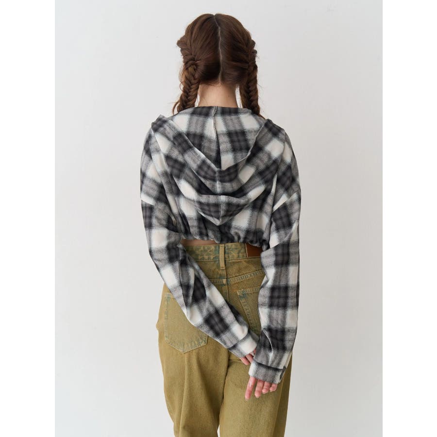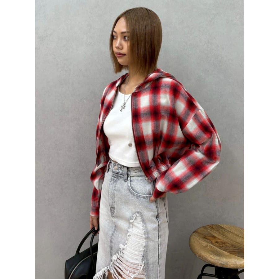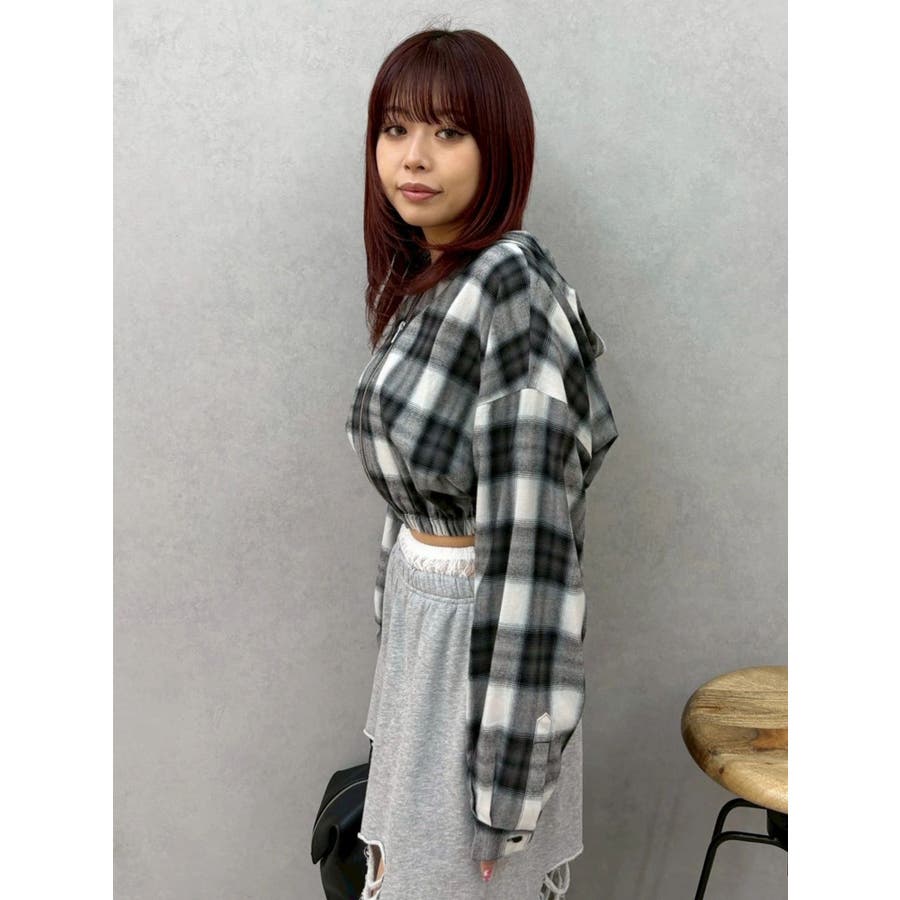 薄っすらとした水色が入ったチェックカラーが可愛いオンブレチェックのフード付きショートシャツです。裾が絞られたメリハリのあるデザインで、EVRIS(エヴリス)で人気のワイドデニム合わせがおすすめです。ジップアップなので、羽織としても着用できます。