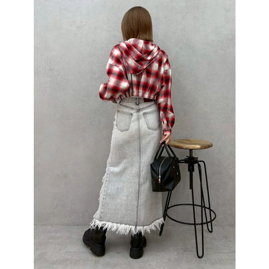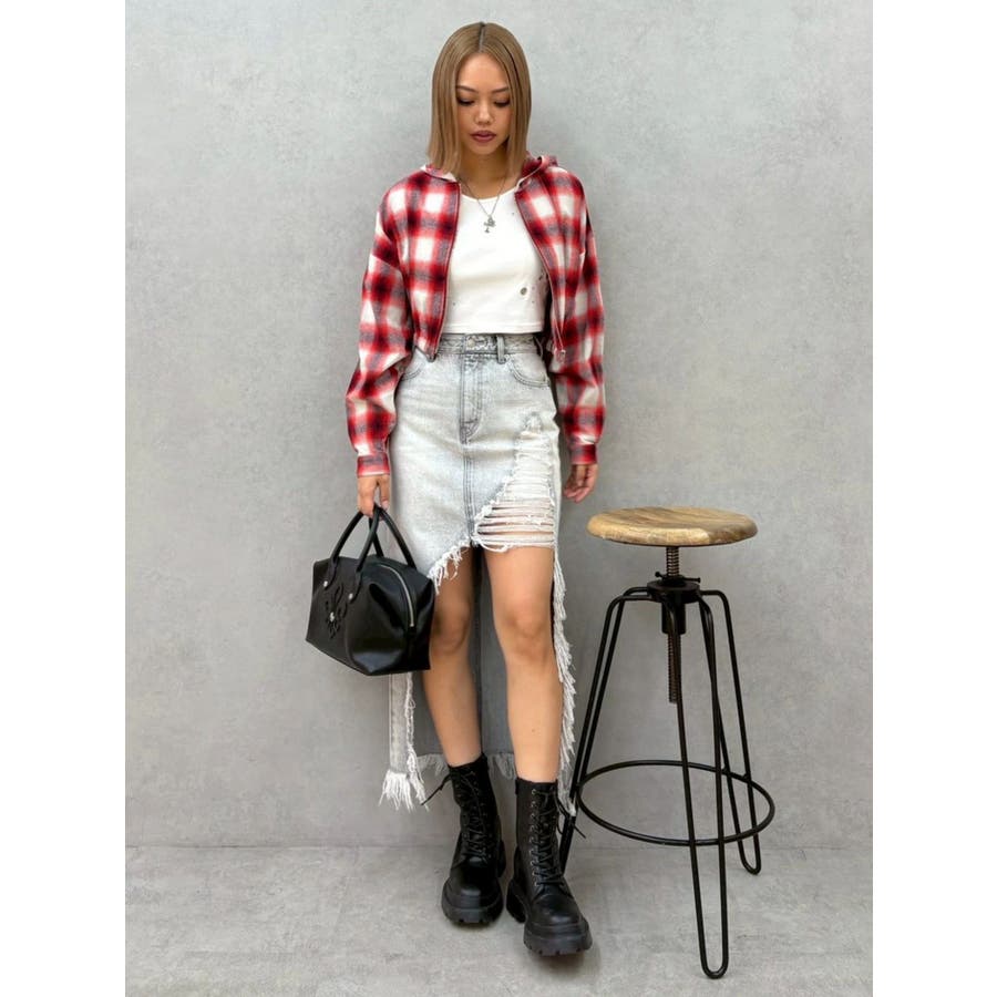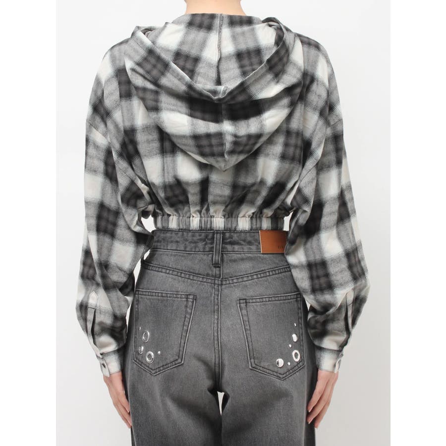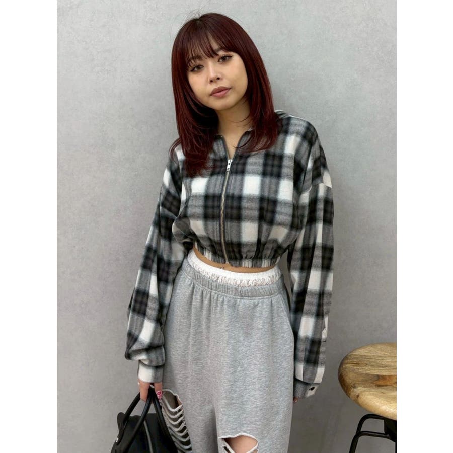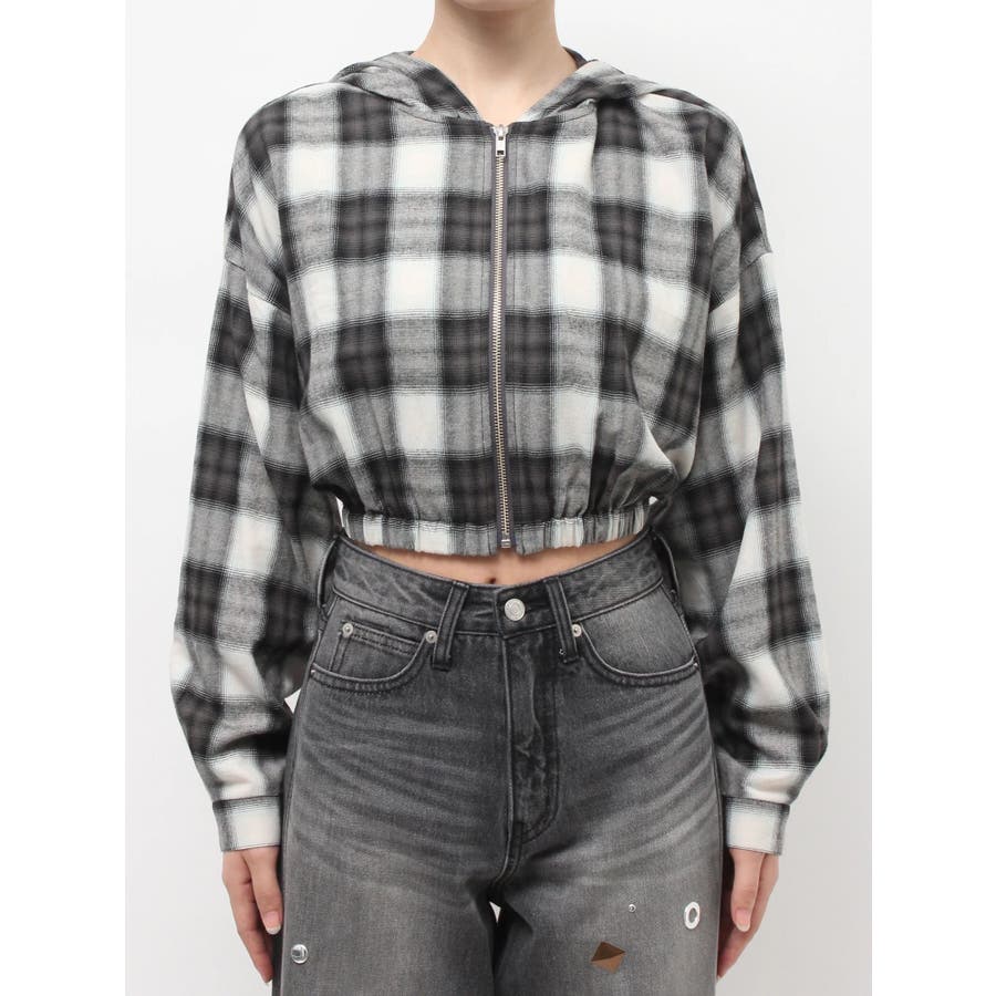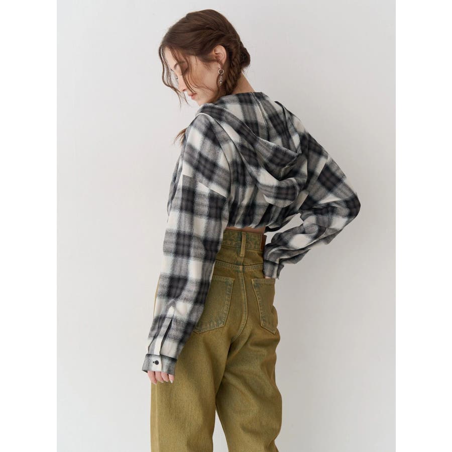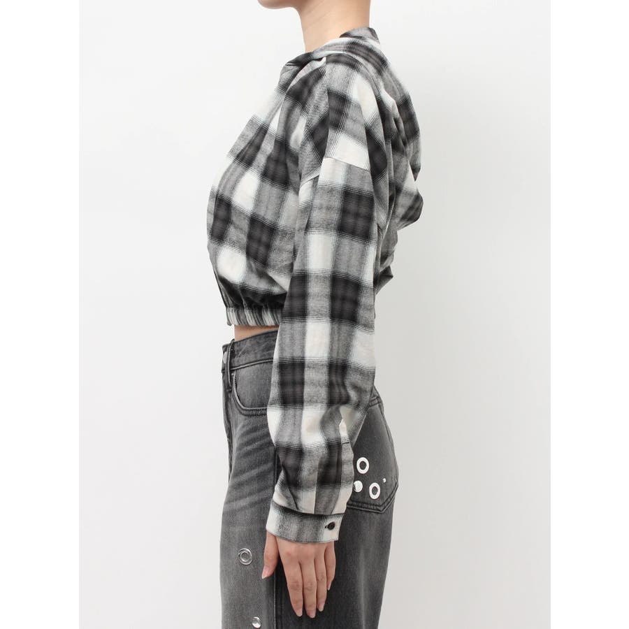 薄っすらとした水色が入ったチェックカラーが可愛いオンブレチェックのフード付きショートシャツです。裾が絞られたメリハリのあるデザインで、EVRIS(エヴリス)で人気のワイドデニム合わせがおすすめです。ジップアップなので、羽織としても着用できます。