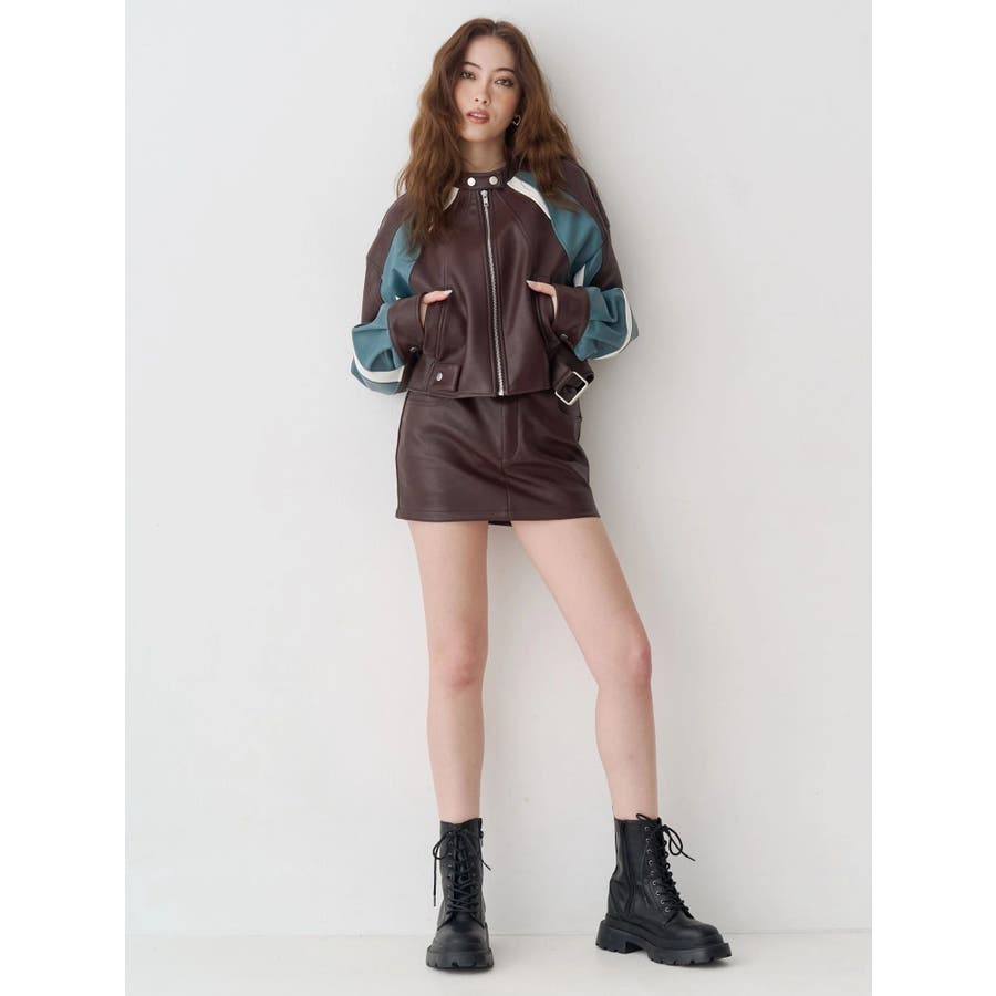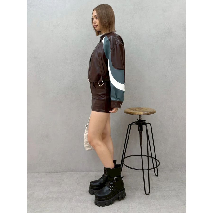 ■デザイン柔らかく着心地の良い合皮素材を使用したミニスカート。シボ感が程よくあり、どんなトップスにも合わせやすいです。しっかり幅のあるベルトとバックル丈は短めなのでメリハリのあるデザインになっています。インナーショートパンツ付きなのでコンパクトなサイズですが安心して着用できます。■スタイリング ブルゾンとセットアップで着用するスタイリングがおすすめ。フェイクレザー素材なので異素材のニットやスエットをあわせてカジュアルダウンしてもバランス良く着こなせます。■セットアップアイテム >>エンブレムドッキングバイカーブルゾン-------------- 透け感:なし 裏地:あり 生地の厚み:普通 伸縮性:なし --------------
