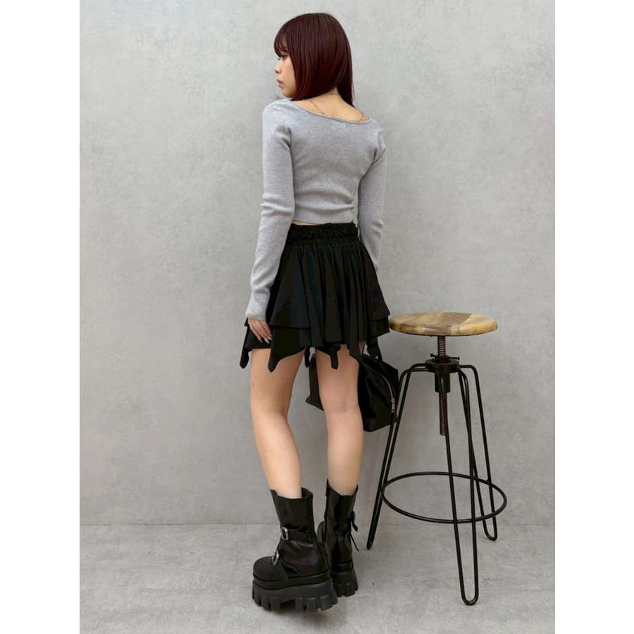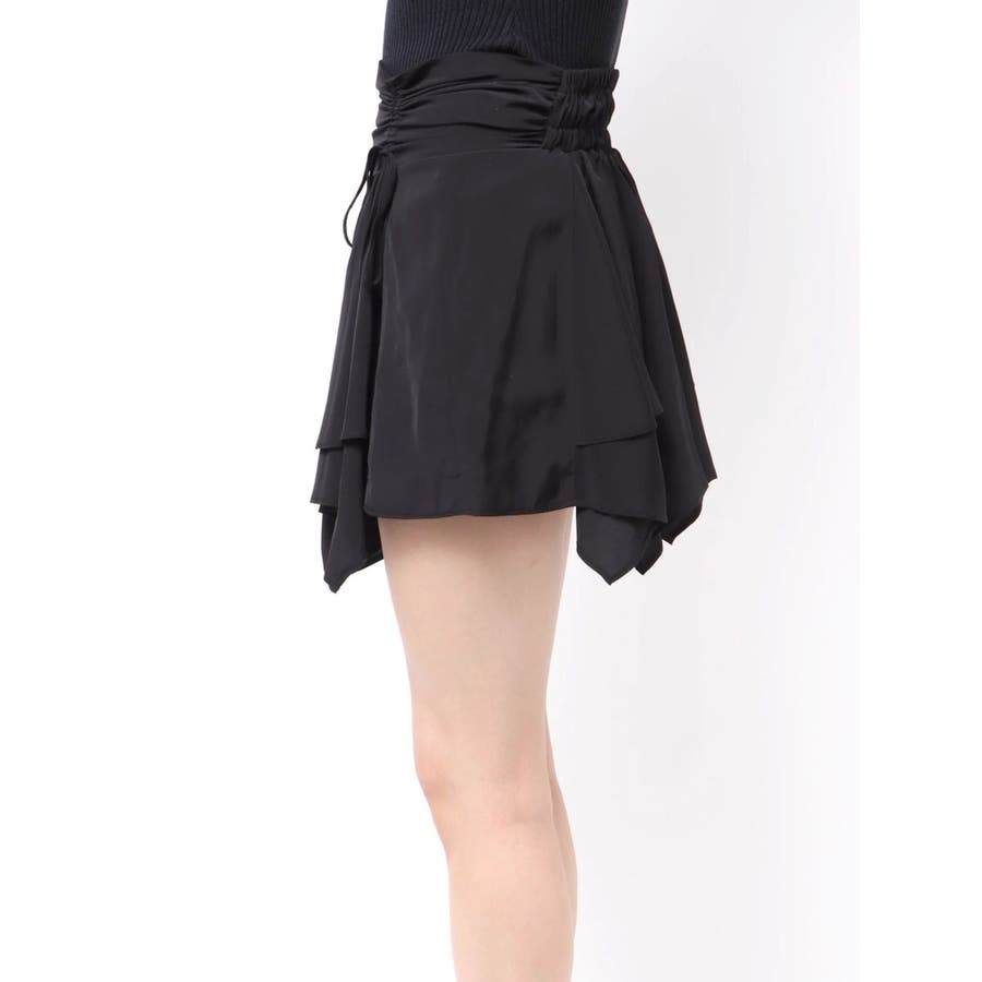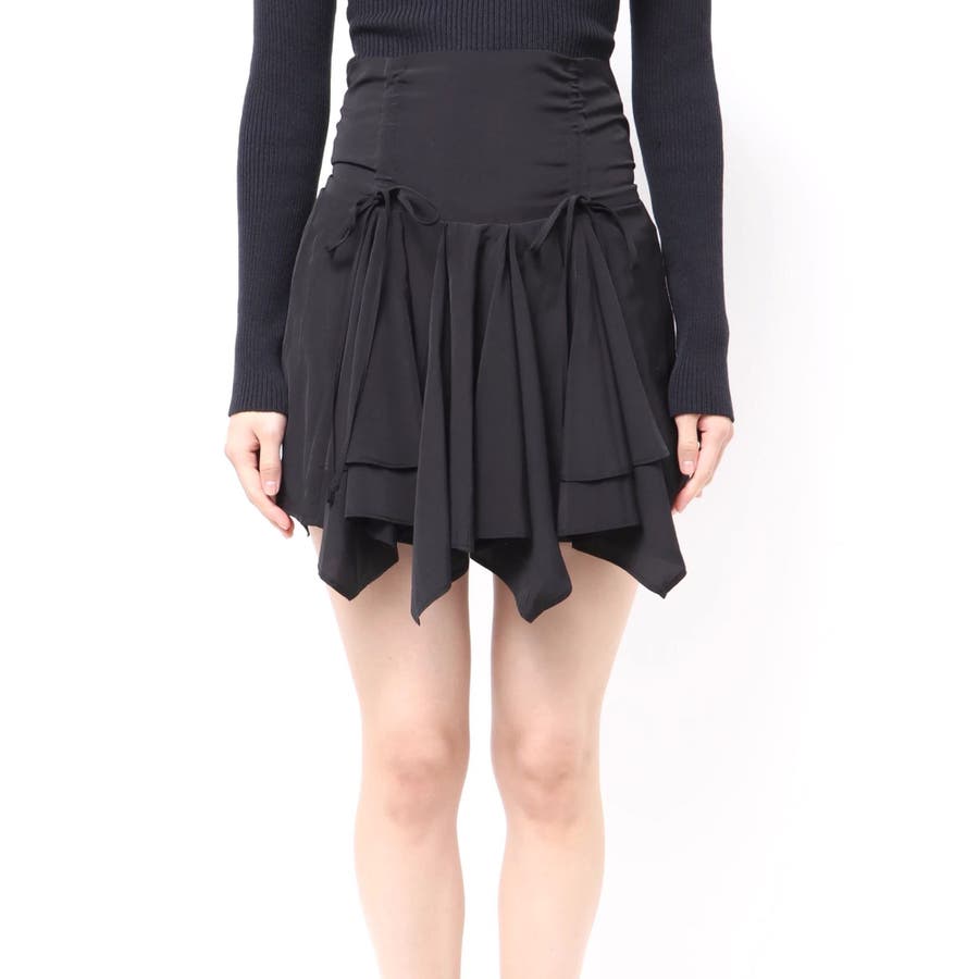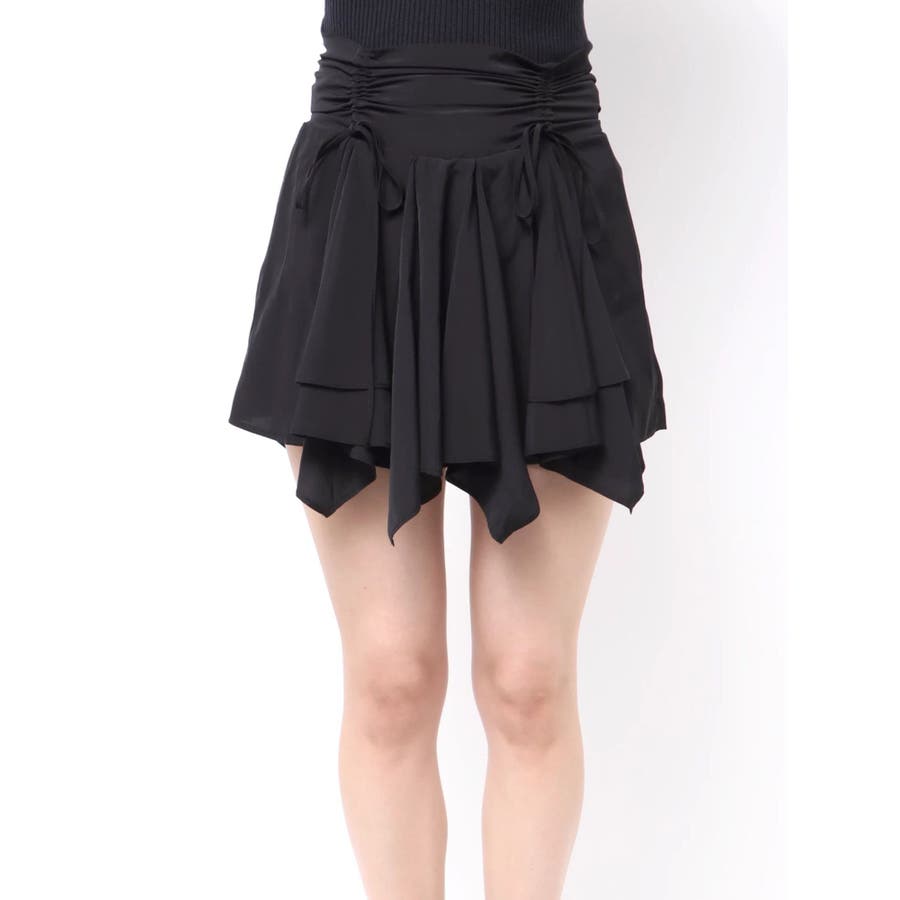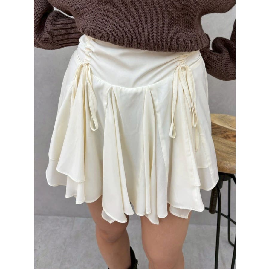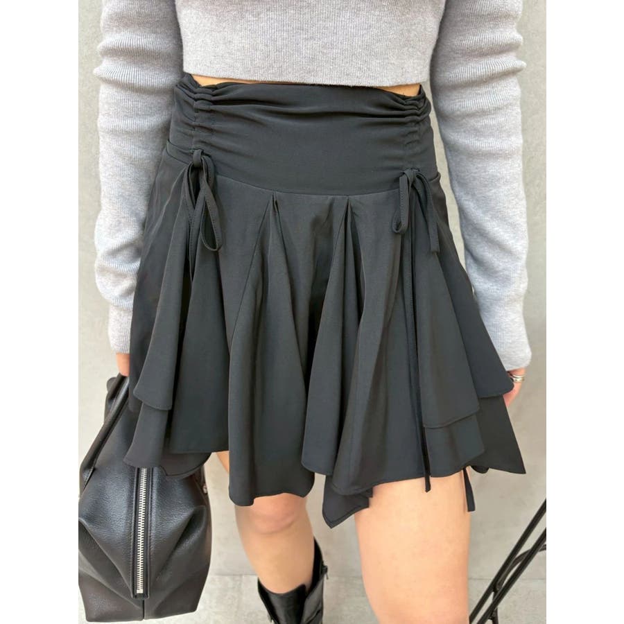 ■デザイン イレヘムデザインが今年らしい、トレンド感のあるミニスカートです。 インナーショートパンツ付きで安心して着用できます。ウエスト後ろ部分はゴムの仕様になっており、着脱も楽ちん◎ フロントのウエスト部分にはドロストできる平紐をつけておりギャザーの調整が可能になっています。 ■スタイリング カジュアルなトップスやごつめブーツなどとスタイリングすると今っぽい「甘×辛MIXスタイル」でおすすめです。 短めトップスとの相性も良いですしオーバーサイズのトップスからスカートの裾をチラ見せして着るのもかわいいです。-------------- 透け感:なし 裏地:あり 生地の厚み:薄め伸縮性:なし--------------