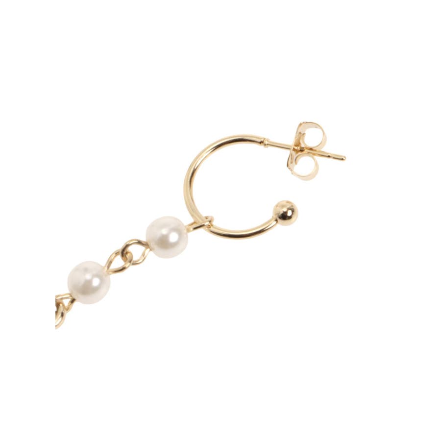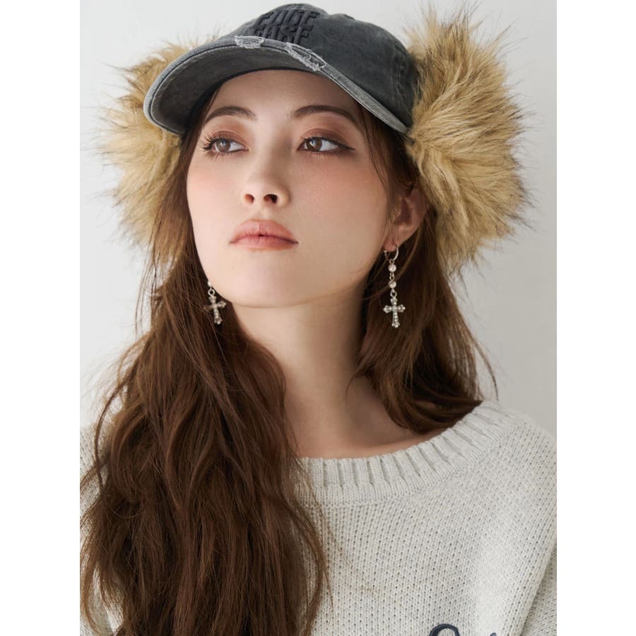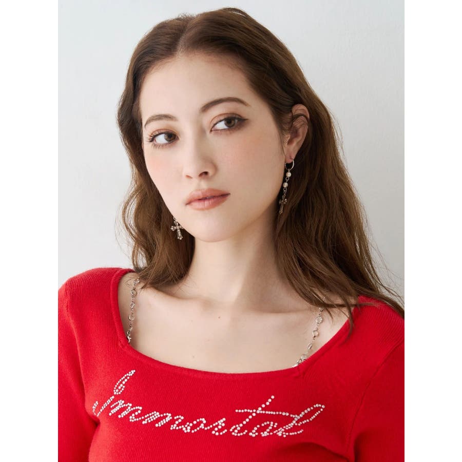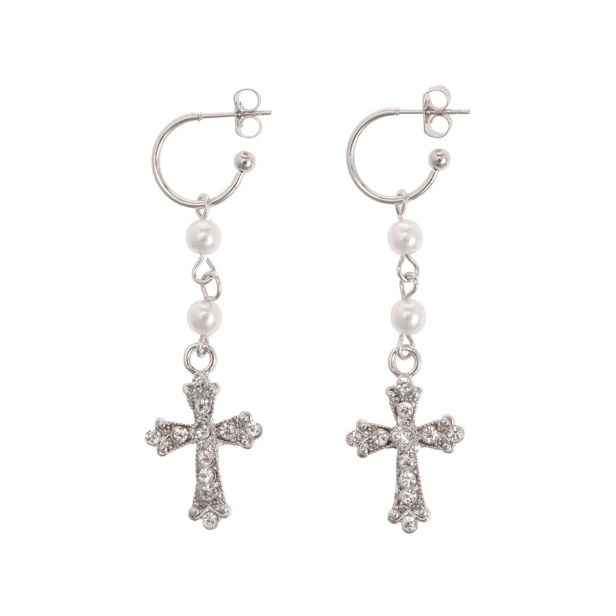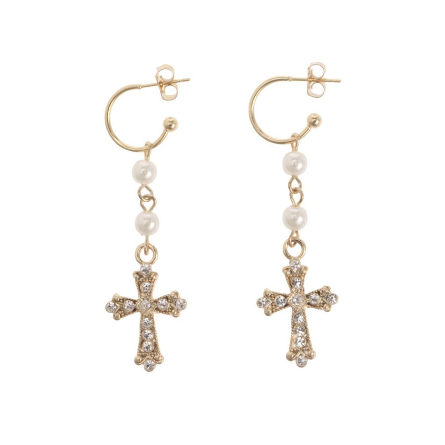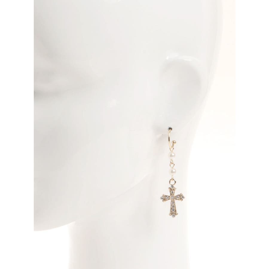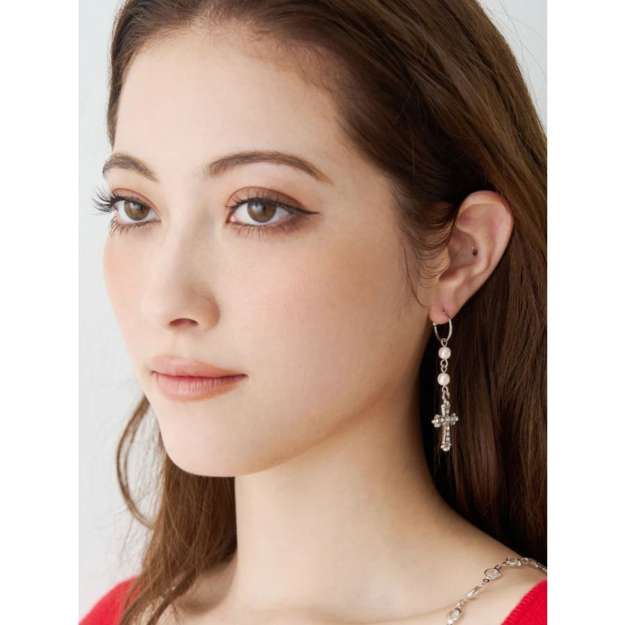 シェルとチェーンを組み合わせたクロスモチーフピアスです。クロス部分はラインストーンがきらめき耳元に華やかなアクセントをプラス。ナチュラルなシェルと煌めくラインストーンのコントラストが耳元が華やかに映えるデザインです。