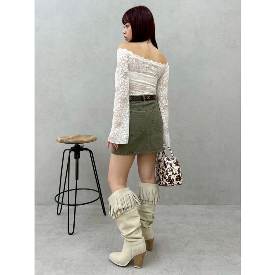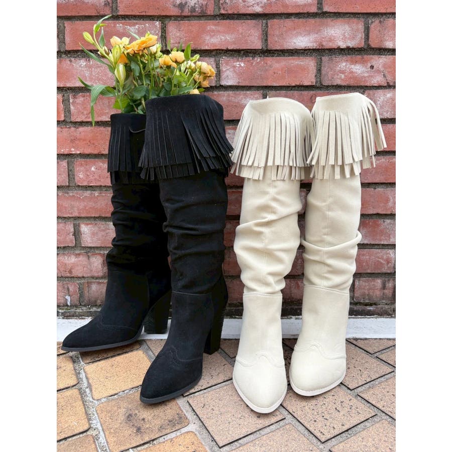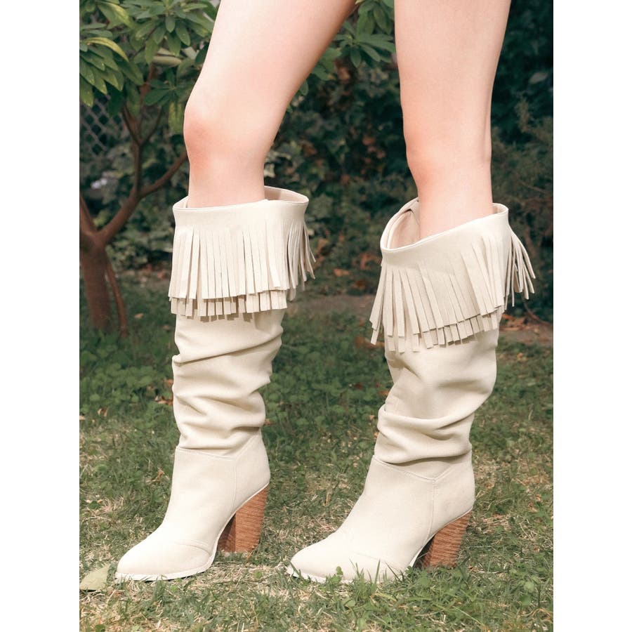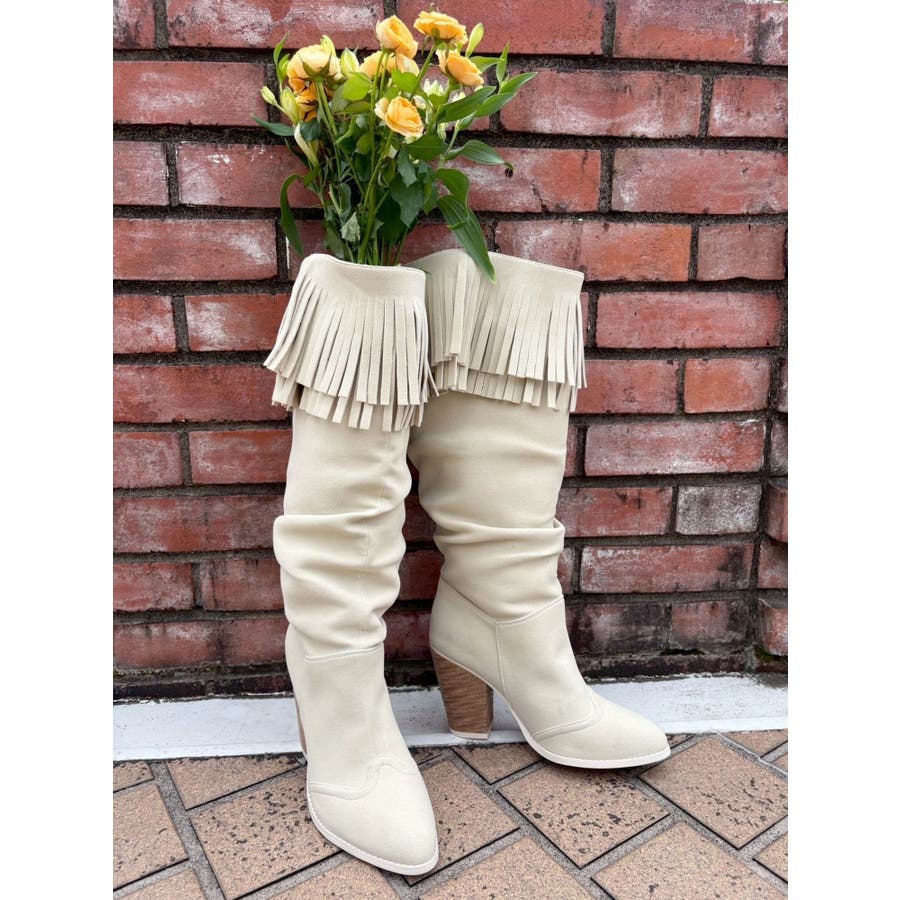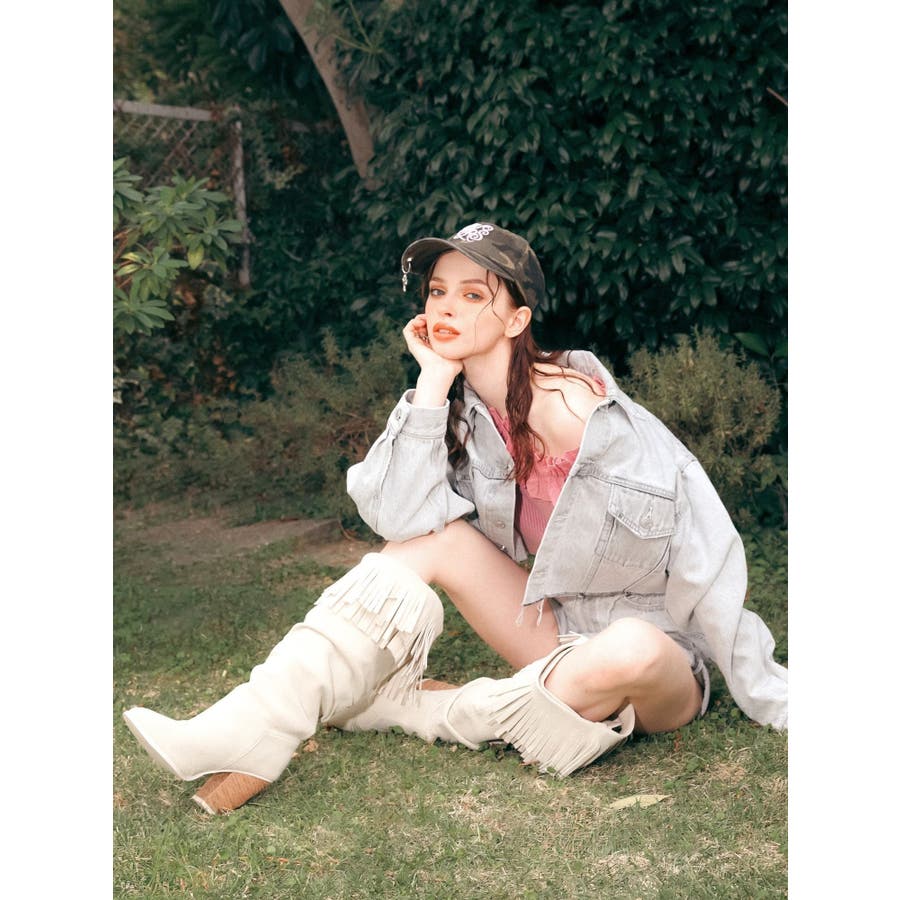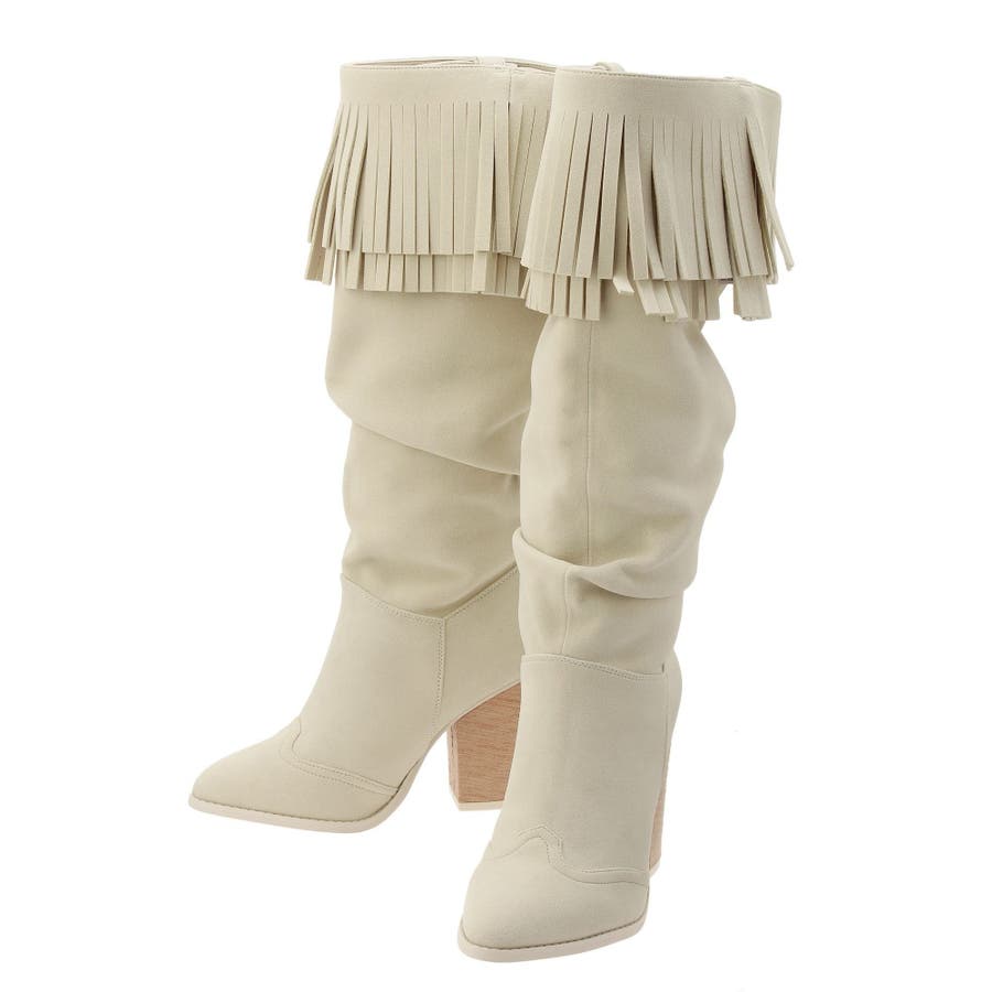 フェイクスウェードのフリンジブーツ。履き口のフリンジは内側のスナップボタンで取り外し可能で、フリンジを外せば、クシュっとしたウエスタンブーツとして、2WAYで着用できます。春らしいアイボリーはスタイリングのアクセントにもおすすめです。
