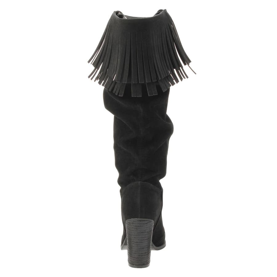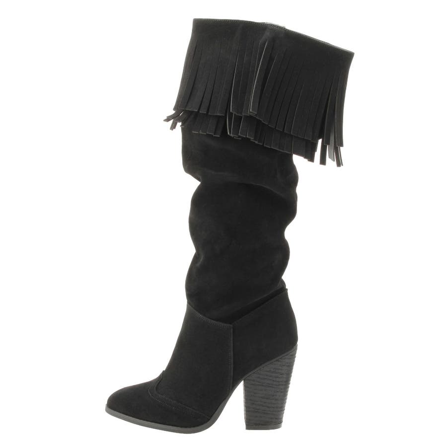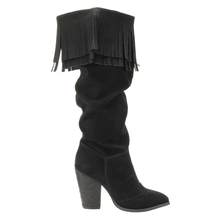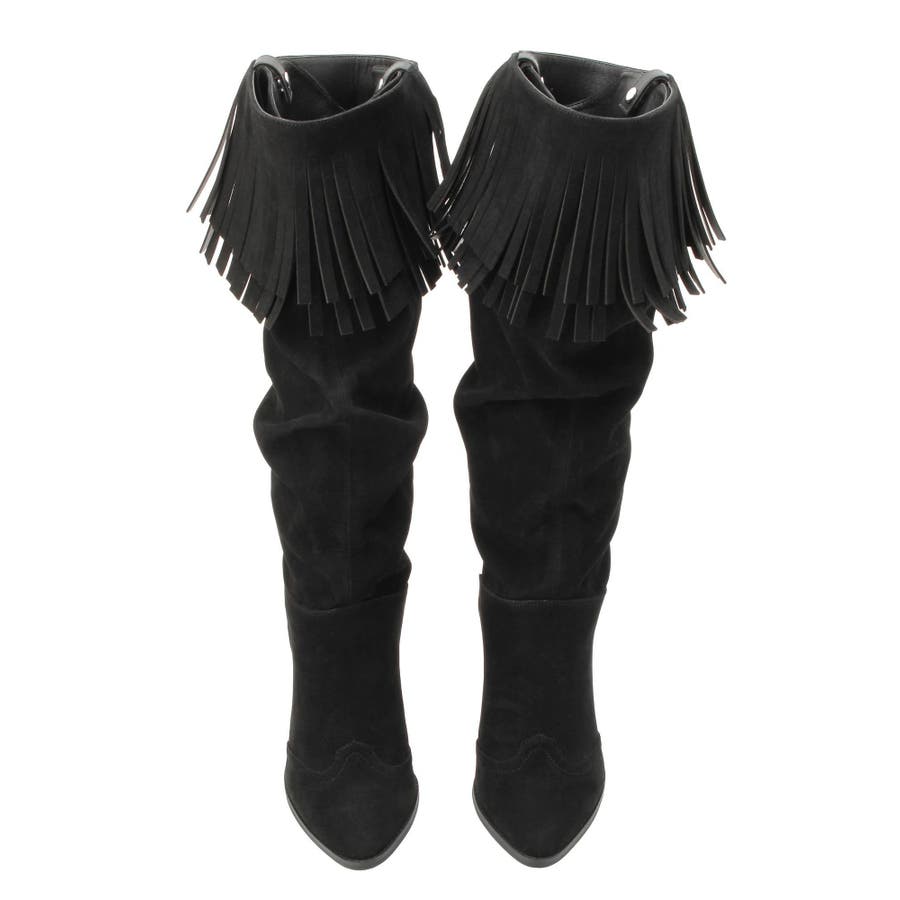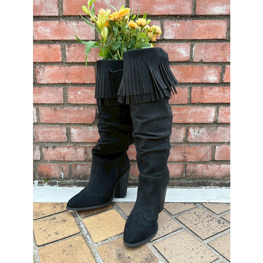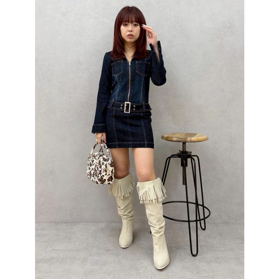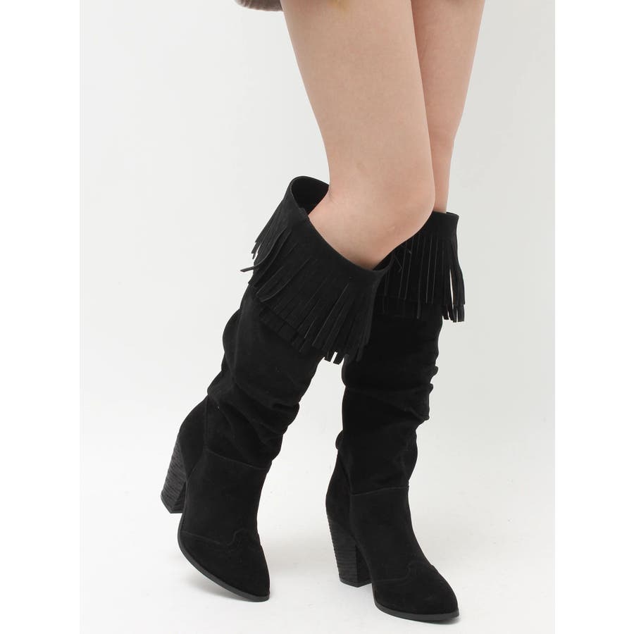 フェイクスウェードのフリンジブーツ。履き口のフリンジは内側のスナップボタンで取り外し可能で、フリンジを外せば、クシュっとしたウエスタンブーツとして、2WAYで着用できます。春らしいアイボリーはスタイリングのアクセントにもおすすめです。
