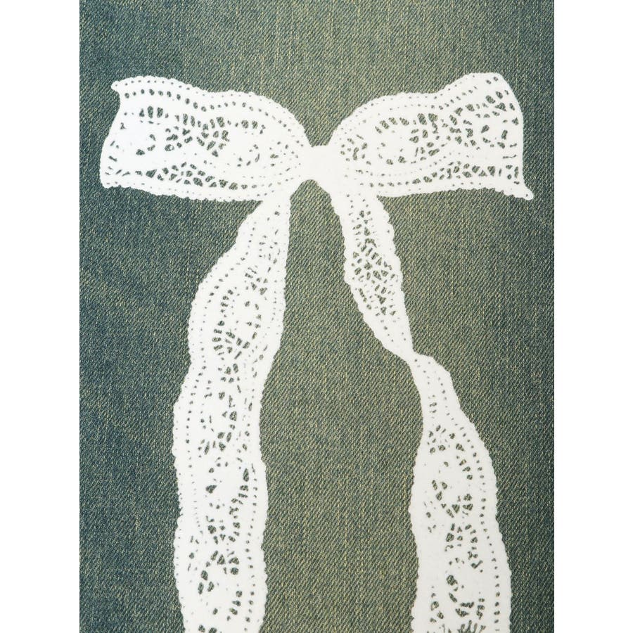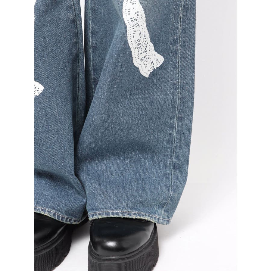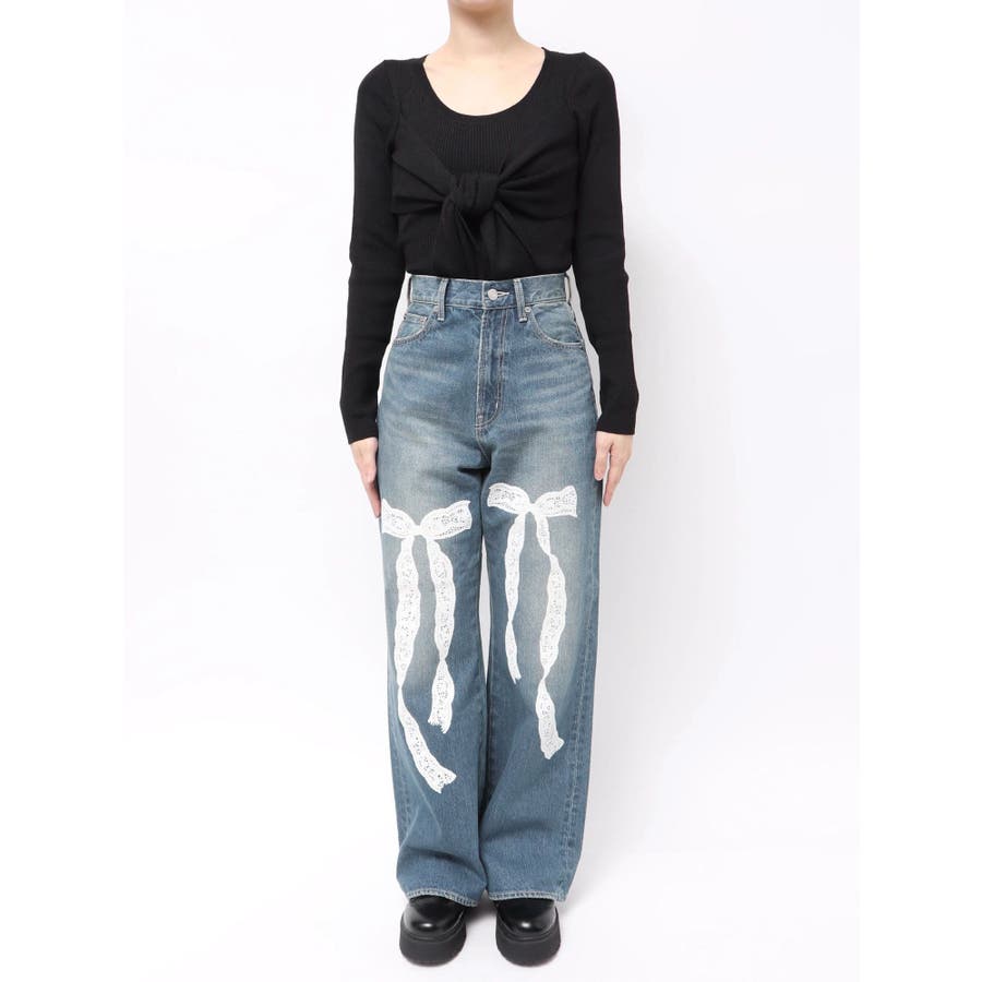 トレンドのリボンデザインを取り入れたキャッチーなデニムパンツです。レース柄のリボンをフロッキープリントで表現しています。ワイドのシルエットはEVRISで人気のシルエットを採用しています。美脚効果抜群のシルエットです。コンパクトなトップスと合わせるとスタイルアップ効果があります。※リボンのプリントのカラーがもう少しオフホワイトに変更になります