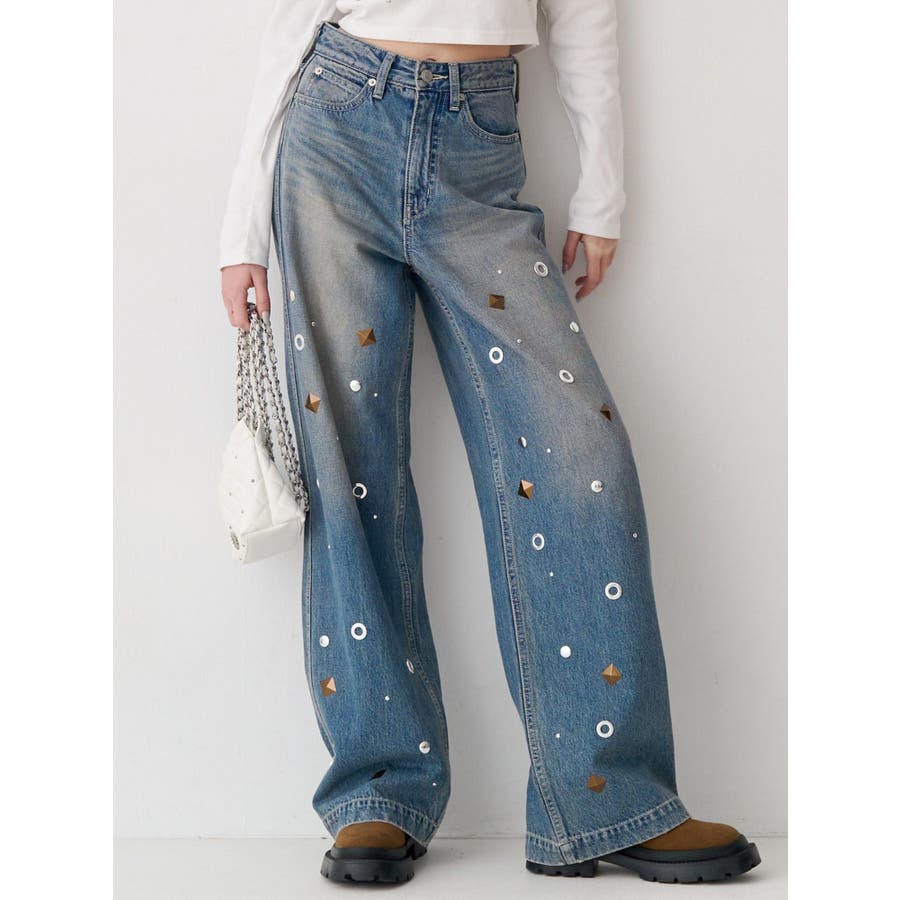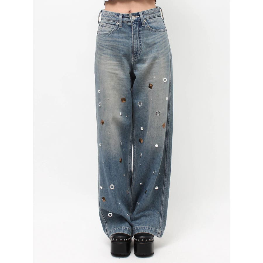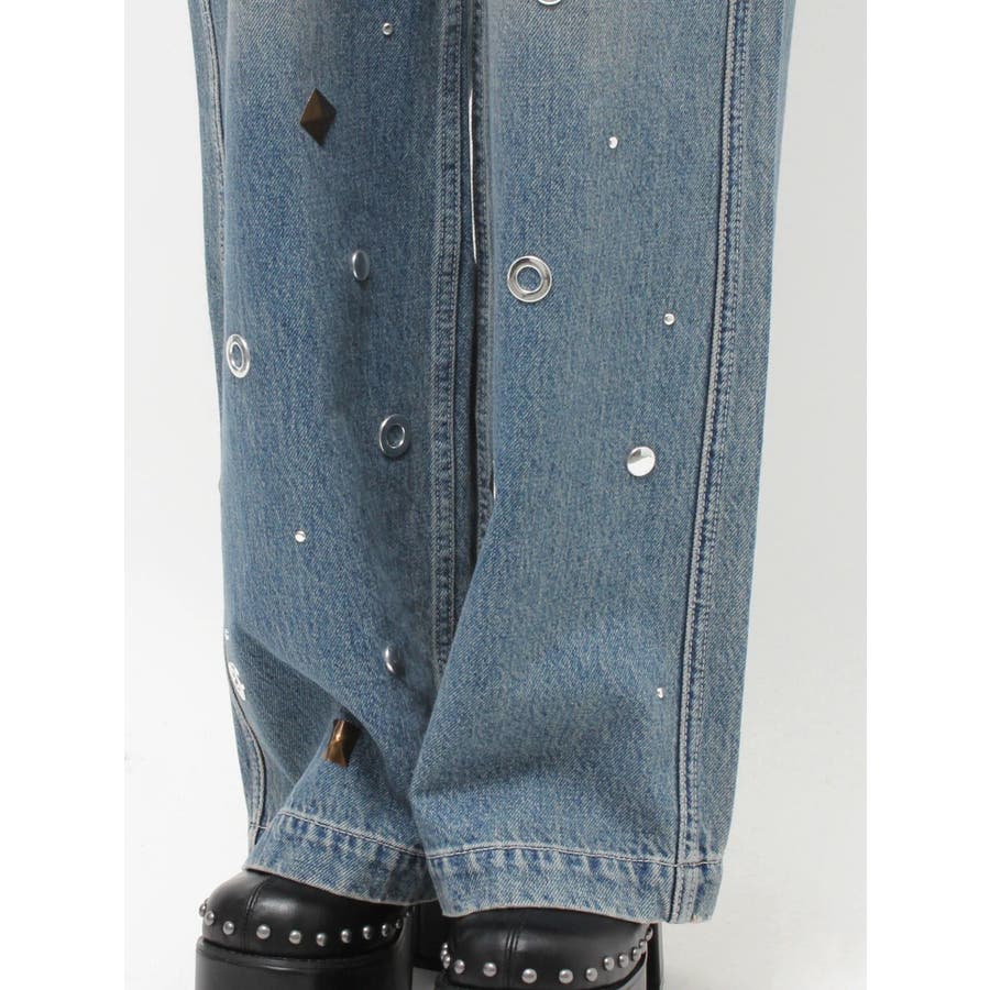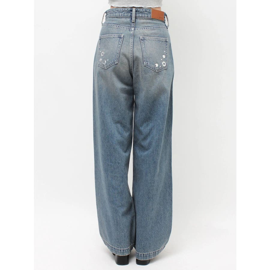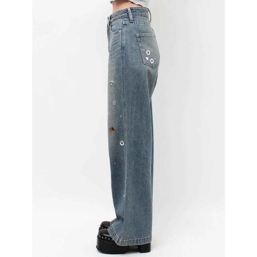 ゆったりしたサイズのワイドデニムパンツです。前身全体にアイレットなどのモチーフをあしらい、後ろポケット部分にも、アイレットを配置。目の引くインパクトのあるデザインで、スタイリングの主役なるデニムパンツです。