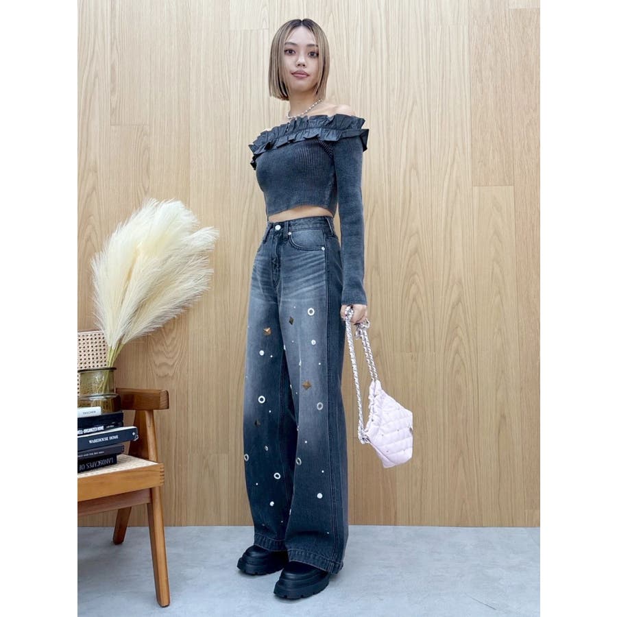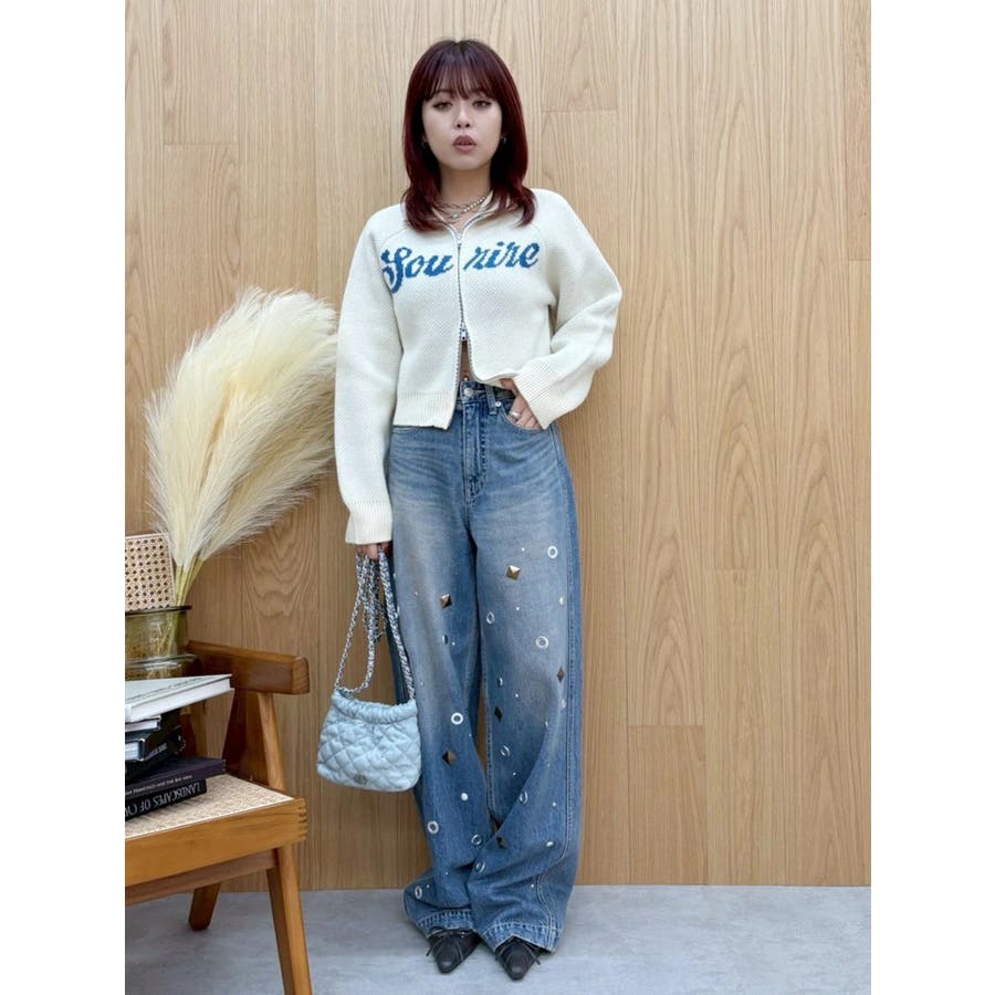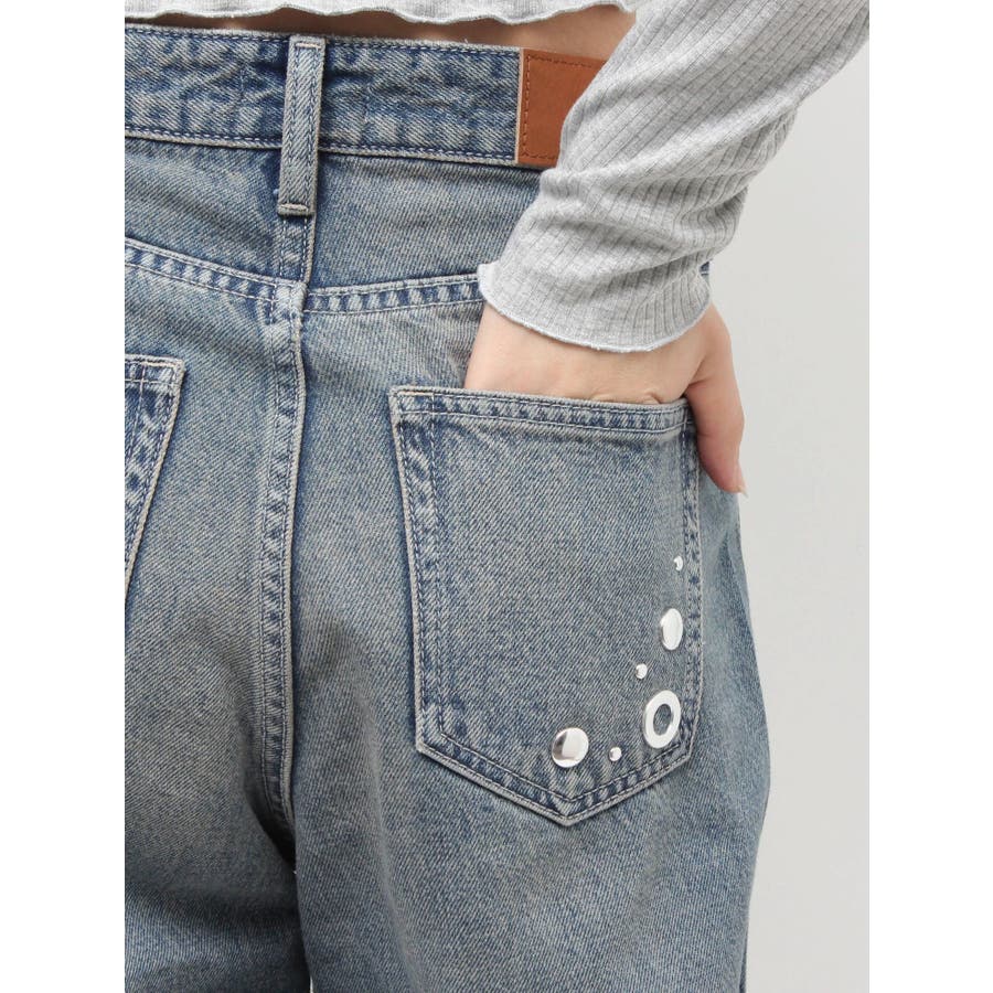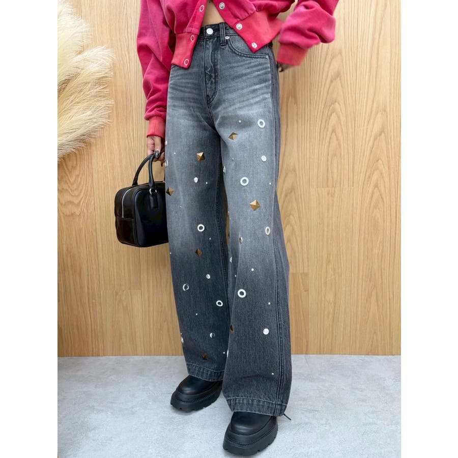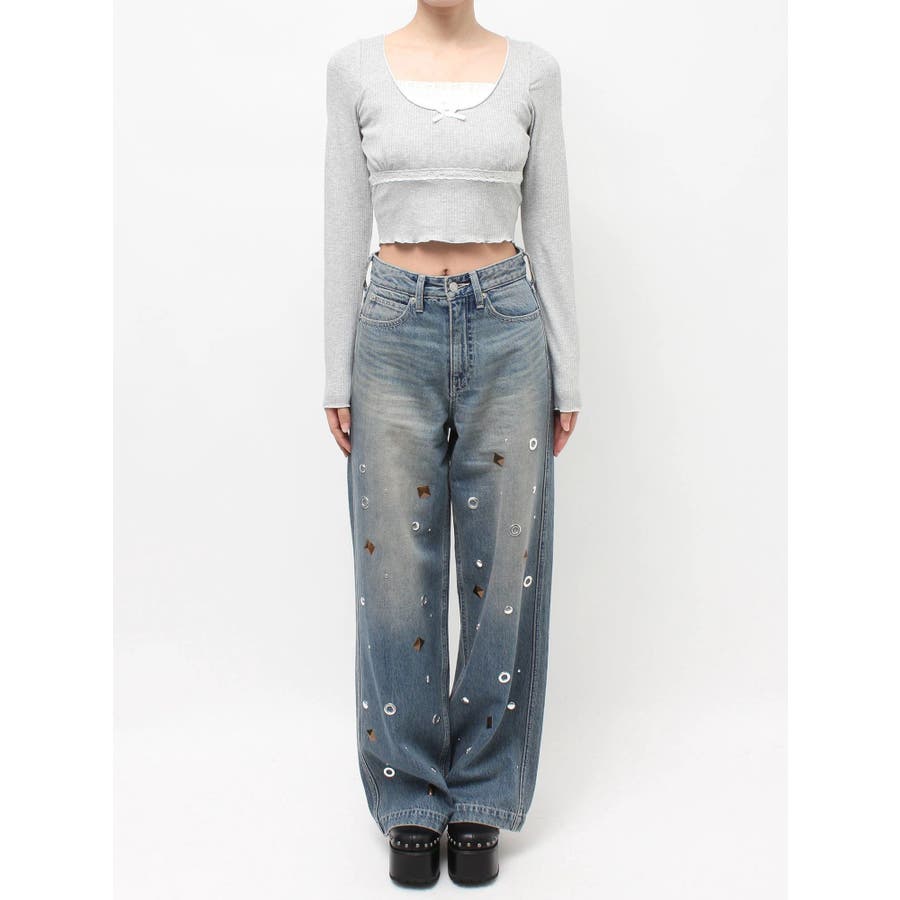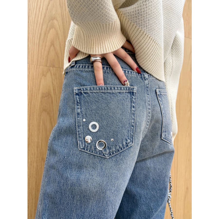 ゆったりしたサイズのワイドデニムパンツです。前身全体にアイレットなどのモチーフをあしらい、後ろポケット部分にも、アイレットを配置。目の引くインパクトのあるデザインで、スタイリングの主役なるデニムパンツです。