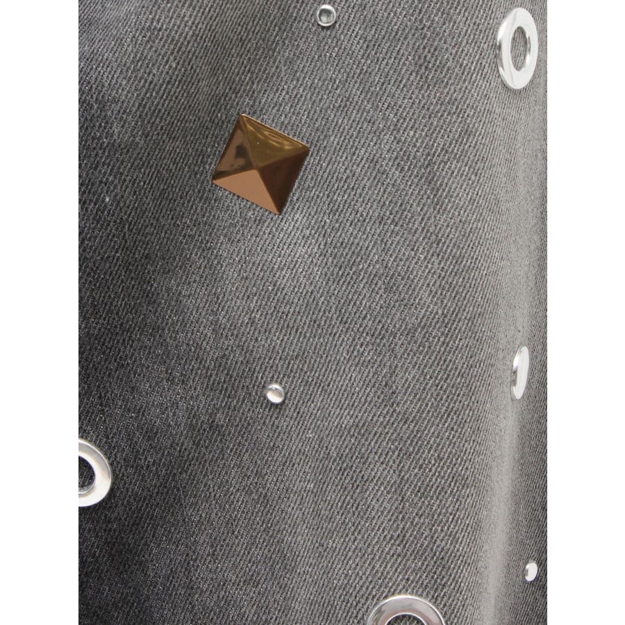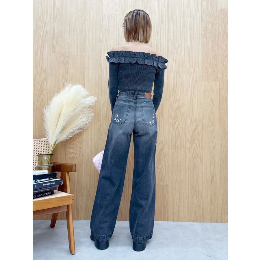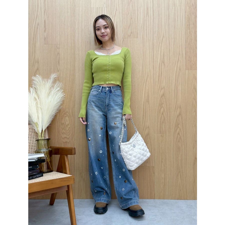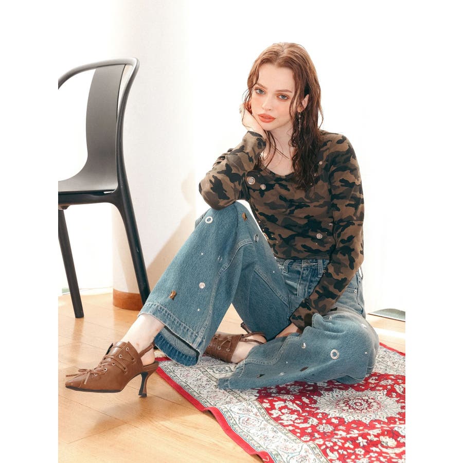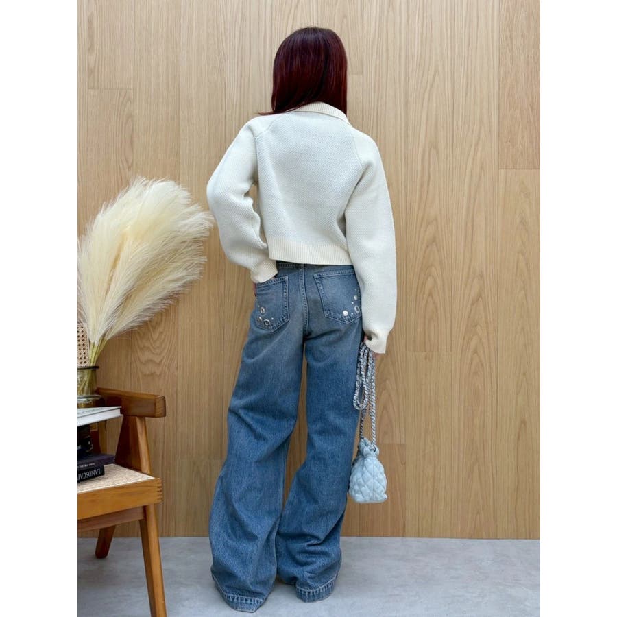ゆったりしたサイズのワイドデニムパンツです。前身全体にアイレットなどのモチーフをあしらい、後ろポケット部分にも、アイレットを配置。目の引くインパクトのあるデザインで、スタイリングの主役なるデニムパンツです。