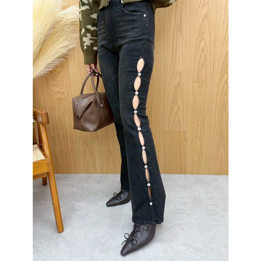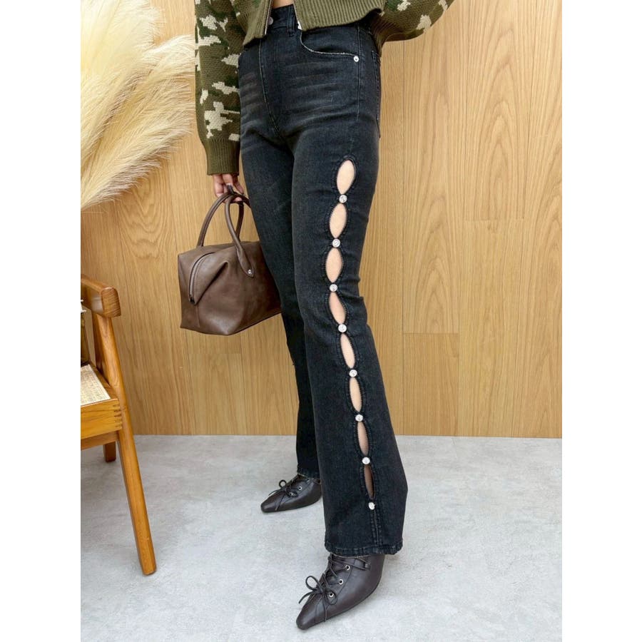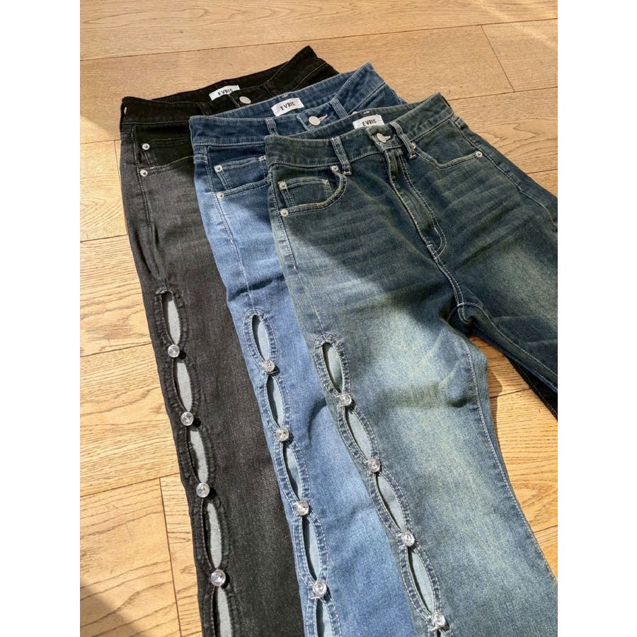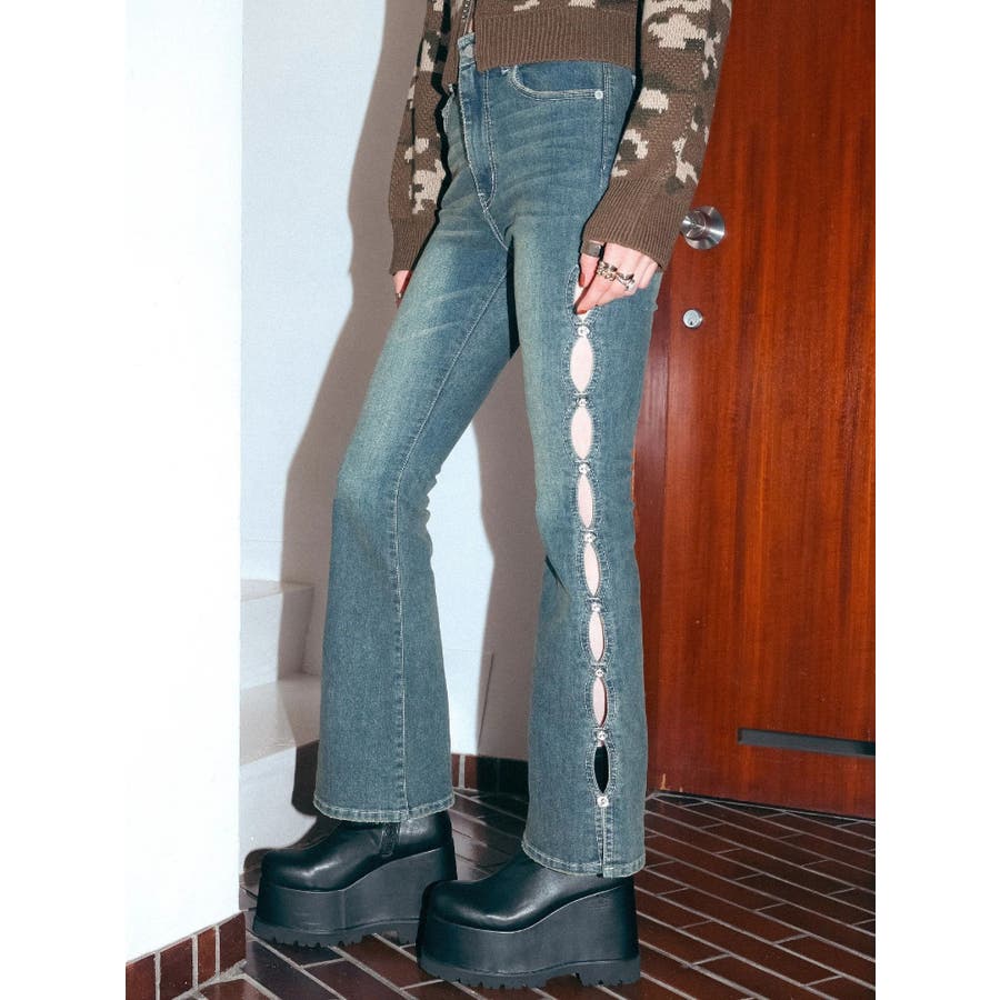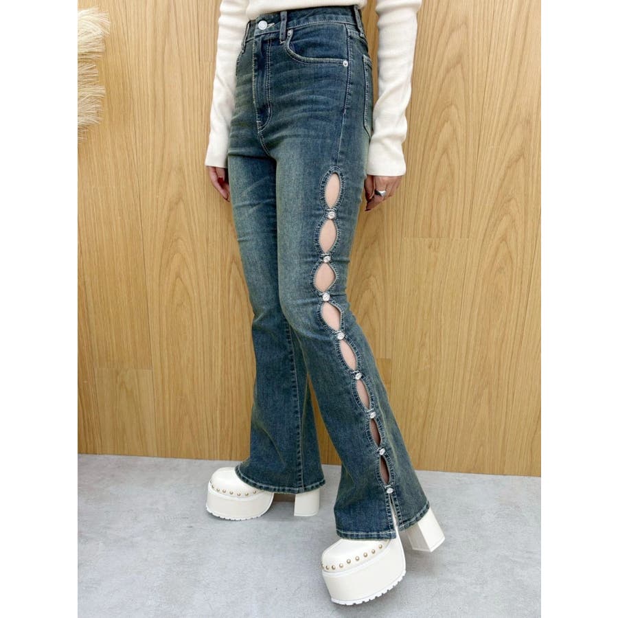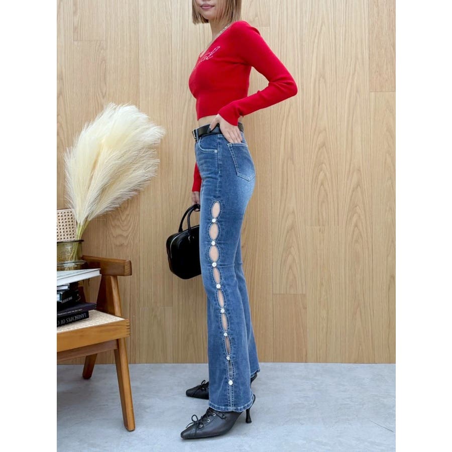 サイドビジューフレアデニムパンツ
