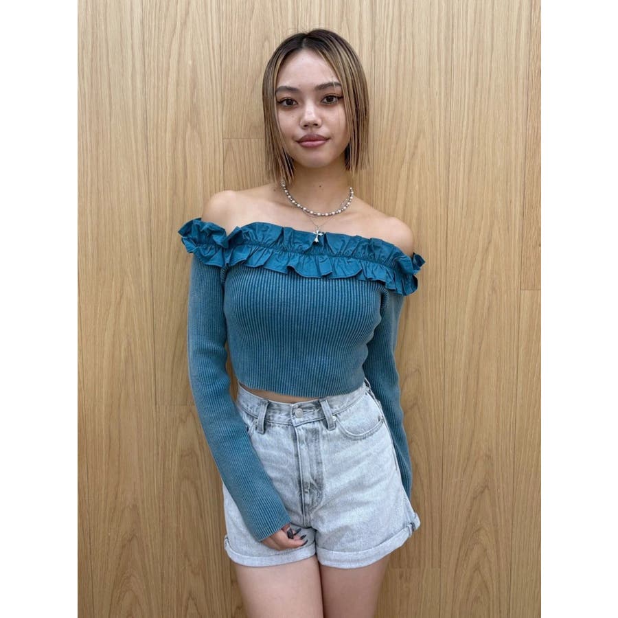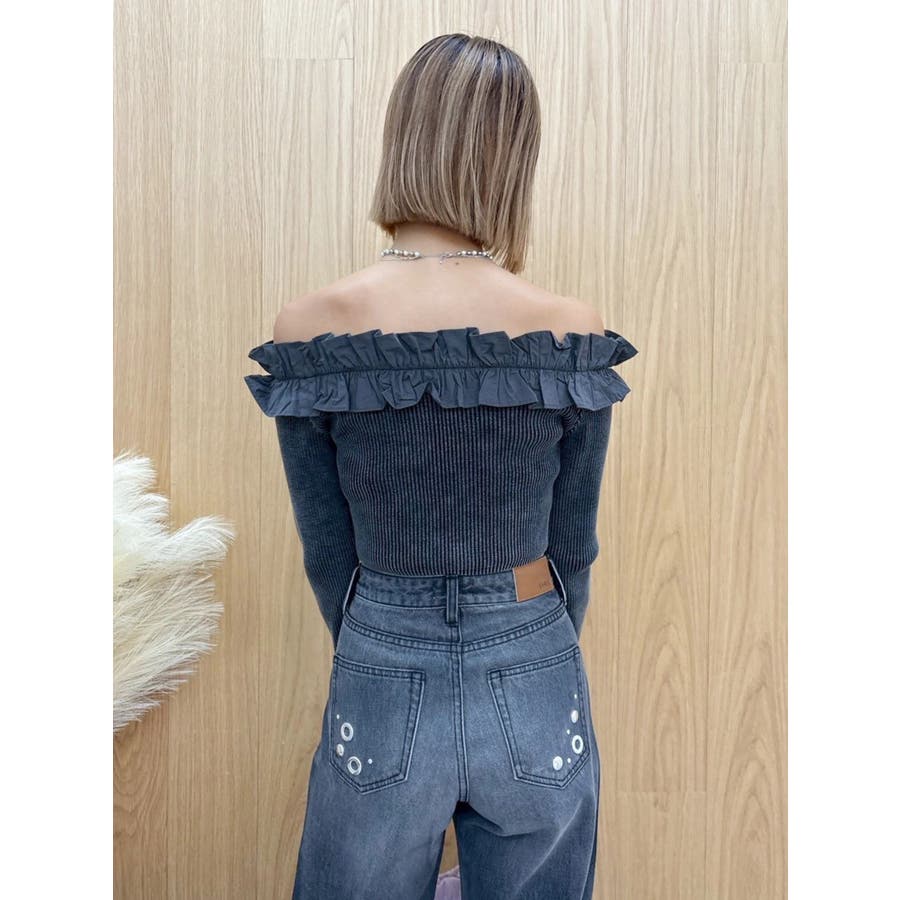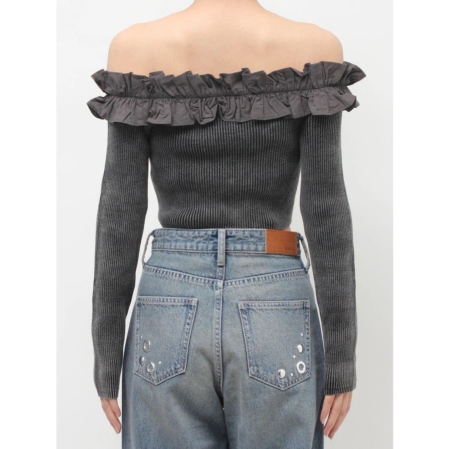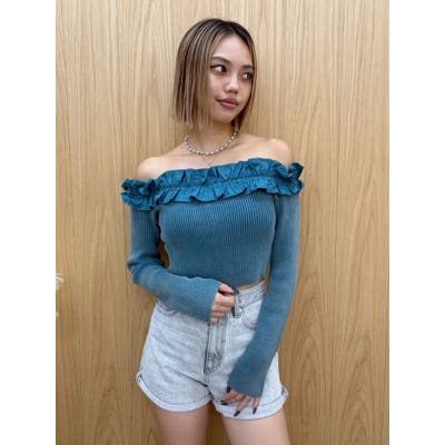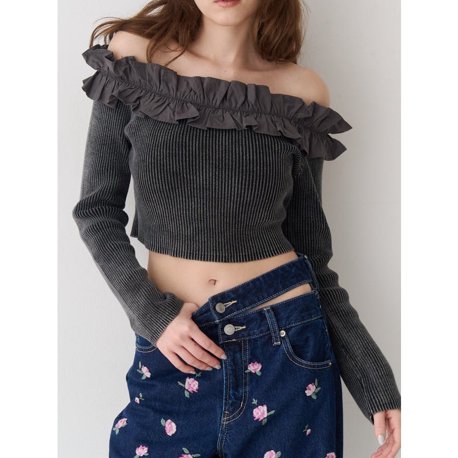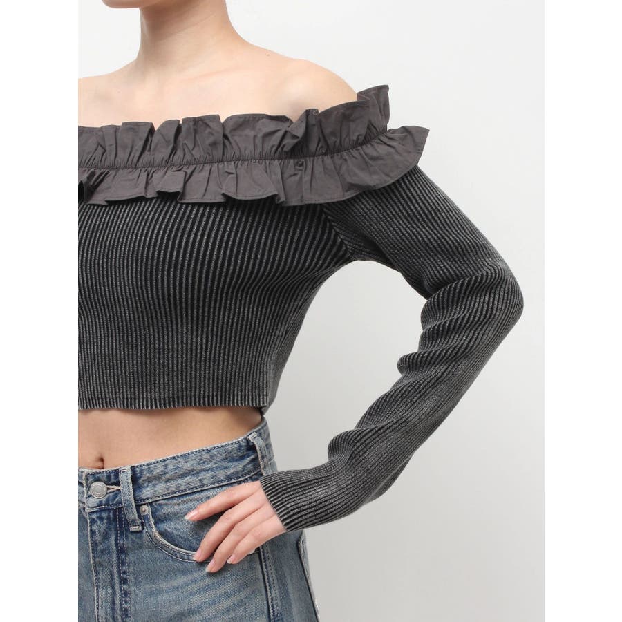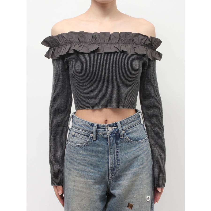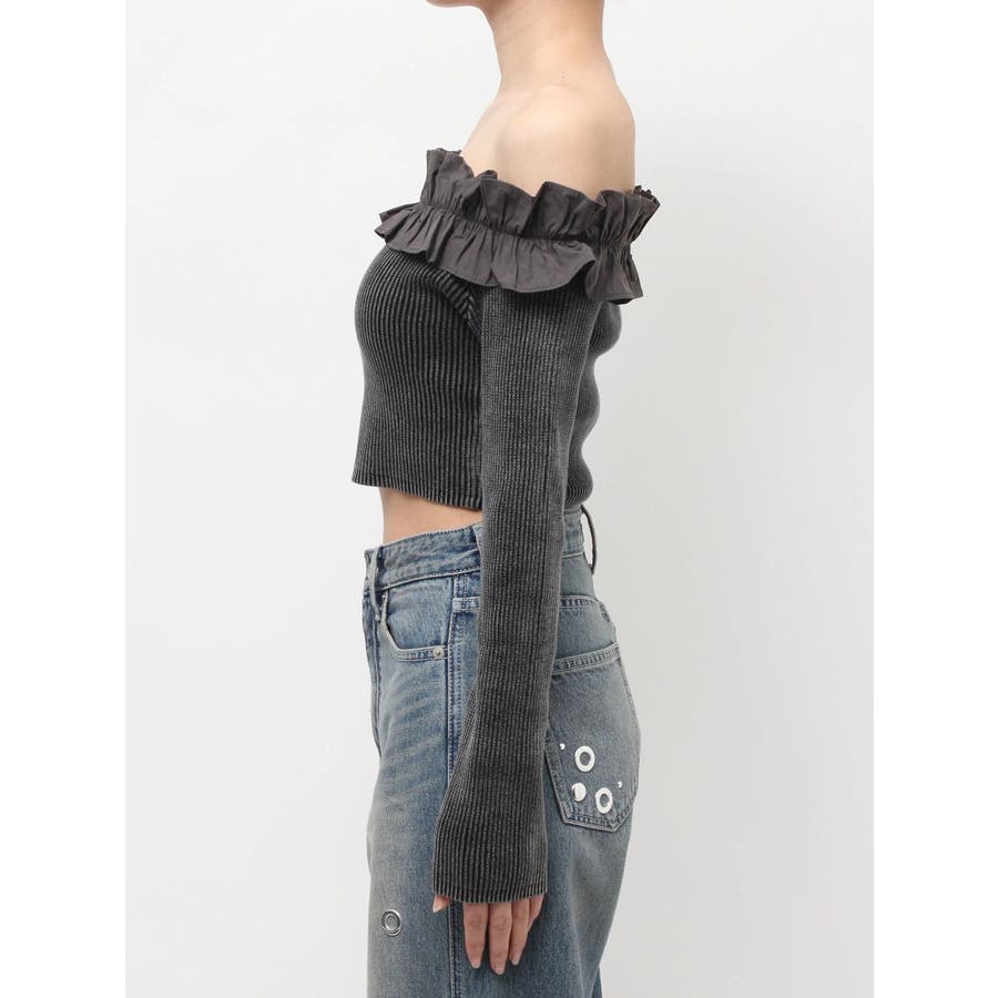 ピグメント加工による絶妙なフェード感が魅力のニットトップス。オフショルダーと立体的なフリルデザインを取り入れながらも、甘くなりすぎず程よくエッジの効いた印象に。コンパクトなシルエットが今っぽく、デニムなどカジュアルなボトムとも好相性。加工感で差がつく、着映え力のある1枚です。