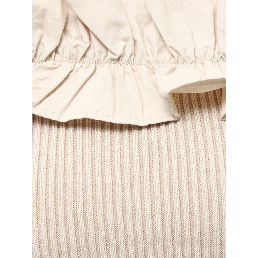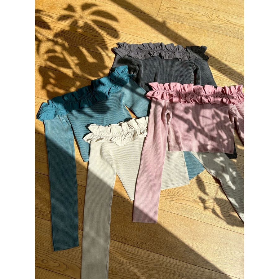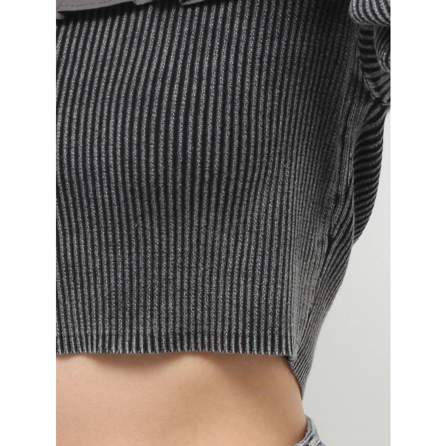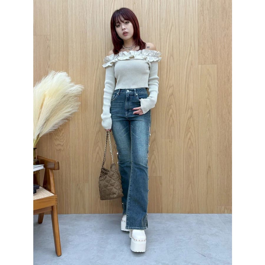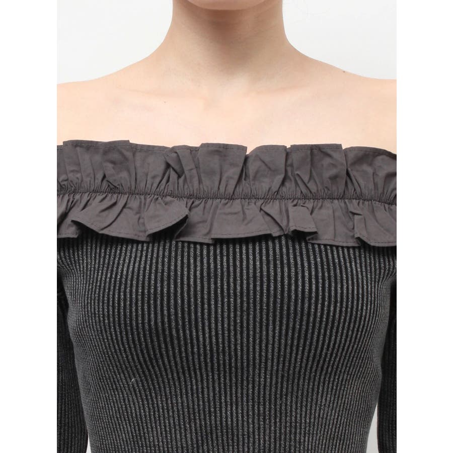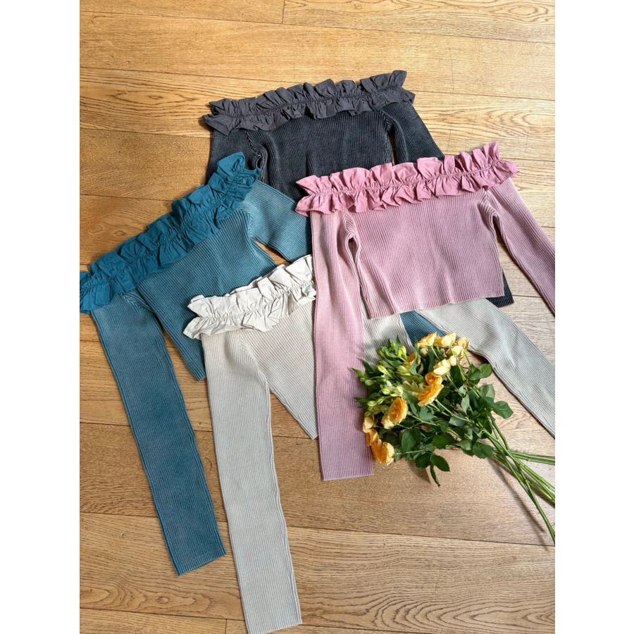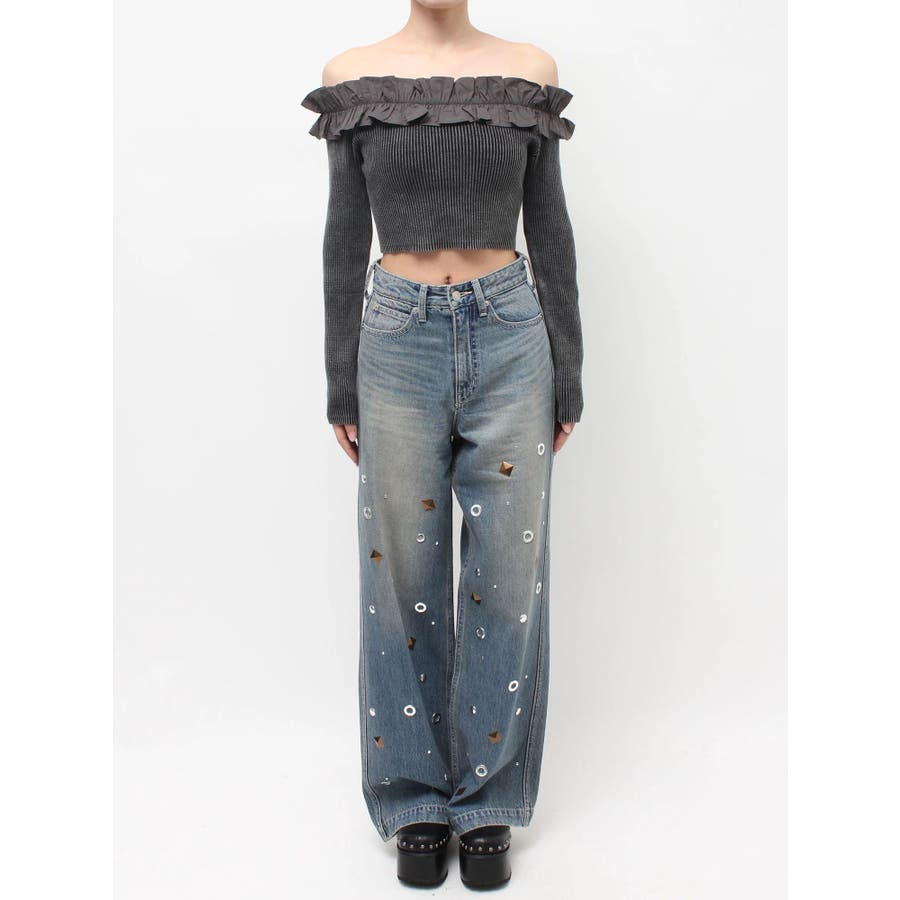 ピグメント加工による絶妙なフェード感が魅力のニットトップス。オフショルダーと立体的なフリルデザインを取り入れながらも、甘くなりすぎず程よくエッジの効いた印象に。コンパクトなシルエットが今っぽく、デニムなどカジュアルなボトムとも好相性。加工感で差がつく、着映え力のある1枚です。
