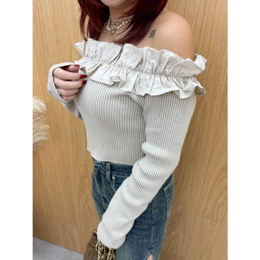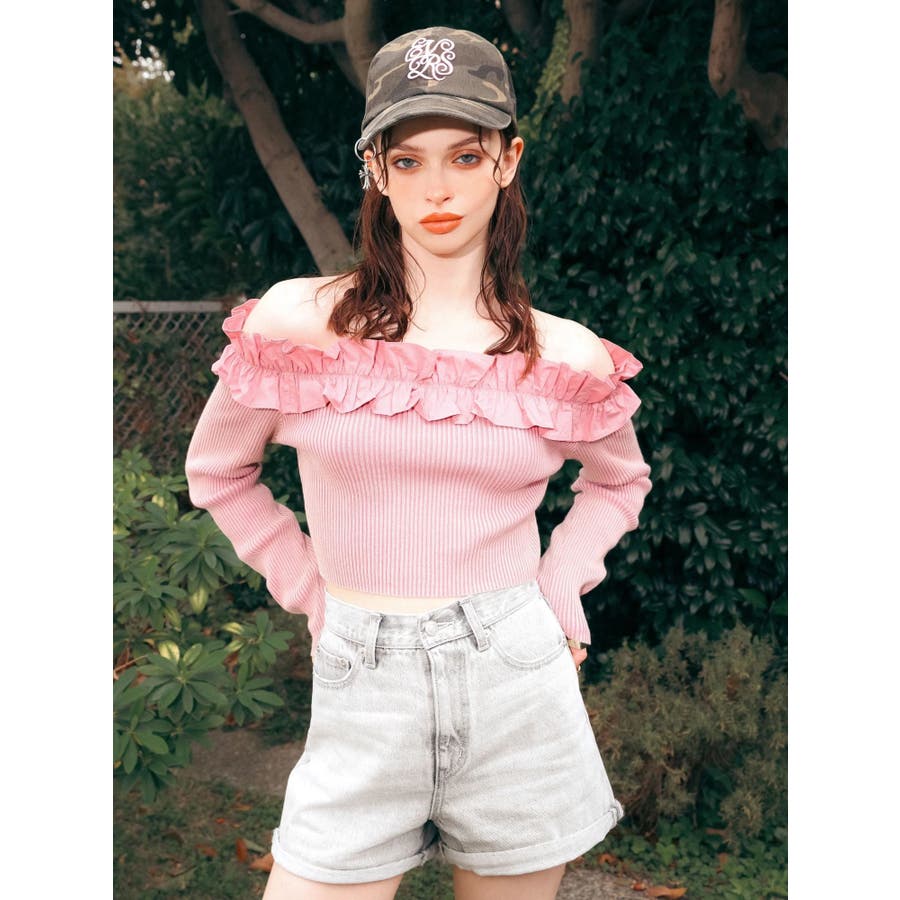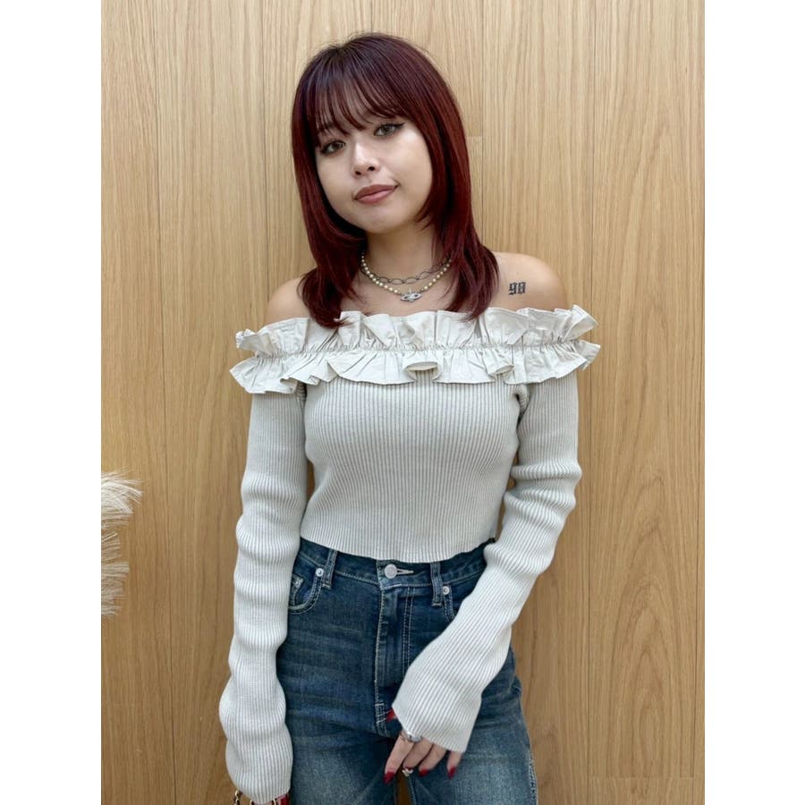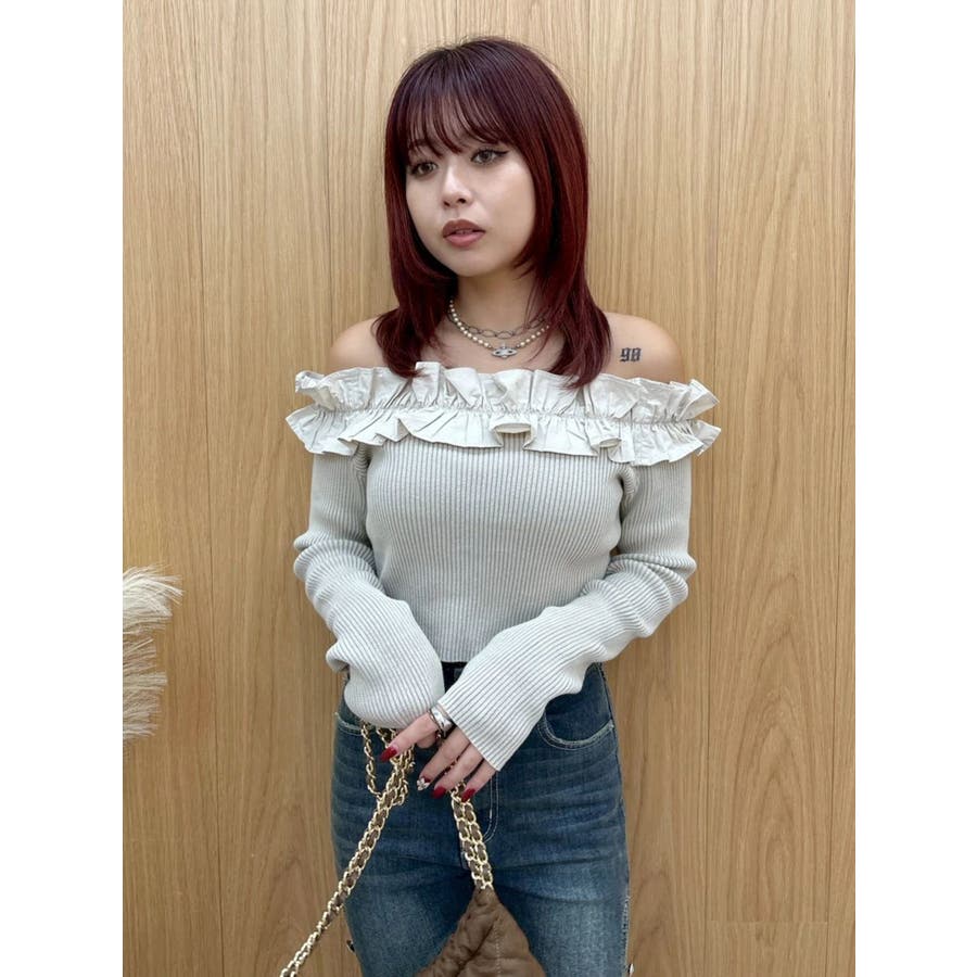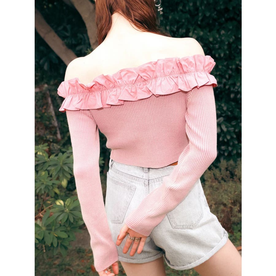 オフショルダーと立体的なフリルデザインを取り入れながらも、