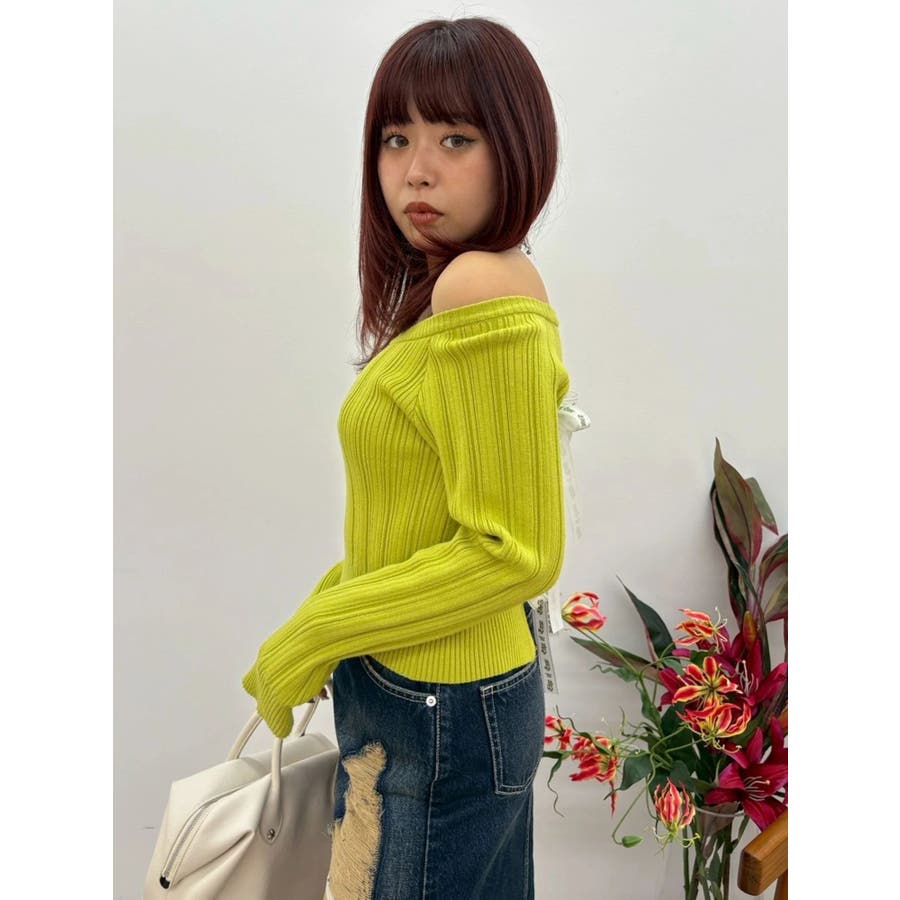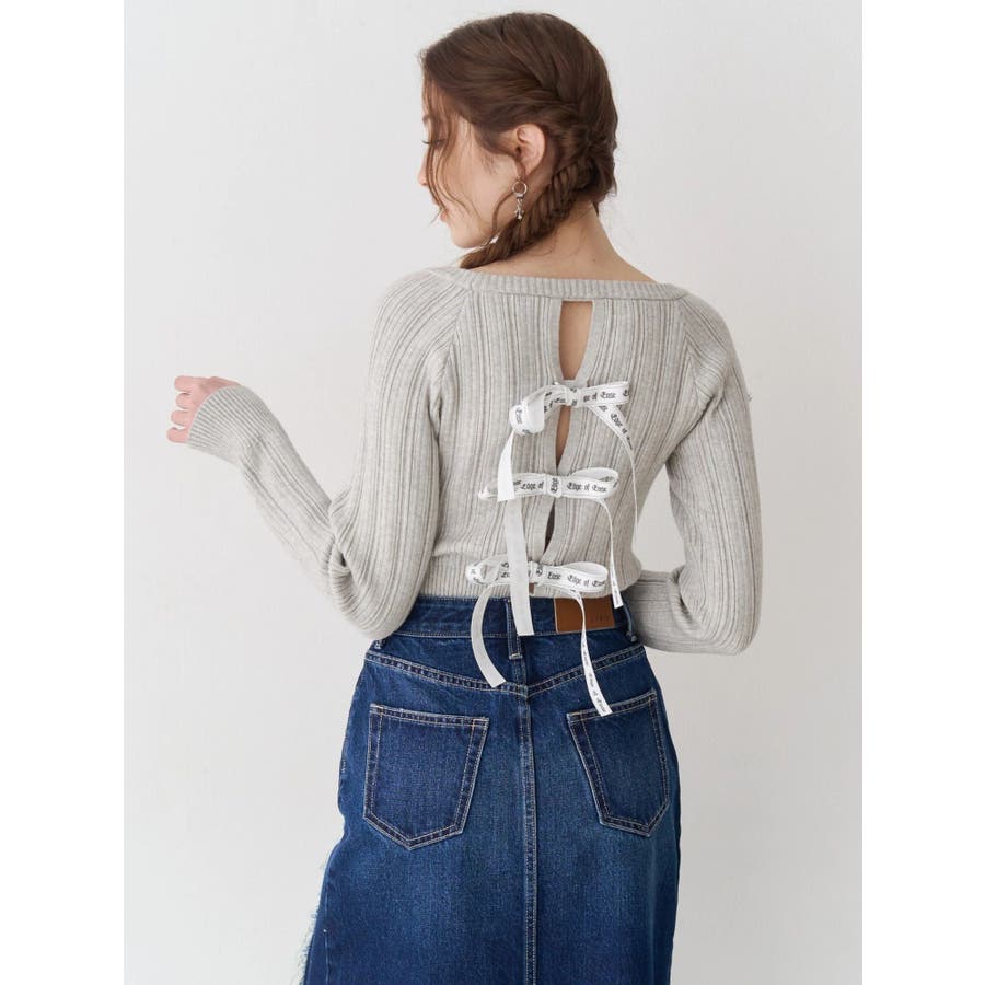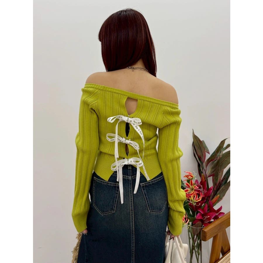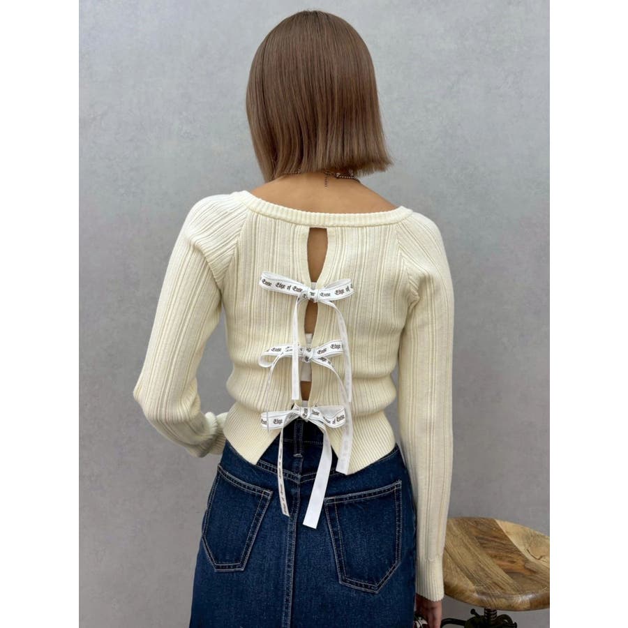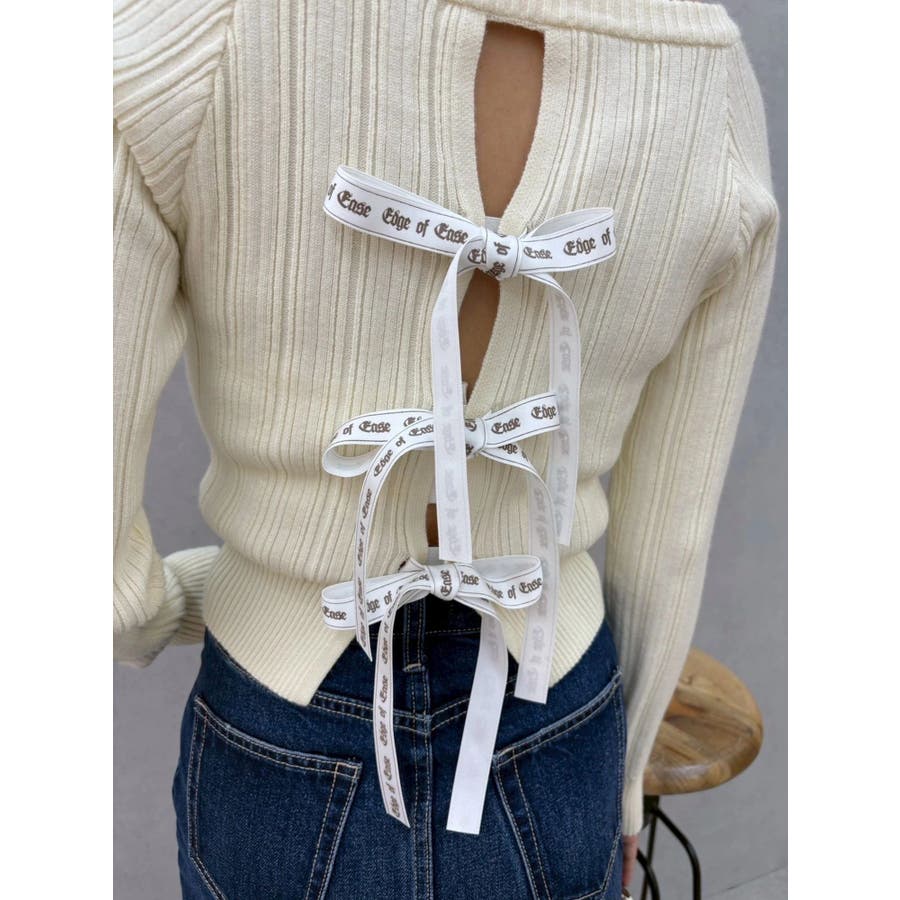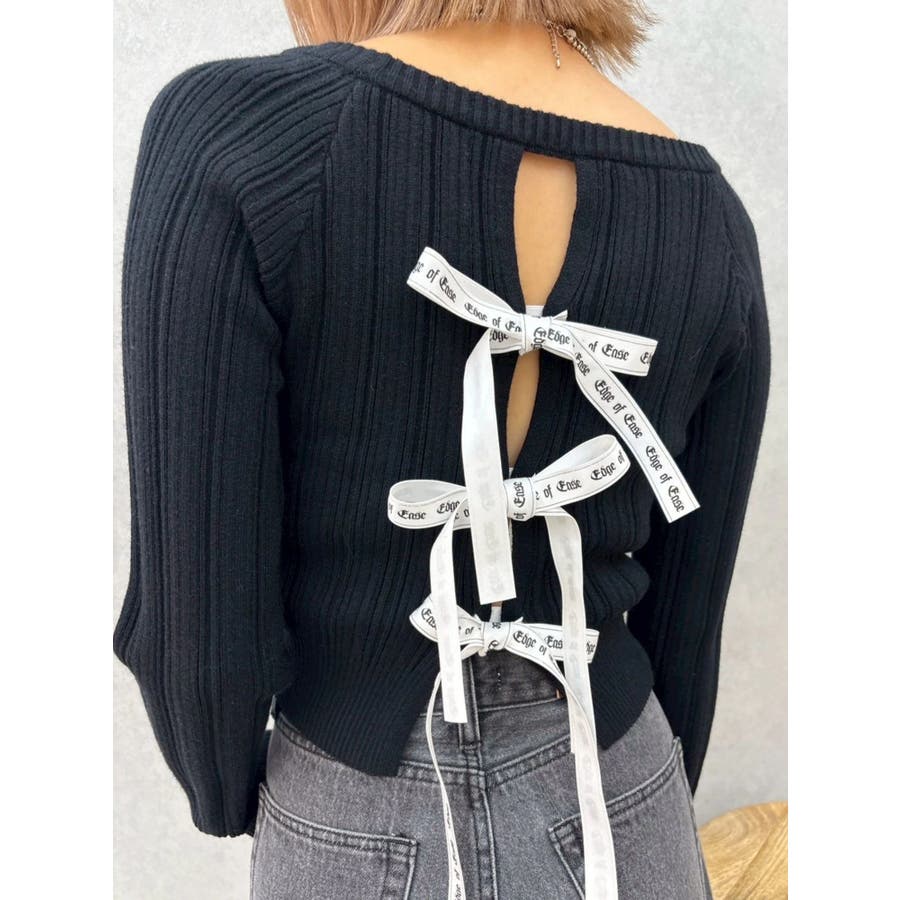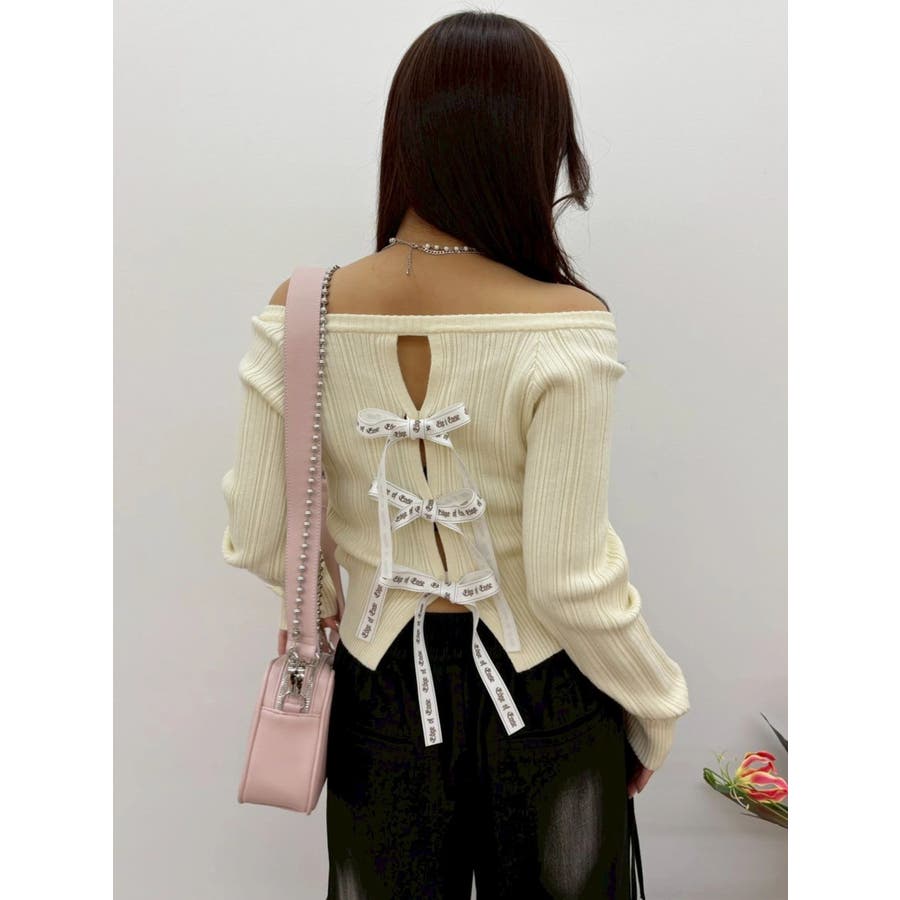■デザイン大人気のバックリボンニットのNEWバージョン!春らしいカラー展開と少し軽やかな素材になりました。 伸縮性のある素材なのでオフショルでも着用できる、2WAYデザインです。リボンのグラフィックは今季のシーズンコンセプト「Edge of Ease」をプリントしたオリジナルデザイン。■スタイリング程よい背中見せのデザインでカジュアルなボトムに合わせても女性らしいスタイリングが楽しめます。--------------透け感:なし裏地:なし生地の厚み:普通伸縮性:あり--------------